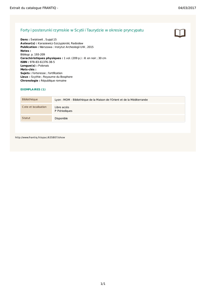 Extrait du catalogue FRANTIQ - 04/03/2017 Forty i posterunki rzymskie w Scytii i Taurydzie w okresie pryncypatu Dans : Światowit , Suppl.15 A uteur(s) : Karasiewicz-Szczypiorski, Radosław Publication : Warszawa : Instytut Archeologii UW , 2015 Notes : Bibliogr. p. 193-209 Caractéristiques physiques : 1 vol. (209 p.) : ill. en noir ; 30 cm ISBN : 978-83-61376-38-5 Langue(s) : P olonais Mots-clés : Sujets : forteresse ; fortification Lieux : Scythie ; Royaume du Bosphore Chronologie : République romaine EXEMPLA IRES (1) Bibliothèque Lyon : MOM - Bibliothèque de la Maison de l'Orient et de la Méditerranée C ote et localisation Libre accès P P ériodiques Statut Disponible http://www.frantiq.fr/opac /635807/show 1/1