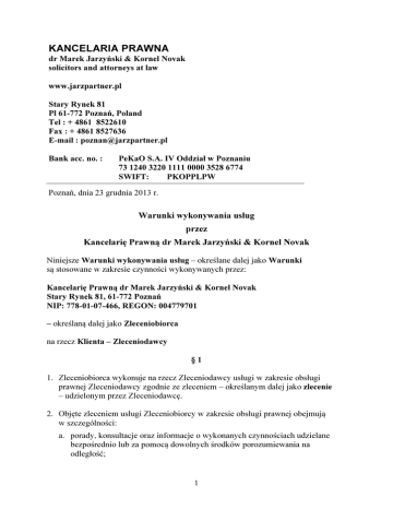 KANCELARIA PRAWNA dr Marek Jarzyński & Kornel Novak solicitors and attorneys at law www.jarzpartner.pl Stary Rynek 81 Pl 61-772 Poznań, Poland Tel : + 4861 8522610 Fax : + 4861 8527636 E-mail : [email protected] Bank acc. no. : PeKaO S.A. IV Oddział w Poznaniu 73 1240 3220 1111 0000 3528 6774 SWIFT: PKOPPLPW Poznań, dnia 23 grudnia 2013 r. Warunki wykonywania usług przez Kancelarię Prawną dr Marek Jarzyński & Kornel Novak Niniejsze Warunki wykonywania usług – określane dalej jako Warunki są stosowane w zakresie czynności wykonywanych przez: Kancelarię Prawną dr Marek Jarzyński & Kornel Novak Stary Rynek 81, 61-772 Poznań NIP: 778-01-07-466, REGON: 004779701 – określaną dalej jako Zleceniobiorca na rzecz Klienta – Zleceniodawcy §1 1. Zleceniobiorca wykonuje na rzecz Zleceniodawcy usługi w zakresie obsługi prawnej Zleceniodawcy zgodnie ze zleceniem – określanym dalej jako zlecenie – udzielonym przez Zleceniodawcę. 2. Objęte zleceniem usługi Zleceniobiorcy w zakresie obsługi prawnej obejmują w szczególności: a. porady, konsultacje oraz informacje o wykonanych czynnościach udzielane bezpośrednio lub za pomocą dowolnych środków porozumiewania na odległość; 1 b. udział w spotkaniach, naradach, negocjacjach (rokowaniach), itp.; c. zastępstwo prawne i procesowe w postępowaniach przed mediatorem, sądami powszechnymi i innymi sądami we wszystkich instancjach, w tym przed sądami administracyjnymi, Trybunałem Konstytucyjnym, sądami polubownymi (arbitrażowymi), sądami i trybunałami zagranicznymi, organami egzekucyjnymi, organami władzy i administracji państwowej, bądź samorządowej; d. reprezentowanie Zleceniodawcy wobec osób fizycznych, osób prawnych, bądź jednostek organizacyjnych nieposiadających osobowości prawnej; e. rozmowy, konsultacje i narady telefoniczne ze Zleceniodawcą, jak również innymi osobami; f. opinie prawne udzielane i sporządzane w dowolnej formie; g. tworzenie, projektowanie, opracowywanie, korektę, utrwalanie w dowolnej formie i kopiowanie: pism, umów, aktów prawnych, załączników itp.; h. korespondencję ze Zleceniodawcą i innymi osobami – przesyłaną i odbieraną przy użyciu dowolnych dostępnych środków przekazu; jak również czynności związane z doręczaniem, odbiorem, przekazywaniem, utrwalaniem w dowolnej formie i kopiowaniem korespondencji; i. badanie, analizę, utrwalanie w dowolnej formie i kopiowanie akt oraz dokumentów; j. przygotowanie pełnomocnictw; k. przygotowanie do czynności związanych ze zleceniem. 3. Jeżeli Strony nie uzgodnią inaczej zlecenie obejmuje wszystkie czynności niezbędne do jego wykonania. §2 1. Jeżeli nie uzgodniono inaczej, to wynagrodzenie Zleceniobiorcy obliczane jest według podanej przez Zleceniobiorcę stawki netto za jedną efektywną godzinę pracy, przy czym rozliczona przez Strony kwota wynagrodzenia netto będzie powiększana o należny podatek od towarów i usług VAT. 2. Wynagrodzenie Zleceniobiorcy przysługuje za czas pracy poświęcony wykonanym czynnościom, które bezpośrednio lub pośrednio są związane z przedmiotem zlecenia i podjęte zostały na rzecz Zleceniodawcy. 2 3. Wynagrodzenie Zleceniobiorcy może być rewaloryzowane w okresach półrocznych z dniem 1 stycznia lub 1 lipca roku kalendarzowego, w którym wykonywane są usługi, w zależności od wzrostu wskaźnika cen towarów i usług konsumpcyjnych publikowanego przez Główny Urząd Statystyczny Rzeczpospolitej Polskiej. 4. Wysokość wynagrodzenia ustalonego w § 2 ust. 1 nie jest zależna od kwot orzeczonych przez sądy albo inne organy władzy na rzecz Zleceniodawcy i/lub kwot zapłaconych Zleceniodawcy przez osoby trzecie, jak również nie jest zależna od wysokości jakichkolwiek innych zobowiązań Zleceniodawcy. 5. Wynagrodzenie określone w § 2 ust. 1 obejmuje koszty biurowe poniesione przez Zleceniobiorcę w związku ze Zleceniem, natomiast Zleceniodawca we własnym zakresie zobowiązany jest do ponoszenia kosztów i opłat dotyczących wykonania Zlecenia, w szczególności takich jak opłaty pocztowe o wartości przekraczającej 10,00 zł (słownie: dziesięć 00/100 złotych) miesięcznie, koszty przejazdów na odległość powyżej 50 (słownie: pięćdziesięciu) kilometrów, koszty noclegów hotelowych związanych z wykonywaniem czynności, podatek od czynności cywilnoprawnych, opłaty skarbowe i sądowe, itp. 6. Kwoty wyłożone (opłacone) za Zleceniodawcę przez Zleceniobiorcę, Zleceniodawca powinien niezwłocznie zwrócić Zleceniobiorcy, a jeżeli przepisy prawa nie będą stanowiły odmiennie, to kwoty brutto kosztów i opłat obciążających Zleceniodawcę i refakturowane przez Zleceniobiorcę – będą powiększane o podatek od towarów i usług VAT właściwy dla usług świadczonych przez Zleceniobiorcę. §3 1. Zleceniodawca zobowiązuje się udzielić Zleceniobiorcy wszelkich pełnomocnictw niezbędnych do należytego wykonania Zlecenia. 2. Zleceniodawca zobowiązany jest do dostarczenia Zleceniobiorcy dokumentów i informacji niezbędnych do należytego wykonania Zlecenia. §4 1. Strony zgodnie ustalają, że rozliczenie czynności podejmowanych przez Zleceniobiorcę w wykonaniu Zlecenia następować będzie miesięcznie albo za okresy dłuższe, bądź krótsze – w zależności od uznania Zleceniobiorcy. 3 2. Podstawą rozliczeń są sporządzone przez Zleceniobiorcę zestawienia wykonanych czynności oraz czasu ich wykonania lub czasu, który był poświęcony na to, aby czynność została wykonana. 3. Jedna godzina efektywna, wskazana w § 2 ust. 1 niniejszych Warunków, stanowi czasową jednostkę rozliczeniową rozumianą jako akceptowany przez Zleceniodawcę rzeczywisty nakład pracy Zleceniobiorcy poświęcony wykonaniu Zlecenia, przy czym każdy rozpoczęty kwadrans (15 minut efektywnych = 0,25 godz. efektywnej) czasu pracy liczony jest jako pełny. 4. Strony ustalają, iż Zleceniobiorca może wystawiać dla Zleceniodawcy fakt