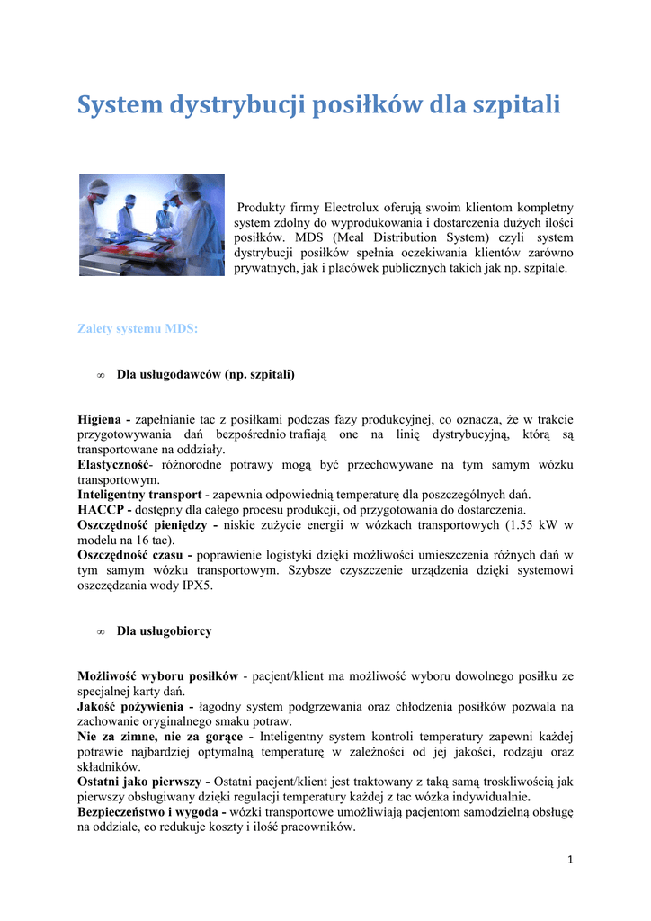 System dystrybucji posiłków dla szpitali Produkty firmy Electrolux oferują swoim klientom kompletny system zdolny do wyprodukowania i dostarczenia duŜych ilości posiłków. MDS (Meal Distribution System) czyli system dystrybucji posiłków spełnia oczekiwania klientów zarówno prywatnych, jak i placówek publicznych takich jak np. szpitale. Zalety systemu MDS: • Dla usługodawców (np. szpitali) Higiena - zapełnianie tac z posiłkami podczas fazy produkcyjnej, co oznacza, Ŝe w trakcie przygotowywania dań bezpośrednio trafiają one na linię dystrybucyjną, którą są transportowane na oddziały. Elastyczność- róŜnorodne potrawy mogą być przechowywane na tym samym wózku transportowym. Inteligentny transport - zapewnia odpowiednią temperaturę dla poszczególnych dań. HACCP - dostępny dla całego procesu produkcji, od przygotowania do dostarczenia. Oszczędność pieniędzy - niskie zuŜycie energii w wózkach transportowych (1.55 kW w modelu na 16 tac). Oszczędność czasu - poprawienie logistyki dzięki moŜliwości umieszczenia róŜnych dań w tym samym wózku transportowym. Szybsze czyszczenie urządzenia dzięki systemowi oszczędzania wody IPX5. • Dla usługobiorcy MoŜliwość wyboru posiłków - pacjent/klient ma moŜliwość wyboru dowolnego posiłku ze specjalnej karty dań. Jakość poŜywienia - łagodny system podgrzewania oraz chłodzenia posiłków pozwala na zachowanie oryginalnego smaku potraw. Nie za zimne, nie za gorące - Inteligentny system kontroli temperatury zapewni kaŜdej potrawie najbardziej optymalną temperaturę w zaleŜności od jej jakości, rodzaju oraz składników. Ostatni jako pierwszy - Ostatni pacjent/klient jest traktowany z taką samą troskliwością jak pierwszy obsługiwany dzięki regulacji temperatury kaŜdej z tac wózka indywidualnie. Bezpieczeństwo i wygoda - wózki transportowe umoŜliwiają pacjentom samodzielną obsługę na oddziale, co redukuje koszty i ilość pracowników. 1 Dystrybucja gorących i zimnych dań. System polegający na przygotowaniu, ugotowaniu i natychmiastowemu dostarczeniu posiłku. Temperatura jest dostosowana oraz podtrzymywana podczas całego procesu transportowego. Transport posiłków jest najistotniejszym, punktem podczas całego cyklu przygotowania i dystrybucji dań. Innowacyjny system Electroluxa gwarantuje nieustające i automatyczne dostosowanie się temperatury wewnątrz wózka transportowego do kaŜdej potrawy. Jest to moŜliwe dzięki wewnętrznie zamontowanej baterii która umoŜliwia zarówno podgrzewanie, jak i chłodzenie potraw podczas transportu. Dzięki systemowi MDS (co obrazuje niebieska linia na powyŜszym wykresie) nawet gdy wózek transportowy jest nie podłączony do źródła zasilania, temperatura jest kontrolowana podczas fazy transportu. W odróŜnieniu od tradycyjnych metod kiedy to potrawy są podgrzewane jedynie bezpośrednio przed transportem., co powoduje spadek temperatury dań (patrz :Ŝółta linia na wykresie) Transport ciepłych oraz zimnych potraw Transport - Podczas gdy wózek transportowy jest podłączony do sieci, a tace są załadowane, kaŜde danie jest utrzymywane w odpowiedniej temperaturze. Dzięki zainstalowanej w urządzeniu baterii, utrzymują tą temperaturę podczas transportu przez ponad 40 minut (60 minut z opcjonalną baterią). Dystrybucja - Tace z posiłkami utrzymują odpowiednią temperaturę do czasu ich dystrybucji. Otwierani drzwi nie wpływa na utratę temperatury i stygnięcie potraw, czemu zawdzięczamy fakt, Ŝe osoba nieobecna w fazie dostarczania posiłków, nadal otrzyma ciepłe i pełnowartościowe danie. Weryfikacja dostawy posiłków - temperatura potraw moŜe zostać zapamiętana przez urządzenie, co daje równieŜ moŜliwość weryfikacji temperatury i zapisanie tej zmiany w systemie komputera. Szybkie i proste czyszczenie - wewnętrzna komora urządzenia posiada zaokrąglone rogi oraz gładką powierzchnię, dzięki czemu bardzo łatwym jest utrzymanie go w czystości. po otworzeniu, drzwi moŜna je w prosty i szybki sposób poddać procesowi mycia poprzez uŜycie wody pod ciśnieniem, bez usuwania wewnętrznych półek. Ergonomia - Kompaktowe wymiary (jedynie 148 cm wysokości), mała waga produktu i optymalne połoŜenia kółek pozwalają na szybki i łatwy dostęp do urządzenia. Urządzenie wyposaŜone jest w wciągany przewód zasilający. Posiada równieŜ duŜą przestrzeń w górnej części urządzenia na dodatkowe przedmioty. 2 PoniŜej przedstawiamy kilka modeli urządzeń do dystrybucji posiłków w szpitalach. Wózek grzewczy z bemarem W ofercie dostępne są modele 2 i 3GN. Wykonane są ze stali nierdzewnej oraz posiadają bardzo wytrzymałą obudowę. WyposaŜone są równieŜ wygodne i bezpieczne uchwyty i ergonomiczne gałki . Urządzenie posiada takŜe elementy grzewcze o wysokiej wydajności. Wózek z ogrzewaną platformą Wózki z ogrzewaną platformą są najbardziej odpowiednie dla talerzy i pojemników o wymiarach 550x550mm. . Wykonane są ze stali nierdzewnej oraz posiadają bardzo wytrzymałą obudowę. Urządzenie wyposaŜone jest w samopoziomującą, demontowaną platformę, która umieszczona jest na łoŜyskach kulkowych. WyposaŜone są równieŜ wygodne i bezpieczne uchwyty i ergonomiczne gałki. Urządzenie posiada wentylowany system grzewczy oraz zintegrowaną pokrywę. Wózek z wanną chłodniczą W ofercie dostępne są modele 2 i 3GN ( w opcji z wentylowaną wanną chłodniczą +2+8°C na głębokości 210m). Wykonane są ze stali nierdzewnej oraz posiadają bardzo wytrzymałą obudowę. WyposaŜone są równieŜ wygodne i bezpieczne uchwyty i ergonomiczne gałki. Urządzenie posiada równieŜ cyfrowy wyświetlacz temperatury i samo odmraŜania i system automatycznego odparowywania wody. Łatwy dostęp do czyszczenia odpływu oraz wanny. Taśma przenośna Taśma przenośna dostępna jest w 3 długościach 4, 6, 8 m. Taśma wykonana jest ze stali nierdzewnej oraz posiadają b