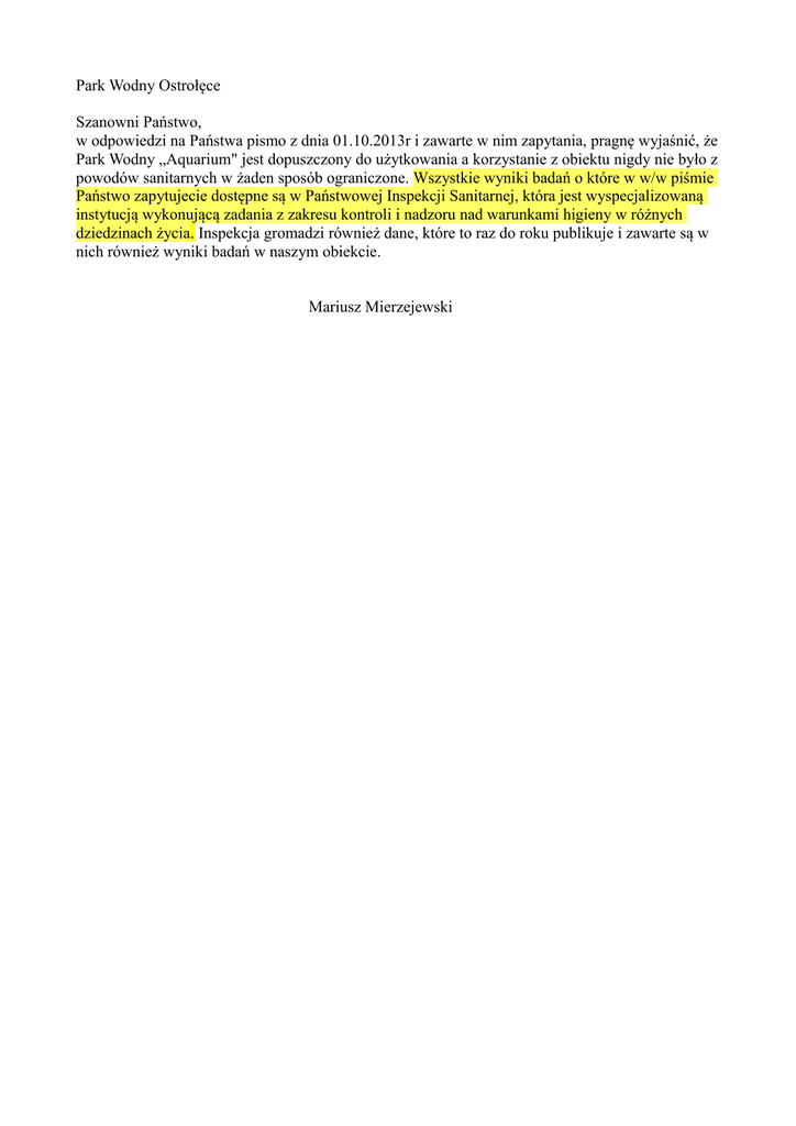 Park Wodny Ostrołęce Szanowni Państwo, w odpowiedzi na Państwa pismo z dnia 01.10.2013r i zawarte w nim zapytania, pragnę wyjaśnić, że Park Wodny „Aquarium" jest dopuszczony do użytkowania a korzystanie z obiektu nigdy nie było z powodów sanitarnych w żaden sposób ograniczone. Wszystkie wyniki badań o które w w/w piśmie Państwo zapytujecie dostępne są w Państwowej Inspekcji Sanitarnej, która jest wyspecjalizowaną instytucją wykonującą zadania z zakresu kontroli i nadzoru nad warunkami higieny w różnych dziedzinach życia. Inspekcja gromadzi również dane, które to raz do roku publikuje i zawarte są w nich również wyniki badań w naszym obiekcie. Mariusz Mierzejewski