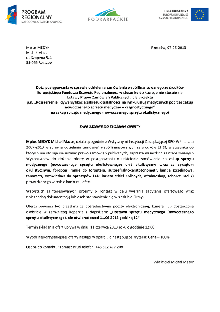 Mplus MEDYK Michał Mazur ul. Szopena 5/4 35-055 Rzeszów Rzeszów, 07-06-2013 Dot.: postępowania w sprawie udzielenia zamówienia współfinansowanego ze środków Europejskiego Funduszu Rozwoju Regionalnego, w stosunku do którego nie stosuje się Ustawy Prawo Zamówień Publicznych, dla projektu p.n. „Rozszerzenie i dywersyfikacja zakresu działalności na rynku usług medycznych poprzez zakup nowoczesnego sprzętu medyczno – diagnostycznego” na zakup sprzętu medycznego (nowoczesnego sprzętu okulistycznego) ZAPROSZENIE DO ZŁOŻENIA OFERTY Mplus MEDYK Michał Mazur, działając zgodnie z Wytycznymi Instytucji Zarządzającej RPO WP na lata 2007-2013 w sprawie udzielania zamówień współfinansowanych ze środków EFRR, w stosunku do których nie stosuje się ustawy prawo zamówień publicznych, zaprasza wszystkich zainteresowanych Wykonawców do złożenia oferty w postępowaniu o udzielenie zamówienia na zakup sprzętu medycznego (nowoczesnego sprzętu okulistycznego: unit okulistyczny wraz ze sprzętem okulistycznym, foropter, ramię do foroptera, autorefraktokeratotonometr, lampa szczelinowa, tonometr, wyświetlacz do optotypów LCD, kaseta szkieł próbnych, oftalmoskop, taboret, stolik) prowadzonego w trybie konkursu ofert. Wszystkich zainteresowanych prosimy o kontakt w celu wysłania zapytania ofertowego wraz z niezbędną dokumentacją lub osobiste stawienie się w siedzibie Firmy. Oferta powinna być przesłana za pośrednictwem poczty elektronicznej, kuriera, lub dostarczona osobiście w zamkniętej kopercie z dopiskiem: „Dostawa sprzętu medycznego (nowoczesnego sprzętu okulistycznego), nie otwierać przed 11.06.2013 godziną 12” Termin składania ofert upływa w dniu: 11 czerwca 2013 roku o godzinie 12:00 Wybór najkorzystniejszej oferty nastąpi w oparciu o następujące kryteria: Cena – 100% Osoba do kontaktu: Tomasz Brud telefon +48 512 477 208 Właściciel Michał Mazur