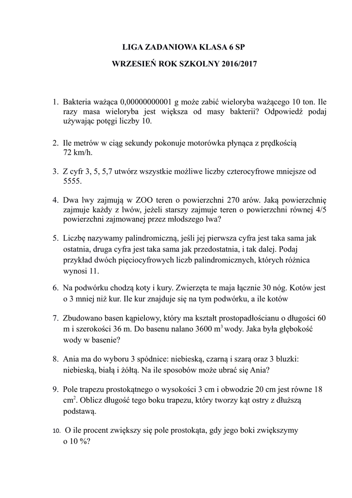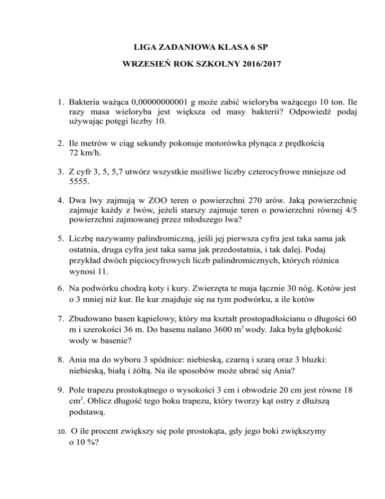 LIGA ZADANIOWA KLASA 6 SP WRZESIEŃ ROK SZKOLNY 2016/2017 1. Bakteria ważąca 0,00000000001 g może zabić wieloryba ważącego 10 ton. Ile razy masa wieloryba jest większa od masy bakterii? Odpowiedź podaj używając potęgi liczby 10. 2. Ile metrów w ciąg sekundy pokonuje motorówka płynąca z prędkością 72 km/h. 3. Z cyfr 3, 5, 5,7 utwórz wszystkie możliwe liczby czterocyfrowe mniejsze od 5555. 4. Dwa lwy zajmują w ZOO teren o powierzchni 270 arów. Jaką powierzchnię zajmuje każdy z lwów, jeżeli starszy zajmuje teren o powierzchni równej 4/5 powierzchni zajmowanej przez młodszego lwa? 5. Liczbę nazywamy palindromiczną, jeśli jej pierwsza cyfra jest taka sama jak ostatnia, druga cyfra jest taka sama jak przedostatnia, i tak dalej. Podaj przykład dwóch pięciocyfrowych liczb palindromicznych, których różnica wynosi 11. 6. Na podwórku chodzą koty i kury. Zwierzęta te maja łącznie 30 nóg. Kotów jest o 3 mniej niż kur. Ile kur znajduje się na tym podwórku, a ile kotów 7. Zbudowano basen kąpielowy, który ma kształt prostopadłościanu o długości 60 m i szerokości 36 m. Do basenu nalano 3600 m3 wody. Jaka była głębokość wody w basenie? 8. Ania ma do wyboru 3 spódnice: niebieską, czarną i szarą oraz 3 bluzki: niebieską, białą i żółtą. Na ile sposobów może ubrać się Ania? 9. Pole trapezu prostokątnego o wysokości 3 cm i obwodzie 20 cm jest równe 18 cm2. Oblicz długość tego boku trapezu, który tworzy kąt ostry z dłuższą podstawą. 10. O ile procent zwiększy się pole prostokąta, gdy jego boki zwiększymy o 10 %? 11. Tomek, Agnieszka i Adrian zebrali razem 82 stokrotki. Tomek i Agnieszka zebrali 52 stokrotki, Agnieszka i Adrian 58, a Tomek i Adrian 54. Ile stokrotek zebrało każde z dzieci? 12. Rolnik ma 10ha pola. Jaką powierzchnię na mapie w skali 1:10000 ma jego pole? Odpowiedź podaj w cm2. 13.Jak zmierzyć 7 l wody, mając do dyspozycji naczynia o pojemności 2 l i 3 l? A jak za pomocą naczyń 3- i 5-litrowych można odmierzyć 4 l wody? 14.W wyrażeniu 4 x 12 + 18 : 6 + 3 wstawić nawiasy tak, aby otrzymać: A) liczbę 50 B) liczbę najmniejszą, C) liczbę największą. 15.W skarbonce jest 112 zł w monetach dwu- i pięciozłotowych. Ile jest monet każdego rodzaju, jeśli łącznie jest ich 35? Powodzenia!