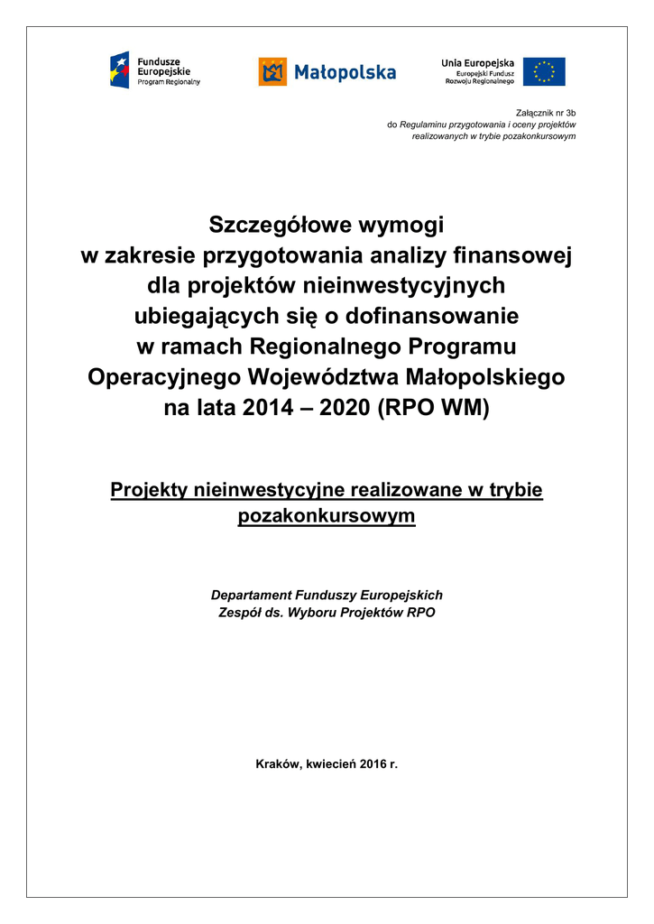 Załącznik nr 3b do Regulaminu przygotowania i oceny projektów realizowanych w trybie pozakonkursowym Szczegółowe wymogi w zakresie przygotowania analizy finansowej dla projektów nieinwestycyjnych ubiegających się o dofinansowanie w ramach Regionalnego Programu Operacyjnego Województwa Małopolskiego na lata 2014 – 2020 (RPO WM) Projekty nieinwestycyjne realizowane w trybie pozakonkursowym Departament Funduszy Europejskich Zespół ds. Wyboru Projektów RPO Kraków, kwiecień 2016 r. Spis treści WPROWADZENIE ................................................................................................................................. 3 SŁOWNIK ............................................................................................................................................... 4 I. ANALIZA ZAŁOŻEŃ FINANSOWYCH .......................................................................................... 5 II. SPOSÓB PREZENTACJI KOSZTÓW PROJEKTU ........................................................................ 5 III. PROGNOZA PRZYCHODÓW W TRAKCIE WDRAŻANIA ...................................................... 6 IV. TRWAŁOŚĆ FINANSOWA PROJEKTU .................................................................................... 7 V. ZASADY DOFINANSOWANIA PROJEKTU NIEINWESTYCYJNEGO ......................................... 8 SPIS ZAŁĄCZNIKÓW ............................................................................................................................ 9 2 WPROWADZENIE Niniejszy dokument odnosi się do projektów nieinwestycyjnych ubiegających się o dofinansowanie w ramach Osi/Działań wdrażanych przez IZ RPO WM, której zadania wykonuje Departament Funduszy Europejskich Urzędu Marszałkowskiego Województwa Małopolskiego, w szczególności w obrębie następujących Działań/Poddziałań: Poddziałanie 6.1.2 Organizacja wydarzeń kulturalnych; Poddziałanie 6.1.3 typ B: Dokumentowanie, zachowanie i upowszechnianie dziedzictwa niematerialnego; Działanie 6.2 typ C: Opracowywanie dokumentów planistycznych dla parków krajobrazowych i rezerwatów przyrody, inwentaryzacja i waloryzacja przyrodnicza gmin. W przypadku zidentyfikowania i zaproszenia do złożenia w trybie pozakonkursowym projektów w ramach powyższych Działań, należy zastosować wymogi określone w niniejszym dokumencie. W dokumencie określono wymagania Instytucji Zarządzającej Regionalnym Programem Operacyjnym Województwa Małopolskiego na lata 2014-2020 w zakresie pożądanej formy części finansowej wniosku o dofinansowanie wobec Wnioskodawców aplikujących o wsparcie w ramach RPO WM na lata 2014 – 2020. Stanowią one narzędzie niezbędne do przygotowania części obliczeniowej w załączniku Excel jak i części opisowej wymaganej w ramach e-wniosku (część M1). Niniejszy dokument stanowi uzupełnienie Regulaminu przygotowania i oceny projektów realizowanych w trybie pozakonkursowym zawierającego podstawowe informacje m.in. dotyczące możliwych typów projektu, rodzaju, poziomu ich dofinansowania oraz obowiązkowych załączników, w tym finansowych Sposób przygotowania części finansowej, podlega weryfikacji w trakcie oceny formalnej i merytorycznej projektów składanych w ramach RPO WM na lata 2014-2020. Szczegółowe wymogi zostały opracowane na podstawie aktualnych uregulowań prawnych, krajowych oraz unijnych. Dopuszczalne jest zastosowanie odmiennych rozwiązań (pod warunkiem ich uzasadnienia), jeżeli tych postulowanych w Wytycznych nie da się zastosować do danego projektu lub ich zastosowanie jest nielogiczne lub niecelowe. W przypadku braku uregulowań w danym zakresie należy skorzystać w szczególności z: 1) Rozporządzenia Parlamentu Europejskiego i Rady (UE) nr 1303/2013 z dnia 17 grudnia 2013 r, dalej Rozporządzenie nr 1303/2013; 2) Wytycznych Ministerstwa Infrastruktury i Rozwoju w zakresie kwalifikowalności wydatków w ramach Europejskiego Funduszu Rozwoju Regionalnego, Europejskiego Funduszu Społecznego oraz Funduszu Spójności na lata 2014-2020; 3) Podręcznika kwalifikowania wydatków objętych dofinansowaniem w ramach Regionalnego Programu Operacyjnego Województwa Małopolskiego na lata 2014-2020. 1 Część e-wniosku odnosząca się do części finansowej projektów. 3 SŁOWNIK Całkowity koszt projektu: suma wydatków kwalifikowalnych i niekwalifikowalnych projektu poniesionych w okresie realizacji projektu, z uwzględnieniem podatku VAT. Całkowity koszt kwalifikowalny projektu: wartość kosztów kwalifikowalnych poniesionych w okresie realizacji projektu, brana pod uwagę przy weryfikacji, czy projekt może zostać zaliczony do kategorii projektów generujących dochód w trakcie wdrażania w przypadku, gdy wartość kosztów kwalifikowanych przekracza równowartość 50 tys. euro. Okres wdrażania (projekcji finansowych) – okres, za który należy sporządzić prognozę przepływów finansowych w zakresie projektów nieinwestycyjnych. Co do zasady okres ten będzie wyznaczony okresem realizacji projektu wskazanym we wniosku aplikacyjnym. Jedynie w przypadku projektów generujących dochody (przychody) tzn. gdy będą świadczone odpłatne usługi, bądź dostarczane odpłatnie dobra (np. sprzedaż publikacji, biletów, reklama na stronie internetowej), okres ten zgodnie z art. 65 ust. 8 Rozporządzenia nr 1303/2013 kończy się w momencie złożenia przez Beneficjenta wniosku o płatność końcową. Projekt nieinwestycyjny generujący dochód – zgodnie z art. 65 ust. 8 Rozporządzenia nr 1303/2013 jeśli projekt generuje dochód w trakcie wdrażania i nie stosuje się do niego zapisów art. 61 ust. 1- 6 ww. Rozporządzenia, wówczas taki dochód wygenerowany bezpośrednio wyłącznie w trakcie wdrażania, który nie został wzięty pod uwagę przy zatwierdzaniu operacji, odejmuje się od kosztów kwalifikowalnych najpóźniej we wniosku końcowym o płatność. Niniejszy obowiązek nie dotyczy m.in. projekt