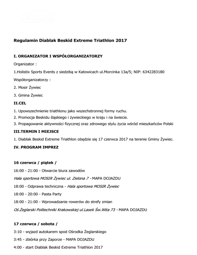Regulamin Diablak Beskid Extreme Triathlon 2017 I. ORGANIZATOR I WSPÓŁORGANIZATORZY Organizator : 1.Holistix Sports Events z siedzibą w Katowicach ul.Morcinka 13a/5; NIP: 6342283180 Współorganizatorzy : 2. Mosir Żywiec 3. Gmina Żywiec II.CEL 1. Upowszechnienie triathlonu jako wszechstronnej formy ruchu. 2. Promocja Beskidu śląskiego i żywieckiego w kraju i na świecie. 3. Propagowanie aktywności fizycznej oraz zdrowego stylu życia wśród mieszkańców Polski III.TERMIN I MIEJSCE 1. Diablak Beskid Extreme Triathlon obędzie się 17 czerwca 2017 na terenie Gminy Żywiec. IV. PROGRAM IMPREZ 16 czerwca / piątek / 16:00 21:00 Otwarcie biura zawodów Hala sportowa MOSIR Żywiec ul. Zielona 7 MAPA DOJAZDU 18:00 Odprawa techniczna Hala sportowa MOSIR Żywiec 18:00 20:00 Pasta Party 18:00 21:00 Wprowadzanie rowerów do strefy zmian Oś.Żeglarski Politechniki Krakowskiej ul.Lasek Św.Wita 73 MAPA DOJAZDU 17 czerwca / sobota / 3:10 wyjazd autokarem spod Ośrodka Żeglarskiego 3:45 zbiórka przy Zaporze MAPA DOJAZDU 4:00 start Diablak Beskid Extreme Triathlon 2017 4:45 dopłynięcie pierwszych zawodników do Ośrodka Żeglarskiego 6:00 koniec limitu czasu odcinka pływackiego 11:30 przybycie pierwszych zawodników po odcinku rowerowym Rynek, Żywiec MAPA 13:00 14:00 Bieg Diablaczka zawody dla dzieci 15:30 koniec limitu czasu pływanie+rower 17:30 przewidywany czas przybycia pierwszego Diablaka na szczyt Babiej Góry 21:30 limitu czasu wejścia na Diablaka 18 czerwca / niedziela / 10:00 wyjazd autokaru do Żywca spod wejścia parkingu na Przełęczy Krowiarki 11:00 12:00 odbiór rowerów z Hali Sportowej Mosir w Żywcu 12:00 uroczysta dekoracja zawodników na rynku w Żywcu 12:30 już czekamy na Diablaka 2018 :) V. DYSTANS I TRASA 1. Diablak Beskid Extreme Triathlon odbędzie się na dystansie : a) Pływanie – 3,8 km w Jeziorze Żywieckim / Zapora – Plaża Miejska Żywiec / b) Rower – 180 km – dwie pętle po 90 km / Żywiec, Lipowa, Buczkowice, Szczyrk,Wisła, Istebna, Koniaków,Węgierska Górka,Żywiec / . c) Bieg górski – 44km / Żywiec – Babia Góra / 2. Pływanie na dystansie określonym wcześniej w komunikacie. Spodziewana temperatura wody ok. 1822°C. Start z brzegu lub z wody. Pianki dozwolone. 3. Część rowerowa w konwencji non drafting . Dozwolone tylko rowery szosowe każdego rodzaju. Trasa rowerowa odbędzie się przy otwartym ruchu drogowym. 4. Zawodnicy muszą dostosować się do Zasad Ruchu Drogowego. Każdy zawodnik musi posiadać kask ochronny. 5. Bieg – Trasa przebiega z Rynku w Żywcu na szczyt Babiej Góry. W większości poprowadzona szlakiem. Pierwsze 22 km odcinki asfaltowe. Zawodnik jest zobowiązany do zapoznanie się z trasą. Zawodnicy będą mieli możliwość załadowania śladu GPS. Trasa będzie oznakowana w najbardziej newralgicznych punktach. Pomiar trasy GPS. 6. Zawodnik na trasę biegową zobowiązany jest być wyposażony w / Sprzęt będzie weryfikowany w biurze zawodów podczas odbioru pakietu startowego / : a) Plecak lub nerkę biegową b) Pojemnik na wodę min. 1 litr c) Telefon komórkowy (z roamingiem) z kontaktem ICE !!! d) Dowód osobisty e) Folia NRC f) Czapkę lub chusta typu buff g) Rękawiczki h) Kurtkę wiatrochronną z długim rękawem i) Gwizdek j) Numer startowy / dostarcza BET / k) Mapa trasy / dostarcza BET / l) Nadajnik GPS 7. Limit czasu ukończenia zawodów – 17,5 godzin 8. Limity czasowe dla poszczególnych dystansów : pływanie – 120 minut pływanie + rower – 11 h 30 min pływanie + rower + bieg – 17 h 30 min 9. Limit dodatkowy w punkcie kontrolnym w Korbielowie godzina 17:30. 10. Punkt kontrolny złożony z ratowników GOPR na Żywieckich Rozstajach będzie weryfikował stan zawodnika i będzie miał możliwość zabronienia kontynuowania zawodów jeśli uznają, że kontynuowanie zagraża zdrowiu bądź życiu zawodnika. Zawodnicy, którzy zjawią się po godzinie 20:30 będą skierowani przez ratowników GOPR szlakiem do Schroniska na Markowych Szczawinach. 11. Dopuszczona jest pomoc techniczna podczas odcinków rowerowych jak i biegowych. 12. Dopuszczalne jest pokonanie trasy biegowej z osobą towarzyszącą. VI. BIURO ZAWODÓW 1. Biuro zawodów będzie mieściło się w wyznaczonych wcześniej miejscach zgodnie z komunikatem na stronie organizatora. 2. Biuro zawodów będzie czynne przeddzień zawodów w godz. 16:00 – 21:00. 3. W skład pakietu startowego wchodzi : Czepek Diablak Beskid Extreme Triathlon Numer startowy do zamocowania na pasku startowym na etap rowerowy i biegowy 4 naklejki do zamocowania na kask, ramę roweru, pod siodełko i plecak Koszulkę Diablak Beskid Extreme Triathlon 2017 Oryginalny ekstremalny plecak z nieprzemakalnego materiału z logo Diablak Beskid Extreme Triathlon Chip do pomiaru czasu Tracker GPS do lokalizacji zawodnika Komplet suplementów Materiały promocyjne od sponsorów imprezy Kupon na Pasta Party Kupon na kolację w Schronisku lub w jednym z wybranych hoteli. Mapa trasy biegowej. 4 worki depozytowe na pozostawienia na Start, T1,T2, Schronisko na Markowych Szczawinach lub inne wybrane miejsce. Bezpłatny przejazd autokarem z Ośrodka Żeglarskiego na miejsce startu. Bezpłatny przejazd autokarem z Przełęczy Krowiarki na rynek w Żywcu w dniu 20 czerwca o 10:00. Wstęp na teren Babiogórskiego Parku Narodowego będzie dodatkowo płatny w dniu odbioru pakietu. Kwota zostanie podana po potwierdzeniu przez Babiogórski Park Narodowy. Kwota może wynieść nawet 100 zł. Pogromcy Diablaka otrzymają : Koszulkę pogromcy Diablaka Pamiątkowy medal / łańcuch poskromienia Diablaka VII. PUNKTY ODŚWIEŻANIA 1. W dwóch punktach odświeżania na trasie rowerowej i na bufecie na trasie biegowej dostępna będzie woda mineralna niegazowana, izotonik, coca cola, rodzynki, banany, arbuz, czekolada, sól, 2. Dwa bufety na szlakach górskich będą zaopatrzone w wodę 1l / osobę, ograniczoną ilość izotonika 1l/ osobę i żeli energetycznych 1 szt. / osobę, czeko
