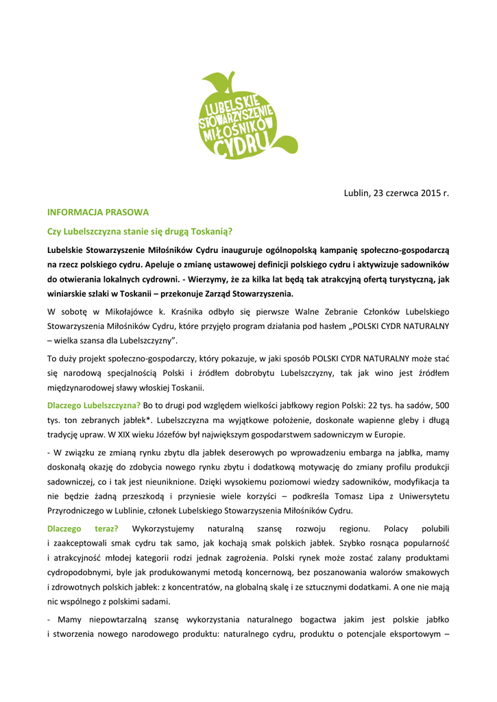 Lublin, 23 czerwca 2015 r. INFORMACJA PRASOWA Czy Lubelszczyzna stanie się drugą Toskanią? Lubelskie Stowarzyszenie Miłośników Cydru inauguruje ogólnopolską kampanię społeczno-gospodarczą na rzecz polskiego cydru. Apeluje o zmianę ustawowej definicji polskiego cydru i aktywizuje sadowników do otwierania lokalnych cydrowni. - Wierzymy, że za kilka lat będą tak atrakcyjną ofertą turystyczną, jak winiarskie szlaki w Toskanii – przekonuje Zarząd Stowarzyszenia. W sobotę w Mikołajówce k. Kraśnika odbyło się pierwsze Walne Zebranie Członków Lubelskiego Stowarzyszenia Miłośników Cydru, które przyjęło program działania pod hasłem „POLSKI CYDR NATURALNY – wielka szansa dla Lubelszczyzny”. To duży projekt społeczno-gospodarczy, który pokazuje, w jaki sposób POLSKI CYDR NATURALNY może stać się narodową specjalnością Polski i źródłem dobrobytu Lubelszczyzny, tak jak wino jest źródłem międzynarodowej sławy włoskiej Toskanii. Dlaczego Lubelszczyzna? Bo to drugi pod względem wielkości jabłkowy region Polski: 22 tys. ha sadów, 500 tys. ton zebranych jabłek*. Lubelszczyzna ma wyjątkowe położenie, doskonałe wapienne gleby i długą tradycję upraw. W XIX wieku Józefów był największym gospodarstwem sadowniczym w Europie. - W związku ze zmianą rynku zbytu dla jabłek deserowych po wprowadzeniu embarga na jabłka, mamy doskonałą okazję do zdobycia nowego rynku zbytu i dodatkową motywację do zmiany profilu produkcji sadowniczej, co i tak jest nieuniknione. Dzięki wysokiemu poziomowi wiedzy sadowników, modyfikacja ta nie będzie żadną przeszkodą i przyniesie wiele korzyści – podkreśla Tomasz Lipa z Uniwersytetu Przyrodniczego w Lublinie, członek Lubelskiego Stowarzyszenia Miłośników Cydru. Dlaczego teraz? Wykorzystujemy naturalną szansę rozwoju regionu. Polacy polubili i zaakceptowali smak cydru tak samo, jak kochają smak polskich jabłek. Szybko rosnąca popularność i atrakcyjność młodej kategorii rodzi jednak zagrożenia. Polski rynek może zostać zalany produktami cydropodobnymi, byle jak produkowanymi metodą koncernową, bez poszanowania walorów smakowych i zdrowotnych polskich jabłek: z koncentratów, na globalną skalę i ze sztucznymi dodatkami. A one nie mają nic wspólnego z polskimi sadami. - Mamy niepowtarzalną szansę wykorzystania naturalnego bogactwa jakim jest polskie jabłko i stworzenia nowego narodowego produktu: naturalnego cydru, produktu o potencjale eksportowym – podkreśla Tomasz Solis, Wiceprezes Lubelskiego Stowarzyszenia Miłośników Cydru i Związku Sadowników RP. O co walczymy? O jakość i czystość polskiego cydru. O to, żeby naprawdę był produkowany tylko z jabłek. Chcemy uniknąć sytuacji, gdy syrop malinowy ma tylko 5% malin, bo produkujący go koncern chce minimalizować koszty i maksymalizować zyski. Produkty cydropodobne też mają niewiele wspólnego z jabłkami. Są laboratoryjne, sztuczne i mają ujednolicony smak – wyjaśnia Tomasz Solis. - Dobrego cydru nie da się zrobić ani z koncentratu ani ze słabych jabłek. Dlatego Stowarzyszenie będzie apelować o ustawową zmianę definicji i ochronę cydru – wprowadzenie zapisu o produkcji cydru tylko ze świeżego soku jabłkowego (dzisiaj przepisy dopuszczają produkcję z koncentratów, czyli zgadzają się na rozwadnianie i sztuczne aromatyzowanie). Równie ważne jest uproszczenie przepisów zezwalających sadownikom na wytwarzanie rzemieślniczych cydrów. Dzięki ułatwieniom produkcyjnym, dotacjom na inwestycje, to oni staną na straży jakości i różnorodności, niczym europejscy winiarze. Będą też rozwijać całą kategorię, poszukując innowacji, eksperymentując z gatunkami jabłek czy sposobem ich uprawy. Według Stowarzyszenia najlepszym rozwiązaniem będzie stworzenie oddzielnej ustawy o cydrze, na wzór europejskich zapisów o winach, które zezwalają na produkcję wina wyłącznie ze świeżego moszczu z winogron bez żadnych dodatków, wiążą produkcję z uprawą rolną i uniemożliwiają industrializację całego procesu. Co możemy zyskać? • nowy duży kanał zbytu i lokalnego zagospodarowania lubelskich jabłek • nowy eksportowy potencjał wzrostu dla regionu • wzrost cen lubelskich jabłek i skuteczny oręż w walce z wahaniami cen surowca • dynamiczny rozwój turystyki sadowniczo-cydrowej • nowe źródła dochodu • nowe miejsca pracy i atrakcyjną propozycję dla młodych ludzi • prestiż Lubelszczyzny jako regionu, który potrafi wykorzystać swoją szansę - Odwołujemy się do tradycji winiarstwa. Chcemy budować na Lubelszczyźnie kulturę cydrową na wzór Toskanii, która w ciągu kilkunastu lat zbudowała swoją winiarską potęgę na jakości i kategorycznym przywiązaniu produkcji wina do upraw – deklaruje Tomasz Solis. - Mając takie bogactwo odmian jabłek i tak doskonałe warunki glebowe czy klimatyczne, mamy pełnię praw do walki o ustawową ochronę kategorii polskich cydrów naturalnych, robionych tylko ze świeżego soku. Do kogo i jak mówimy? Szansa stojąca przed polskim rolnictwem i przed Lubelszczyzną wpisuje się w trend zdrowej żywności, ekologii i życia w zgodzie z naturą. To również propozycja dla młodych ludzi, którzy zastanawiają się nad ucieczką z terenów wiejskich w poszukiwaniu pracy czy nowych wyzwań. - Działamy na rzecz sadowników i regionu, ale to społeczne poparcie zadecyduje o naszym sukcesie. Dlatego stworzyliśmy nowoczesną platformę ZACYDROWANI.PL, wokół której chcemy zmobilizować tysiące ludzi z całej Polski – zapowiada Stowarzyszenie. ZACYDROWANI.PL to internetowa platforma, która w nowoczesny, zaskakujący i zabawny sposób pozwala wyrazić oddolne poparcie dla idei polskiego cydru naturalnego poprzez stworzenie – na swoje podobieństwo – własnej, spersonalizowanej postaci Cydrofana – zielonego jabłka, któremu można dodać indywidualne atrybuty (np. fryzurę, ubranie, dodatk