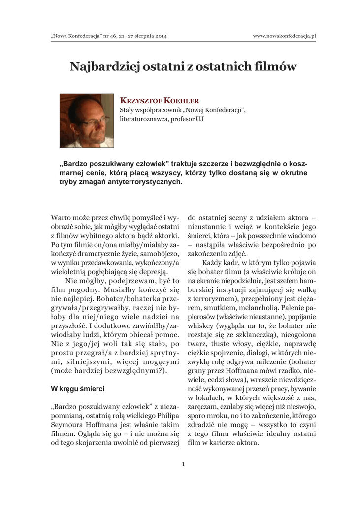„Nowa Konfederacja” nr 46, 21–27 sierpnia 2014 www.nowakonfederacja.pl Najbardziej ostatni z ostatnich filmów Krzysztof Koehler Stały współpracownik „Nowej Konfederacji”, literaturoznawca, profesor UJ „Bardzo poszukiwany człowiek” traktuje szczerze i bezwzględnie o koszmarnej cenie, którą płacą wszyscy, którzy tylko dostaną się w okrutne tryby zmagań antyterrorystycznych. Warto może przez chwilę pomyśleć i wyobrazić sobie, jak mógłby wyglądać ostatni z filmów wybitnego aktora bądź aktorki. Po tym filmie on/ona miałby/miałaby zakończyć dramatycznie życie, samobójczo, w wyniku przedawkowania, wykończony/a wieloletnią pogłębiającą się depresją. Nie mógłby, podejrzewam, być to film pogodny. Musiałby kończyć się nie najlepiej. Bohater/bohaterka przegrywała/przegrywałby, raczej nie byłoby dla niej/niego wiele nadziei na przyszłość. I dodatkowo zawiódłby/zawiodłaby ludzi, którym obiecał pomoc. Nie z jego/jej woli tak się stało, po prostu przegrał/a z bardziej sprytnymi, silniejszymi, więcej mogącymi (może bardziej bezwzględnymi?). do ostatniej sceny z udziałem aktora – nieustannie i wciąż w kontekście jego śmierci, która – jak powszechnie wiadomo – nastąpiła właściwie bezpośrednio po zakończeniu zdjęć. Każdy kadr, w którym tylko pojawia się bohater filmu (a właściwie króluje on na ekranie niepodzielnie, jest szefem hamburskiej instytucji zajmującej się walką z terroryzmem), przepełniony jest ciężarem, smutkiem, melancholią. Palenie papierosów (właściwie nieustanne), popijanie whiskey (wygląda na to, że bohater nie rozstaje się ze szklaneczką), nieogolona twarz, tłuste włosy, ciężkie, naprawdę ciężkie spojrzenie, dialogi, w których niezwykłą rolę odgrywa milczenie (bohater grany przez Hoffmana mówi rzadko, niewiele, cedzi słowa), wreszcie niewdzięczność wykonywanej przezeń pracy, bywanie w lokalach, w których większość z nas, zaręczam, czułaby się więcej niż nieswojo, sporo mroku, no i to zakończenie, którego zdradzić nie mogę – wszystko to czyni z tego filmu właściwie idealny ostatni film w karierze aktora. W kręgu śmierci „Bardzo poszukiwany człowiek” z niezapomnianą, ostatnią rolą wielkiego Philipa Seymoura Hoffmana jest właśnie takim filmem. Ogląda się go – i nie można się od tego skojarzenia uwolnić od pierwszej 1 „Nowa Konfederacja” nr 46, 21–27 sierpnia 2014 www.nowakonfederacja.pl Film Antona Corbijna nie jest oczywiście opowieścią o ostatnich dniach życia Hoffmana. Narracja filmowa dotyczy wciąż toczącej się na świecie wojny z terroryzmem. Traktuje, wydaje mi się, szczerze i bezwzględnie, o koszmarnej cenie, jaką płacą wszyscy, którzy tylko dostaną się w okrutne tryby zmagań antyterrorystycznych. Zagrożenie jest zbyt duże, by można było sobie zostawiać miejsce na jakąkolwiek pobłażliwość. Lepiej popełnić błąd, niż doprowadzić do zbiorowej tragedii. Corbijn, dzięki genialnej roli Hoffmana, opowiada jednak tak samo o cenie ludzkiej, jaką się płaci za tego typu policyjny, wszak konieczny, ale wyniszczający wysiłek. Dzieci zdradzające rodziców, kobiety zdradzające mężczyzn i ci, którzy niejako biorą na siebie ciężar ludzkiej, osobistej tragedii, korzystając z niej, by choć o jeden krok znaleźć się przed bezwzględnymi terrorystami. cały czas trwania filmu niesie na swych barkach aktor, który w każdej scenie jest żywym dowodem na to, jak wielka idzie za tego typu działaniem destrukcja. Każdy kadr, w którym tylko pojawia się bohater filmu, przepełniony jest ciężarem, smutkiem, melancholią Oglądanie go w „Bardzo poszukiwanym człowieku” boli. Zdaję sobie sprawę, jak dziwnie to brzmi, ale inaczej doświadczenia obcowania z rolą Hoffmana nazwać nie potrafię. Boli jak boli obcowanie z czyimś życiem, które toczy się na granicy ostatecznego obsunięcia się w rozpacz, rezygnacji, wycofania się. Czy ciężko chory Philip Seymour Hoffman zagrał tu siebie? Czy genialny aktor tak doskonale wcielił się w rolę, że autentyczność granej przezeń postaci nie pozwala o niej zapomnieć na długo po tym, kiedy wyjdzie się z sali kinowej? Idźcie, zobaczcie i zastanówcie się. Ból niebanalny Można powiedzieć, że demoralizujący wpływ wojny na ludzkie życie to temat zgrany jak mało który. Co więcej, widzieliśmy już sporo filmów, które dotykały tego zagadnienia w kontekście wojny z terroryzmem. Ten film jest jednak niezwykły i niepowtarzalny. Głównie dlatego, że ciężar, brzemię owego zmagania się przez „Bardzo poszukiwany człowiek”, reż. Anton Corbijn 2 „Nowa Konfederacja” nr 46, 21–27 sierpnia 2014 www.nowakonfederacja.pl 3