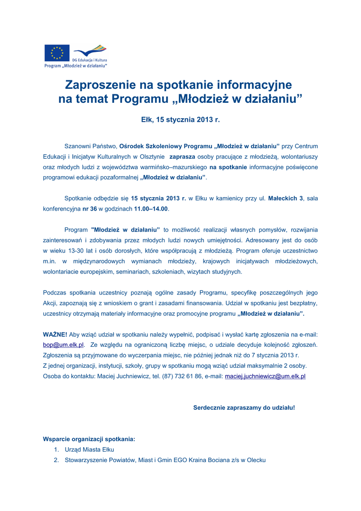 Zaproszenie na spotkanie informacyjne na temat Programu „Młodzież w działaniu” Ełk, 15 stycznia 2013 r. Szanowni Państwo, Ośrodek Szkoleniowy Programu „Młodzież w działaniu” przy Centrum Edukacji i Inicjatyw Kulturalnych w Olsztynie zaprasza osoby pracujące z młodzieżą, wolontariuszy oraz młodych ludzi z województwa warmińsko–mazurskiego na spotkanie informacyjne poświęcone programowi edukacji pozaformalnej „Młodzież w działaniu”. Spotkanie odbędzie się 15 stycznia 2013 r. w Ełku w kamienicy przy ul. Małeckich 3, sala konferencyjna nr 36 w godzinach 11.00–14.00. Program "Młodzież w działaniu” to możliwość realizacji własnych pomysłów, rozwijania zainteresowań i zdobywania przez młodych ludzi nowych umiejętności. Adresowany jest do osób w wieku 13-30 lat i osób dorosłych, które współpracują z młodzieżą. Program oferuje uczestnictwo m.in. w międzynarodowych wymianach młodzieży, krajowych inicjatywach młodzieżowych, wolontariacie europejskim, seminariach, szkoleniach, wizytach studyjnych. Podczas spotkania uczestnicy poznają ogólne zasady Programu, specyfikę poszczególnych jego Akcji, zapoznają się z wnioskiem o grant i zasadami finansowania. Udział w spotkaniu jest bezpłatny, uczestnicy otrzymają materiały informacyjne oraz promocyjne programu „Młodzież w działaniu”. WAŻNE! Aby wziąć udział w spotkaniu należy wypełnić, podpisać i wysłać kartę zgłoszenia na e-mail: [email protected]. Ze względu na ograniczoną liczbę miejsc, o udziale decyduje kolejność zgłoszeń. Zgłoszenia są przyjmowane do wyczerpania miejsc, nie później jednak niż do 7 stycznia 2013 r. Z jednej organizacji, instytucji, szkoły, grupy w spotkaniu mogą wziąć udział maksymalnie 2 osoby. Osoba do kontaktu: Maciej Juchniewicz, tel. (87) 732 61 86, e-mail: [email protected] Serdecznie zapraszamy do udziału! Wsparcie organizacji spotkania: 1. Urząd Miasta Ełku 2. Stowarzyszenie Powiatów, Miast i Gmin EGO Kraina Bociana z/s w Olecku