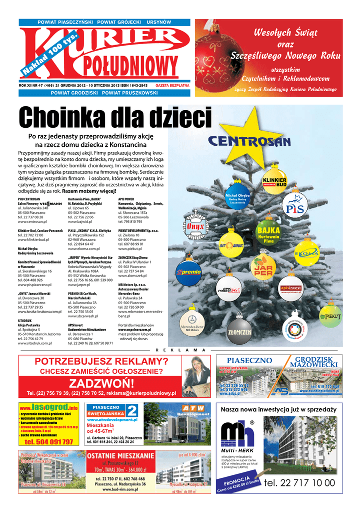 POWIAT PIASECZYŃSKI POWIAT GRÓJECKI URSYNÓW ROK XII NR 47 (466) 21 GRUDNIA 2012 - 10 STYCZNIA 2013 ISSN 1643-2843 POWIAT GRODZISKI GAZETA BEZPŁATNA POWIAT PRUSZKOWSKI Choinka dla dzieci Po raz jedenasty przeprowadziliśmy akcję na rzecz domu dziecka z Konstancina Przypomnijmy zasady naszej akcji. Firmy przekazują dowolną kwotę bezpośrednio na konto domu dziecka, my umieszczamy ich loga w graficznym kształcie bombki choinkowej. Im większa darowizna tym wyższa gałązka przeznaczona na firmową bombkę. Serdecznie dziękujemy wszystkim firmom i osobom, które wsparły naszą inicjatywę. Już dziś pragniemy zaprosić do uczestnictwa w akcji, która odbędzie się za rok. Razem możemy więcej! PHU CENTROSAN Salon Firmowy ul. Julianowska 24B 05-500 Piaseczno tel. 22 737 08 28 www.centrosan.pl Hurtownia Piwa „BAJKA” M. Rotnicka, D. Przybylski ul. Lipowa 65 05-502 Piaseczno tel. 22 756 22 06 www.bajwid.pl APIS POWER Hamownia, Chiptuning, Serwis, Wulkanizacja, Myjnia ul. Słoneczna 157a 05-506 Lesznowola tel. 795 810 795 Klinkier-Bud, Czesław Penconek tel. 22 702 72 00 www.klinkierbud.pl P.H.U. „EKOMA” K.H.A. Kiełtyka ul. Przyczółkowska 152 02-968 Warszawa tel. 22 894 64 47 www.ekoma.com.pl PIEKUT DEVELOPMENT Sp. z o.o. ul. Zielona 10 05-500 Piaseczno tel. 607 88 99 01 www.piekut.pl „JARPER” Wywóz Nieczystości Stałych i Płynnych, Jarosław Perzyna Kolonia Warszawska k/Wygody Al. Krakowska 108A 05-552 Wólka Kosowska tel. 22 756 16 66, 601 539 000 www.jarper.pl ZŁOMCZEK Skup Złomu ul. Pułku IV Ułanów 1 05-502 Piaseczno tel. 22 757 54 84 www.zlomczek.pl Michał Otręba Radny Gminy Lesznowola Komitet Prawa i Sprawiedliwości w Piasecznie ul. Sierakowskiego 16 05-500 Piaseczno tel. 604 488 926 www.pispiaseczno.pl „ONYX” Janusz Mizerski ul. Dworcowa 30 05-500 Piaseczno tel. 22 737 29 35 www.kostka-brukowa.com.pl SITODRUK Alicja Postawka ul. Spokojna 5 05-510 Konstancin Jeziorna tel. 22 756 42 79 www.sitodruk.com.pl PREMIO SB Car Wash, Marcin Paleński ul. Julianowska 7A 05-500 Piaseczno tel. 22 750 33 05 www.sbcarwash.pl APIS Invest Budownictwo Mieszkaniowe ul. Barcewicza 1 05-080 Piastów tel. 22 240 16 28, 607 50 98 71 MB Motors Sp. z o.o. Autoryzowany Dealer Mercedes-Benz ul. Puławska 34 05-500 Piaseczno tel. 22 726 59 00 www.mbmotors.mercedesbenz.pl Portal dla mieszkańców www.wspolnerazem.pl masz problem lub propozycję - odezwij się do nas R E K L A M A 2 KURIER POŁUDNIOWY AKTUALNOŚCI Kajakowy spływ Wisłą GÓRA KALWARIA W niedzielę, 2 grudnia z Breszkowic pod Oświęcimiem wypłynęły dwa kajaki biorące udział w „Zimowej Ekspedycji Wisła 2012”. Spływ największą polską rzeką ma zakończyć się dzisiaj w Gdańsku. We wtorek, 11 grudnia dzielni uczestnicy ekspedycji dotarli do Góry Kalwarii, gdzie podzielili się z mieszkańcami swoimi wrażeniami Pomysł na zimowe przepłynięcie kajakiem Wisły (długość trasy wynosi ponad 900 km) narodził się podczas letniej Ekspedycji Wisła w 2009 roku. Rok później trasę tę, już zimą, przebył w 13 dni słynny podróżnik i zdobywca biegunów, Marek Kamiński. „Zimowa Ekspedycja Wisła 2012” jest drugim zimowym spływem organizowanym przez Fundację Marka Kamińskiego. Wyprawa, która zakończy się 21 grudnia w Gdańsku, promuje turystykę na Wiśle, ale ma także cel charytatywny, którym jest zbiórka środków na rehabilitację niepełnosprawnych dzieci w ramach programu Obozy Zdobywców Biegunów. Fundacja pozyskuje pieniądze m.in. od miast, znajdujących się na szlaku wyprawy, w zamian umieszczając na kajakach ich herby i promując je we wszystkich materiałach dotyczących ekspedycji. Komandor spływu Maciej Pełech pokazał zdjęcia z górnego biegu Wisły 15 wspaniałych Dwoma kajakami przez trzy tygodnie płynęło w sumie aż 15 osób w wieku od dwudziestu kilku do sześćdziesięciu lat. Dwuosobowe załogi kajaków zmieniały się średnio co 250 km. Jedyną osobą, która przepłynęła cały dystans jest komandor spływu, Maciej Pełech z Gdyni. - Wybierając uczestników wyprawy braliśmy pod uwagę przede wszystkim ich doświadczenie kajakarskie i ogólną sprawność fizyczną – mówi Aleksandra Tatarczuk, kierownik wyprawy. R E K dokończenie na str. 4 R E K L A M A www.kurierpoludniowy.pl Redakcja nie zwraca materiałów niezamówionych i zastrzega sobie prawo do ich skracania i redagowania. Rozpowszechnianie materiałów redakcyjnych zarówno w formie elektronicznej, jak i papierowej bez pisemnej zgody wydawcy jest zabronione Redakcja: 05-500 Piaseczno, ul. Ludowa 2; tel./fax: (22) 756 79 39; e-mail: [email protected] 05-800 Pruszków, al. Wojska Polskiego 16a/41; tel./fax: (22) 758 70 52; e-mail: [email protected] Redaktor naczelny: Kamil Staniszek Redaguje zespół: Grzegorz Traczyk (z-ca redaktora naczelnego), Tomasz Wojciuk, Sławomir Krejpowicz, Tomasz Kuźmicz, Anna Żuber Stale współpracują: Adam Braciszewski, Grzegorz Tylec, Wawrzyniec Kornacki, Ewa Adamowicz, Andrzej Szymański, Leszek Świder Dział reklamy: Piaseczno tel. (22) 756 79 39, Pruszków (22) 758 70 52. Dyrektor: Anna Staniszek Katarzyna Paradowska (z-ca dyrektora ds. reklamy i promocji), Marek Marciniuk, Michał Deryngowski, Przemek Matyjasiak, Anna Modzelewska Wydawca: Kamil Staniszek Skład: Galia Reklama Poligrafia Nakład: 50 tys. egz. (powiat piaseczyński i Ursynów), 30 tys. egz. (powiat pruszkowski i grodziski), 20 tys. egz (powiat grójecki) ISSN: 1643 - 2843 L A M A GRÓJEC • WARKA • CHYNÓW • JASIENIEC • BELSK DUŻY • BŁĘDÓW • PNIEWY • GOSZCZYN • MOGIELNICA • NOWE MIASTO Powstaje nowa oczyszczalnia Coraz bliżej święta POWIAT Boże Narodzenie oraz Nowy Rok to czas wyjątkowy. Atmosferę świąt, ich magiczny urok, radosny, ekscytujący charakter podkreślają świetlne dekoracje miast MOGIELNICA Po ponad dwóch latach od złożenia wniosku o dotację (2007 r.), w październiku 2010 r. burmistrz Mogielnicy Sławomir Chmielewski podpisał umowę o 