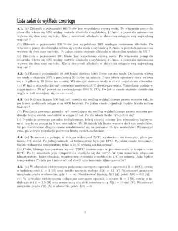 Lista zadań do wykłładu czwartego 4.1. (a) Zbiornik o pojemności 100 litrów jest wypełniony czystą wodą. Po włączeniu pomp do zbiornika wlewa się 10% wodny roztwór alkoholu z szybkością 1 l/min, a powstała mieszanina wylewa się dwa razy szybciej. Kiedy zawartość alkoholu w zbiorniku osiągnie swą największą wartość ? (b) Zbiornik o pojemności 200 litrów jest wypełniony 20% wodnym roztworem alkoholu. Po włączeniu pomp do zbiornika wlewa się czysta woda z szybkością 2 l/min, a powstała mieszanina wylewa się dwa razy szybciej. Po jakim czasie stężenie alkoholu w zbiorniku spadnie do 5% ? (c) Zbiornik o pojemności 200 litrów jest wypełniony czystą wodą. Po włączeniu pomp do zbiornika wlewa się 10% wodny roztwór alkoholu z szybkością 2 l/min, a powstała mieszanina wylewa się dwa razy szybciej. Kiedy zawartość alkoholu w zbiorniku osiągnie swą największą wartość ? 4.2. (a) Basen o pojemności 10 000 litrów zawiera 1000 litrów czystej wody. Do basenu wlewa się woda o skażeniu 50% z prędkością 20 litrów na minutę. Przez otwór spustowy ciecz wylewa się z prędkością 10 litrów na minutę. Wyznaczyć skażenie wody w chwili napełnienia zbiornika. (b) W hali o objętości 200 m3 powietrze zawiera 0.15 % dwutlenku węgla. Wentylator podaje w ciągu minuty 20 m3 powietrza zawierającego 0.04 % CO2 . Po jakim czasie stężenie dwutlenku węgla w hali zmniejszy się dwukrotnie? 4.3. (a) Kultura licząca 500 bakterii rozwija się według wykładniczego prawa wzrostu tak, że po trzech godzinach osiąga stan 8000 bakterii. Po jakim czasie populacja będzie liczyła milion bakterii? (b) Populacja pewnego gatunku ryb rozwijająca się według wykładniczego prawa wzrostu podwoiła liczbę swoich osobników w ciągu 10 lat. Po ilu latach liczba ryb potroi się? (c) Populacja pewnego gatunku biologicznego, której rozwój opisany jest równaniem logistycznym liczyła na początku 5 tys. osobników. Po 10 dniach ich liczba wzrosła do 8 tys. osobników, by po dostatecznie długim czasie ustabilizować się na poziomie 15 tys. osobników. Wyznaczyć czas, po którym populacja podwoiła liczbę swoich osobników. 4.4. (a) Termometr z pokoju, w którym wskazywał 20◦ C, wystawiono na zewnątrz, gdzie panował 5◦ C chłód. Po jednej minucie na termometrze było już 12◦ C. Po jakim czasie termometr będzie wskazywał temperaturę tylko o 10 % wyższą niż faktyczna? (b) Ciało, którego temperatura wynosi 220◦ C umieszczono w pomieszczeniu o temperaturze 60◦ C. Po 10 minutach jego temperatura obniżyła się do 140◦ C. W tym momencie włączono klimatyzatory, które obniżają temperaturę otoczenia z szybkością 1◦ C na minutę. Jaka będzie temperatura T ciała po t minutach od chwili uruchomienia klimatyzatorów? 4.5. (a) W obwodzie elektrycznym połączono szeregowo opornik o oporności R = 10 [Ω], cewkę o indukcyjności L = 2 [H] oraz źródło napięcia stałego E(t) = 12 [V]. Wyznaczyć graniczne natężenie prądu w obwodzie, gdy t → ∞. Naszkicować funkcję I(t) [A], jeżeli I(0) = 0.2 [A]. (b) W obwodzie elektrycznym połączono szeregowo opornik o oporze R = 5 [Ω], cewkę o indukcyjności L = 2.5 [H] oraz zewnętrzną siłę elektromotoryczną E(t) = 10 sin t [V]. Wyznaczyć natężenie prądu I(t) [A] w obwodzie, jeżeli I(0) = 0. 1
