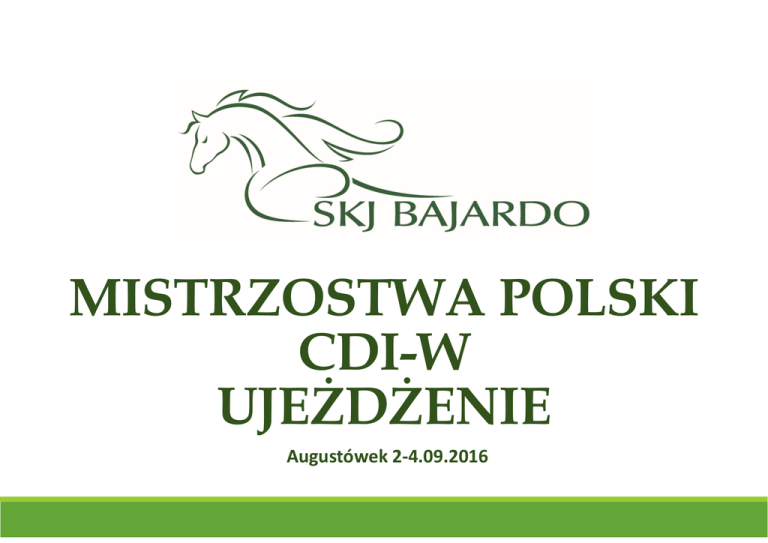 MISTRZOSTWA POLSKI CDI-W UJEŻDŻENIE Augustówek 2-4.09.2016 MISTRZOSTWA POLSKI ORAZ ELIMINACJE PUCHARU ŚWIATA W UJEŻDŻENIU CDICDI-W Zapraszamy do współpracy przy jedynym takim wydarzeniu w roku! Artystyczna sceneria, Ekskluzywna atmosfera, Sportowe emocje, Wdzięk, Szyk, Elegancja Wyjątkowi goście. Reprezentanci biznesu, publicystyki, mediów Najlepsi zawodnicy z Polski i ze Świata Największe wydarzenie jeździeckie w Polsce w 2016 roku SZCZEGÓŁY KIEDY 2-4.09.2016 GDZIE jeden z najnowocześniejszych ośrodków jeździeckich w Polsce „SKJ BAJARDO” w Augustówku pod Warszawą GOŚCIE 300 imiennie zaproszonych osób, ponad100 zawodników z całego świata, ponad 2000 widzów PROFIL GOŚCI najlepsi zawodnicy z Polski i Europy, użytkownicy dóbr luksusowych, przedstawiciele biznesu, przemysłu, polityki, publicystyki, sztuki i kultury, mediów, celebryci, przedstawiciele ambasad, przedstawiciele władz państwowych MEDIA oprócz patronów medialnych zaproszonych jest wielu reprezentantów mediów (telewizja, prasa, radio, agencje fotograficzne, media zagraniczne i wiele innych) PRZEBIEG I ATMOSFERA Zawody rozpoczną się w piątek i potrwają do niedzieli Finały w formie niezwykłego widowiska programów dowolnych do muzyki Wybór Mistrzów Polski w pięciu kategoriach wiekowych od dzieci po seniorów W niedzielę piknik dla zaproszonych gości w ekskluzywnej strefie VIP Występy i pokazy artystyczne Animacje BANKIET Wykwintne jedzenie Alkohole i napoje MOŻLIWOŚCI PROMOCJI Tytuł PARTNERA GŁÓWNEGO/ PARTNERA STRATEGICZNEGO/ PARTNERA / SPONSORA Partner w nazwie zawodów Banery przy płycie głównej Banery na arenie treningowej Logo na zaproszeniu Logo na plakatach Logo na press wallu Logo w scenografii głównej Maszty z flagami Logotypy na oficjalnych drukach (listy startowe, wyniki itp.) Balony z logotypem Przekazanie partnerowi odpowiedniej liczby zaproszeń do strefy VIP dla własnych gości Bramy z logotypem Stoisko promocyjne Możliwość zaproszenia przez organizatora osób o określonym profilu Obsługa zawodów w strojach partnera Specjalna promocja (do ustalenia) Konkurs o nagrodę partnera MOŻLIWOŚCI INDYWIDUALNE (do ustalenia) Logotyp na derce dla zwycięskiego konia KILKA SŁÓW O MP/CDIMP/CDI-W BAJARDO 2016 Zawody, które odbędą się we wrześniu 2016 roku są najbardziej wyczekiwaną i nagłośnioną imprezą jeździecką w Polsce. Wśród zawodników pojawią się wszyscy członkowie Kadry Narodowej. Uczestnicy Igrzysk Olimpijskich, Mistrzostw Świata, zawodnicy zajmujący czołowe miejsca w rankingu Międzynarodowej Federacji Jeździeckiej. Wśród zaproszonych państw znajdują się Niemcy, Holandia, Wielka Brytania, Francja, USA, Japonia, Rosja, Austria, Szwajcaria i wiele innych. Zawody zorganizowane są na najwyższym światowym poziomie. Dodatkową atrakcja dla widzów będzie piknik rodzinny oraz pokazy związane z promocją partnerów i jeździectwa KONTAKT Prezes Stowarzyszenia SKJ Bajardo Stella Strzeszewska +48 604 756 657 Dyrektor Zawodów Marcin Woldański +48 502 433 156 [email protected]