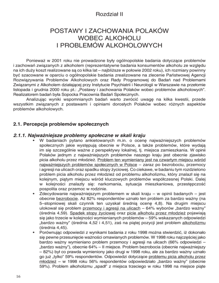 Rozdział II POSTAWY I ZACHOWANIA POLAKÓW WOBEC ALKOHOLU I PROBLEMÓW ALKOHOLOWYCH Ponieważ w 2001 roku nie prowadzone były ogólnopolskie badania dotyczące problemów i zachowań związanych z alkoholem (reprezentatywne badania konsumentów alkoholu ze względu na ich duży koszt realizowane są co kilka lat – najbliższe w połowie 2002 roku), ich rozmiary powinny być szacowane w oparciu o ogólnopolskie badania zrealizowane na zlecenie Państwowej Agencji Rozwiązywania Problemów Alkoholowych oraz Rady Programowej do Badań nad Problemami Związanymi z Alkoholem działającej przy Instytucie Psychiatrii i Neurologii w Warszawie na przełomie listopada i grudnia 2000 roku pt.: „Postawy i zachowania Polaków wobec problemów alkoholowych”. Realizatorem badań była Sopocka Pracownia Badań Społecznych. Analizując wyniki wspomnianych badań warto zwrócić uwagę na kilka kwestii, przede wszystkim związanych z postawami i opiniami dorosłych Polaków wobec różnych aspektów problemów alkoholowych. 2.1. Percepcja problemów społecznych 2.1.1. Najważniejsze problemy społeczne w skali kraju • • • 16 W badaniach pytano ankietowanych m.in. o ocenę najważniejszych problemów społecznych jakie występują obecnie w Polsce, a także problemów, które wydają im się szczególnie ważne z perspektywy lokalnej, tj. miejsca zamieszkania. W opinii Polaków jednym z najważniejszych problemów naszego kraju jest obecnie zjawisko picia alkoholu przez młodzież. Problem ten wymieniany jest na czwartym miejscu wśród najważniejszych problemów społecznych w Polsce – zaraz po bezrobociu, przemocy i agresji na ulicach oraz spadku stopy życiowej. Co ciekawe, w badaniu tym rozdzielono problem picia alkoholu przez młodzież od problemu alkoholizmu, który znalazł się na kolejnym, piątym miejscu wśród kluczowych problemów współczesnej Polski. Dalej w kolejności znalazły się: narkomania, sytuacja mieszkaniowa, przestępczość pospolita oraz przemoc w rodzinie. Zdecydowanie najważniejszym problemem w skali kraju – w opinii badanych – jest obecnie bezrobocie. Aż 82% respondentów uznało ten problem za bardzo ważny (na 5–stopniowej skali czynnik ten uzyskał średnią ocenę 4,8). Na drugim miejscu ulokował się problem przemocy i agresji na ulicach – 64% wyborów „bardzo ważny” (średnia 4,59). Spadek stopy życiowej oraz picie alkoholu przez młodzież pojawiają się jako trzecie w kolejności wymienianych problemów – 59% wskazanych odpowiedzi „bardzo ważny” (średnia 4,52 i 4,51), zaś na piątej pozycji jest problem alkoholizmu (średnia 4,45). Porównując odpowiedzi z wynikami badania z roku 1998 można stwierdzić, iż dokonało się pewne przesunięcie ważności omawianych problemów. W 1998 roku najczęściej jako bardzo ważny wymieniano problem przemocy i agresji na ulicach (66% odpowiedzi – „bardzo ważny”), obecnie 64% – II miejsce. Problem bezrobocia (obecnie najważniejszy – 82%) był co prawda wymieniony jako drugi w 1998 roku, ale za bardzo ważny uznało go już „tylko” 59% respondentów. Odpowiedzi dotyczące problemu picia alkoholu przez młodzież – w 1998 roku 56% respondentów odpowiedziało „bardzo ważny” (obecnie 59%). Problem alkoholizmu „spadł” z miejsca trzeciego w roku 1998 na miejsce piąte w roku 2000 (uzyskując jednak podobny odsetek odpowiedzi „bardzo ważny” – odpowiednio 56% i 57%). Z miejsca siódmego 1998 roku (46% odpowiedzi „bardzo ważny”) na trzecie w 2000 roku (59%) wysunął się problem obniżenia się stopy życiowej ankietowanych. 2.1.2. Najważniejsze problemy społeczne w perspektywie lokalnej (miejscu zamieszkania respondenta) • • • Jeszcze bardziej niż w skali makro problem pijących nastolatków dostrzegany jest z perspektywy lokalnej. Ankietowani sytuują go na trzecim miejscu – po bezrobociu oraz spadku stopy życiowej. Na dalszych pozycjach wśród najważniejszych problemów społecznych widzianych w skali lokalnej (miasta, osiedla) wymieniane są: alkoholizm, sytuacja mieszkaniowa, przemoc i agresja na ulicach oraz zły stan zdrowia społeczeństwa. Oceny formułowane w odniesieniu do skali lokalnej przynoszą nieco inny obraz niż perspektywa ogólnopolska. Na pierwszym miejscu również lokuje się problem bezrobocia, ale otrzymuje on nieznacznie mniej, bo 76% wskazań, uznających go za problem bardzo ważny. Na drugim miejscu, uzyskując 55% odpowiedzi „bardzo ważny”, znajduje się spadek stopy życiowej. Problem picia alkoholu przez młodzież lokuje się na trzeciej pozycji z prawie połową wskazań postrzegających go jako problem „bardzo ważny”, a problem alkoholizmu – na miejscu czwartym (47% wskazań „bardzo ważny”). Bezrobocie, uznane 2 lata temu, podobnie jak w tym roku, za najważniejszy problem lokalny, uzyskało w 1998 roku tylko 50% głosów uznających go za problem bardzo ważny (obecnie 76% takich opinii). Również picie alkoholu przez młodzież, podobnie jak w tym roku, w 1998 uplasowało się na trzecim miejscu w rankingu ważności, uzyskując w obu badaniach podobny odsetek opinii uznających go za problem bardzo ważny (w roku 1998 – 45%, w roku 2000 – 48%). Relatywnemu obniżeniu uległo spostrzeganie ważności problemu alkoholizmu w skali lokalnej – w 1998 roku zjawisko to zostało uznane za drugie co do ważności, zaś w tym roku uplasowało się na miejscu IV (uzyskując jednak w obu badaniach tę samą ilość głosów uznających ten problem za bardzo ważny – 47%). Z pozycji piątej w 1998 roku na drugą w roku 2000 wysunął się problem obniżenia stopy życiowej osób badanych, zaś z miejsca czwartego na szóste „spadł” problem przemocy i agresji na ulicach. 2.2. Postawy wobec alkoholu i osób nadużywających alkoholu 2.2.1. Szkodliwość alkoholu • • Prawie 3/4 (72%) respondentów jest zdania, iż napoje alkoholowe nie mogą być traktowane jak wszystkie inne t
