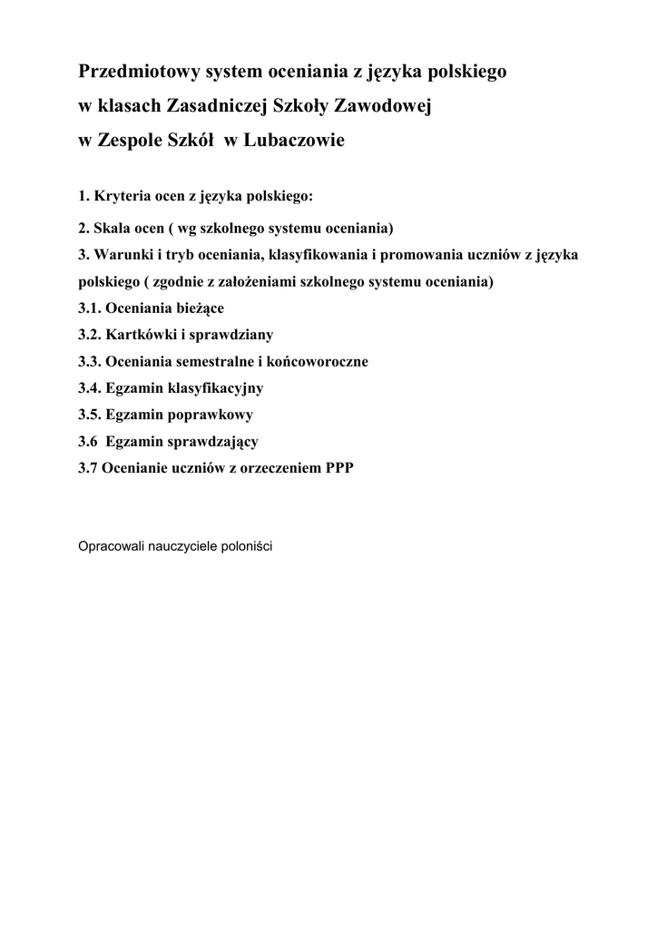 Przedmiotowy system oceniania z języka polskiego w klasach Zasadniczej Szkoły Zawodowej w Zespole Szkół w Lubaczowie 1. Kryteria ocen z języka polskiego: 2. Skala ocen ( wg szkolnego systemu oceniania) 3. Warunki i tryb oceniania, klasyfikowania i promowania uczniów z języka polskiego ( zgodnie z załoŜeniami szkolnego systemu oceniania) 3.1. Oceniania bieŜące 3.2. Kartkówki i sprawdziany 3.3. Oceniania semestralne i końcoworoczne 3.4. Egzamin klasyfikacyjny 3.5. Egzamin poprawkowy 3.6 Egzamin sprawdzający 3.7 Ocenianie uczniów z orzeczeniem PPP Opracowali nauczyciele poloniści 1. Kryteria ocen z języka polskiego Uczeń otrzymuje oceny za: - odpowiedź ustną, - pisemne prace klasowe i domowe, - sprawdziany i testy sprawdzające wiadomości, znajomość lektur, problematyki danej epoki i działu podręcznika - wartość prowadzonych notatek, - samodzielnie opracowany materiał poszerzający wiadomości ( np. referat, notatka biograficzna), - aktywność na lekcjach, udział w dyskusji - testy czytania ze zrozumieniem Ocenianie odpowiedzi ustnej: Na ocenę dopuszczającą uczeń potrafi: - przyporządkować autorom tytuły i głównych bohaterów utworów literackich wskazanych w podstawie programowej; - określić ramy chronologiczne omawianych epok; - objaśnić znaczenie nazw omawianych epok literackich; - wskazać podstawowe cechy najwaŜniejszych dla omawianych okresów gatunków literackich; - streścić główne wątki utworów epickich i dramatycznych z listy lektur obowiązkowych; - rozpoznać najwaŜniejsze środki stylistyczne w utworach literackich omawianych epok; - scharakteryzować bohaterów literackich; - przekazywać efekty swej pracy na lekcjach w komunikatywny sposób; Na ocenę dostateczną uczeń potrafi to, co na ocenę dopuszczającą, a ponadto: - wskazać podstawowe cechy gatunków; - powiązać fakty literackie z istotnymi wydarzeniami historycznymi; - wskazać związki omawianych epok z wcześniejszymi; - wskazać i opisać charakterystyczne cechy językowe i stylistyczne w tekstach literackich omawianych epok; - określić tematykę i problematykę omówionych utworów; - prezentować na lekcji zagadnienia wcześniej przygotowane w domu; - podejmować próby włączenia się do dyskusji. Na ocenę dobrą uczeń potrafi to, co na ocenę dostateczną , a ponadto: - wskazać związki literatury z wydarzeniami historycznymi, kulturą i sztuką omawianych epok; - formułować wnioski, uogólnienia i argumenty, prezentując swój punkt widzenia; - ocenić bohaterów literackich w kontekście epoki, zwracając uwagę na ich uwikłania w problemy moralne, społeczne; - komponować w trakcie zajęć dłuŜsze wypowiedzi w sposób zwarty, logiczny i uporządkowany; - wypowiadać się płynnie, poprawnie pod względem stylistycznym i ortograficznym. Na ocenę bardzo dobrą uczeń potrafi to , co na ocenę dobrą, a ponadto: - wymienić głównych twórców kultury i ich dzieła w omawianych epokach; - wykazać się opanowaniem pamięciowym fragmentów tekstów literackich oraz posługiwać się cytatami; - wyjaśnić funkcje motywów antycznych i symboli biblijnych w poznanych utworach literackich; - rozpoznać nawiązania do tradycji we współczesnym utworze literackim lub filmie; - samodzielnie gromadzić, porządkować i wykorzystywać w wypowiedziach ustnych ( i pisemnych) materiały z róŜnych źródeł dotyczące literatury, filmu i innych dziedzin sztuki; - dokonać samodzielnej analizy i interpretacji dzieła literackiego: posługując się terminologią historyczno- i teoretycznoliteracką; rozpoznając przenośne znaczenia dzieła ( metaforyczne, alegoryczne, paraboliczne); - wykazać się swobodą konwersacji, kulturą dyskusji i piękną polszczyzną; Na ocenę celującą uczeń potrafi to, co na ocenę bardzo dobrą , a ponadto: - prezentując swoje poglądy, umiejętnie posługiwać się wiedzą spoza programu szkolnego, świadczącą o duŜej erudycji; - formułować wnioski dojrzałe , wnikliwe; - polemizować, by obronić własne stanowisko, szukając wciąŜ nowych argumentów. Prace pisemne domowe i klasowe: sposoby sprawdzania stopnia realizacji wymagań Na ocenę dopuszczającą uczeń: - stara się zachowac formę - rozumie temat wypracowania; - pisze pracę zbliŜoną do wymaganego tematu - nie panuje nad potokiem składniowym charakterystycznym dla języka mówionego, - tworzy pracę odtwórczą, - poprawnie zapisuje dialog, ma kłopoty z wprowadzeniem dialogu w tekst ciągły, - ma problemy z dobraniem cytatu, z wprowadzeniem podanego cytatu w tekst ciągły, - popełnia liczne błędy interpunkcyjne, - ma kłopoty z zachowaniem poprawnej pisowni, - zadania są krótkie, zawierają liczne błędy składniowe Na ocenę dostateczną uczeń: - prezentuje własną koncepcję rozwinięcia tematu; - redaguje wypowiedź, zachowując formę, ale nie występują wszytskie elementy, - pisze pracę na temat ale ujęty w sposób powierzchowny, - posługuje się zdaniami krótkimi, często wystepują błędy składniowe, ale zachowana jest logika wypowiedzi, - eliminuje potok składniowy, - dba o poprawność ortograficzną i interpunkcyjną; - wprowadza dialog w tekst ciągły, nie zawsze stosuje poprawną interpunkcję, - podany cytat wprowadza w tekst ciągły, - stosuje poprawną interpunkcję w wypowiedzeniach pojedynczych - poprawnie zapisuje wyrazy poznawane i ćwiczone podczas lekcji. Na ocenę dobrą uczeń: - redaguje wypowiedź, zachowując formę , - umiejętnie łączy poszczególne części pracy tak, by jej tekst był spójny; - stosuje urozmaiconą leksykę (bogate słownictwo) i składnię (róŜne typy zdań); - dba o poprawność i jednorodność stylu; - redaguje prace twórcze, samodzielne, ale nieoryginalne, zgodne z przyjętym schematem, sposobem interpretowania tematu - stosuje wypowiedzenai pojedyncze i złoŜone, występują nieliczne błędy składniowe - unika powtórzeń - stosując dialog, powtarza wyrazy wprowa