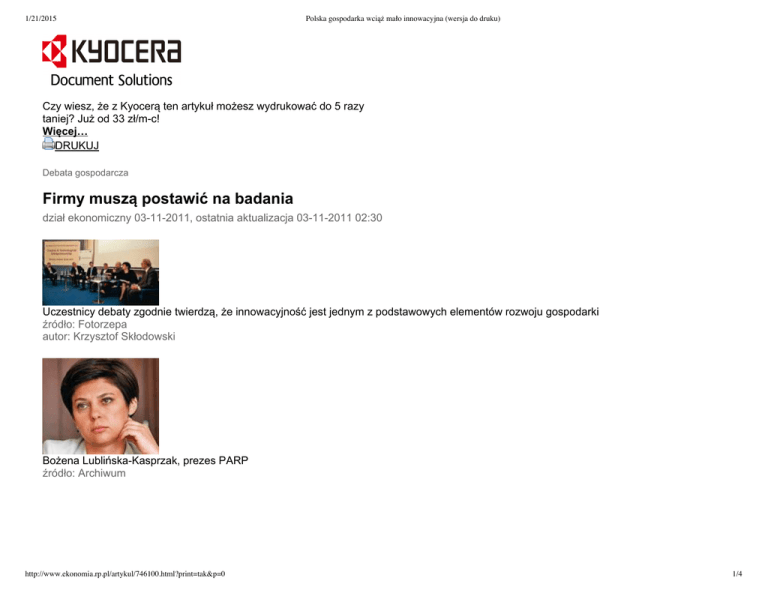 1/21/2015 Polska gospodarka wciąż mało innowacyjna (wersja do druku) Czy wiesz, że z Kyocerą ten artykuł możesz wydrukować do 5 razy taniej? Już od 33 zł/mc! Więcej… DRUKUJ Debata gospodarcza Firmy muszą postawić na badania dział ekonomiczny 03112011, ostatnia aktualizacja 03112011 02:30 Uczestnicy debaty zgodnie twierdzą, że innowacyjność jest jednym z podstawowych elementów rozwoju gospodarki źródło: Fotorzepa autor: Krzysztof Skłodowski Bożena LublińskaKasprzak, prezes PARP źródło: Archiwum http://www.ekonomia.rp.pl/artykul/746100.html?print=tak&p=0 1/4 1/21/2015 Polska gospodarka wciąż mało innowacyjna (wersja do druku) Piotr Moncarz źródło: Archiwum Skończył się etap imitowania cudzych pomysłów. Przedsiębiorcy muszą zdobyć się na własne innowacje Nad tym, na jakim poziomie innowacyjności jest polska gospodarka i jakie są perspektywy przesunięcia jej na bardziej innowacyjne tory, zastanawiali się uczestnicy dyskusji „Świat potrzebuje twoich pomysłów i wynalazków" zorganizowanej w trakcie IV Międzynarodowego Forum Zarządzania Własnością Intelektualną. „Rz" była patronem prasowym debaty. – Polska może się stać naprawdę innowacyjnym krajem. Polski PKB wzrósł w latach 1991 – 2008 o 230 proc. Ten wzrost zawdzięczamy nie tylko boomowi inwestycyjnemu, ale także rosnącemu poziomowi innowacyjności – przekonuje Bożena LublińskaKasprzak, prezes Polskiej Agencji Rozwoju Przedsiębiorczości. Wskazuje też proinnowacyjne sektory polskiej gospodarki, zaliczając do nich m.in. sektor farmaceutyczny, informatycznokomunikacyjny, ale także polskie wzornictwo czy ekologiczną branżę rolnospożywczą. Bardzo dobrze rokuje również sektor lotniczy, czego najlepszym przykładem jest szybko rozwijająca się Dolina Lotnicza na Podkarpaciu. Jak podkreśla Lublińska Kasprzak, dolina to doskonały przykład pozyskiwania funduszy europejskich. Na Podkarpacie napłynęło już ponad 1 mld złotych na innowacje. To dobre prognostyki na przyszłość, tymczasem jak zgodnie wskazują naukowcy i przedsiębiorcy, Polska nadal okupuje ostatnie miejsca w rankingach innowacyjności i choć pnie się w nich, to jednak z mozołem. – Jako kraj nie wypracowaliśmy dotąd żadnego globalnego produktu uznawanego na świecie za przykład innowacyjności – przypomina Paweł Bochniarz, dyrektor działu marketingu, komunikacji i rozwoju biznesu PwC w Polsce, dodając, że wyczerpaliśmy już limit rozwoju gospodarki za pomocą imitacji i dlatego firmy takie jak Solaris Bus & Coach, Fakro, Dr Irena Eris mają już swoje własne działy badawcze. Zgadza się z tym Arkadiusz Patryas – wiceprezes firmy I3D, głównego polskiego startupu wykorzystującego rozwój technologii wirtualnej rzeczywistości i zajmującego się nim. – Na początku wykorzystaliśmy kopiowanie cudzych pomysłów, ale ta droga rozwoju się wyczerpuje – mówi Patryas. Polski paradoks Zdaniem dr. Mirosława Grudnia, wiceprezesa Polskiej Izby Gospodarczej Zaawansowanych Technologii (PIGZT) i jednocześnie prezesa jednej z najbardziej innowacyjnych polskich firm VIGO System, niski poziom innowacyjności polskiej gospodarki jest pewnym paradoksem. – Od kilkudziesięciu lat mówimy w Polsce, że nasza gospodarka jest nieinnowacyjna, a jednocześnie mamy naprawdę wielu świetnych inżynierów – mówi Grudzień. W jego ocenie marsz ku innowacjom trzeba zacząć od prostych rzeczy, w tym klarownego zdefiniowania innowacyjności, bo choć istnieją dziesiątki definicji tego pojęcia, to zdaniem naukowca bardzo celnie sedno sprawy ujął Günter Verheugen, były unijny komisarz ds. przemysłu i przedsiębiorczości. Niemiecki polityk zdefiniował innowacyjność jednym zdaniem, wskazując, że to umiejętność zamiany wiedzy na pieniądze. – Trzeba więc mieć wiedzę i przetworzyć ją w produkt sprzedawalny na rynku. Tymczasem my mamy wiedzę, ale nie wiemy, jak ją sprzedać – mówi Grudzień. Dlaczego tak się dzieje? – Wiedzą dysponuje sfera nauki, ale klucz do jej sprzedaży leży w sferze przemysłu, a w Polsce pomiędzy tymi sferami istnieje głęboka przepaść m.in. dlatego, że biznes mówi zupełnie innym http://www.ekonomia.rp.pl/artykul/746100.html?print=tak&p=0 2/4 1/21/2015 Polska gospodarka wciąż mało innowacyjna (wersja do druku) językiem niż naukowcy – dodaje wiceprezes PIGZT. 0,68 proc. PKB wyniosły w 2009 roku polskie nakłady na działalność badawczorozwojową Jak więc przeskoczyć rów dzielący nas od upragnionej innowacyjności? Zdaniem Grudnia polska gospodarka powinna zmierzać drogą badań przemysłowych. – Ulokowanie badań w placówce naukowej jest najmniej efektywnym i drogim sposobem. Naukowcy na badania mają co najwyżej 30 proc. czasu, którym dysponują pracownicy w firmach. Te same badania w firmie trwają trzy miesiące, a na uczelni trzy lata – przekonuje Grudzień. Konieczna współpraca – To, że z Polski nie potrafimy zrobić drugiej Japonii, to też niewątpliwie problem ram systemowych i bezpośredniego otoczenia innowatorów – mówi dr Piotr Moncarz z Uniwersytetu w Stanford (USA), wiceprezydent amerykańskiej firmy Exponent Inc. – Wszystko zaczyna się od twórcy i jego zespołu. W USA trudno sobie wyobrazić innowacje bez zespołu, nie tylko naukowców, ale także prawników i finansistów, którzy finansują pomysł i wprowadzają go na rynek – tłumaczy Moncarz. Tymczasem, jak przyznają inni dyskutanci, współpraca nie należy do naszych mocnych stron. – Polacy mają duży potencjał kreatywności i innowacyjności, ale często potencjał jednostki nie przekłada się na innowacyjność ogółu. Firmy też rzadko współpracują ze sobą – potwierdza LublińskaKasprzak. – Studenci nie pracują w grupach na uczelni – wtóruje Marcin Franc z Politechniki Łódzkiej, opiekun merytoryczny zespołu studentów, który zwyciężył w finałach krajowych konkursu technologicznego Imagine