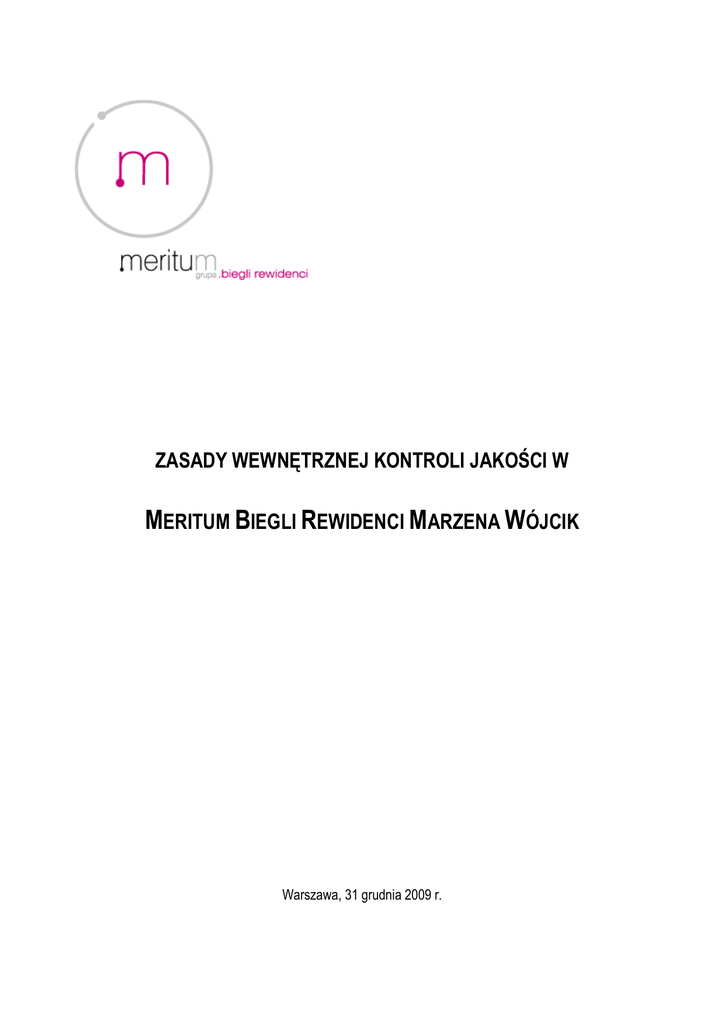 ZASADY WEWNĘTRZNEJ KONTROLI JAKOŚCI W MERITUM BIEGLI REWIDENCI MARZENA WÓJCIK Warszawa, 31 grudnia 2009 r. Niniejsze zasady zostały ustalone dla Meritum Biegli Rewidenci Marzena Wójcik, podmiotu uprawnionego do badania sprawozdań finansowych nr ewidencyjny 3159, z siedzibą w Warszawie, przy ul. Bukowińskiej 26B lok. U2 – zwanego dalej Podmiotem, na podstawie art. 49 ust. 1 ustawy z dnia 7 maja 2009 r. o biegłych rewidentach i ich samorządzie, podmiotach uprawnionych do badania sprawozdań finansowych oraz o nadzorze publicznym (Dz. U. z 2009 r., nr 77 poz. 649) w związku z uchwałą Krajowej Rady Biegłych Rewidentów nr 1378/32/2009 z dnia 13 października 2009 r. 1. 2. 3. 4. 1. 2. 3. 4. 5. § 1. Zagadnienia ogólne Przez system kontroli jakości rozumie się procesy zapewniające wykonywanie przez Podmiot, jako podmiot uprawniony do badania sprawozdań finansowych czynności rewizji finansowej zgodnie z zasadami etyki zawodowej biegłych rewidentów oraz z krajowymi standardami rewizji finansowej. Zasady kontroli jakości należy rozumieć i stosować w połączeniu z odpowiednimi zasadami etyki oraz Kodeksu etyki dla zawodowych księgowych "IFAC". Pracownicy i współpracownicy Podmiotu mają obowiązek przestrzegania zasad niezależności, uczciwości, obiektywizmu, zachowania tajemnicy zawodowej przewidzianej dla biegłych rewidentów przepisami prawa oraz standardami rewizji i kodeksem etyki zawodowej, należytej staranności i zawodowych kompetencji przy wykonywaniu zadań. Oświadczenie potwierdzające spełnienie wymogu niezależności od każdego pracownika i współpracownika, zobowiązanych do zachowania niezależności, jest składane raz na rok. § 2. System Kontroli Jakości Podmiot, jako uprawniony do badania sprawozdań finansowych zapewnia, że sposób wykonywania czynności rewizji finansowej w jego imieniu przez: a. kluczowego biegłego rewidenta, b. biegłych rewidentów zatrudnionych w Podmiocie na podstawie umowy o cywilnoprawnej, c. biegłych rewidentów zatrudnionych w Podmiocie na podstawie umowy o pracę, d. asystentów biegłych rewidentów, zatrudnionych w Podmiocie na podstawie umowy o pracę, e. kandydatów na biegłego rewidenta, odbywających aplikacje na podstawie umowy o pracę lub umowy cywilnoprawnej, - jest w pełni zgodny z zasadami etyki, krajowymi standardami, przepisami prawa oraz warunkami określonymi w zawieranych umowach. Nieodłączne ograniczenia, takie jak np. indywidualne różnice w zrozumieniu wymogów zawodowych oraz zasad i procedur systemu kontroli jakości przez pracowników i współpracowników, mogą wpływać na stopień zgodności działania z zasadami i procedurami systemu kontroli jakości, a tym samym ograniczać jego efektywność i skuteczność działania. Kierownik Podmiotu, będący osobą prowadzącą działalność gospodarczą, ponosi ostateczną odpowiedzialność za system kontroli jakości Podmiotu. System kontroli wewnętrznej w zakresie czynności rewizji finansowej obejmuje: a. kontrolę sprawowaną przez biegłego rewidenta Kierownika Podmiotu, ze szczególnym uwzględnieniem kontroli merytorycznej prowadzonych prac i przestrzegania norm wykonywania zawodu, a sprawowaną przez inne osoby wykonujące czynności rewizji finansowej, b. kontrolę sprawowaną przez biegłego rewidenta Kierownika Podmiotu z zakresu organizacji pracy, c. kontrolę sprawowaną przez biegłych rewidentów kierujących badaniem, d. kontrolę sprawowaną przez kluczowego biegłego rewidenta i biegłych rewidentów przeprowadzających weryfikacje. W systemie wewnętrznej kontroli jakości zakres odpowiedzialności sprawujących ją osób ustalony jest następująco: a. biegły rewident Kierownik Podmiotu, odpowiada za: Meritum Biegli Rewidenci Zasady Wewnętrznej Kontroli Jakości 2 - opracowanie wewnętrznych dokumentów organizacyjno-prawnych, - zatrudnienie pracowników o odpowiednich kwalifikacjach zawodowych, - organizację szkoleń pracowników i dbanie o ich rozwój zawodowy, - organizowanie świadczenia usług rewizji finansowej, w tym zawieranie umów o wykonanie usług, prowadzenie ich rejestru, przygotowanie wzoru dokumentacji stosowanej do czynności rewizji finansowej, nadzór nad dokonywaniem właściwych opłat z tytułu ubezpieczenia i składek KIBR, monitorowanie przebiegu badań z założonym planem, wykonywanie obowiązków sprawozdawczych i informacyjnych przewidzianych ustawą o biegłych rewidentach, - zapewnienie możliwości konsultacji problemów prawnych, podatkowych oraz z dziedziny finansów, wynikłych w toku czynności rewizji finansowej z właściwymi merytorycznie doradcami Grupy Meritum. b. biegły rewident Kierownik Podmiotu oraz kluczowy biegły rewident odpowiedzialni są za: - zapewnienie przestrzegania zasad etyki i norm wykonywania zawodu określonych w ustawie o biegłych rewidentach oraz w uchwałach organów samorządowych, - ostateczną kontrolę protokołów z weryfikacji dokumentacji rewizyjnej pod względem formalnym i merytorycznym, - podpisywanie w imieniu Podmiotu opinii i raportów z czynności rewizji finansowej w badanych jednostkach. c. biegły rewident Kierownik Podmiotu lub biegli rewidenci zatrudnieni na umowę o pracę odpowiedzialni są za: - opracowanie planów badania sprawozdań finansowych, - wnikliwe i terminowe przeprowadzenie badań, - bezpośredni nadzór i kontrolę prac wykonywanych przez asystentów przy badaniu sprawozdań finansowych, - zgromadzenie i opracowanie dokumentacji rewizyjnej (dokumentacji roboczej, raportu i opinii), - weryfikację dokumentacji rewizyjnej, - archiwizowanie i przechowywanie dokumentacji rewizyjnej w siedzibie przez okres określony w normach wykonywania zawodu i w sposób zapewniający ochronę danych. d. asystenci biegłych rewidentów w toku czynności rewizji finansowej odpowiedzialni są za: - sumienne wykonanie powierzonej im pracy do wykonania, - informowanie biegłego rewidenta przeprowadzającego badanie (kierującego ba