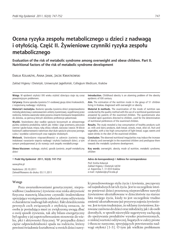 Kolarzyk Probl HigEEpidemiol i wsp. Ocena 2011, ryzyka 92(4): zespołu 747-752 metabolicznego u dzieci z nadwagą i otyłością. Część II. Żywieniowe czynniki ... 747 Ocena ryzyka zespołu metabolicznego u dzieci z nadwagą i otyłością. Część II. Żywieniowe czynniki ryzyka zespołu metabolicznego Evaluation of the risk of metabolic syndrome among overweight and obese children. Part II. Nutritional factors of the risk of metabolic syndrome development Emilia Kolarzyk, Anna Janik, Jacek Kwiatkowski Zakład Higieny i Dietetyki, Uniwersytet Jagielloński, Collegium Medicum, Kraków Wstęp. W epidemii otyłości XXI wieku otyłość dziecięca staje się coraz poważniejszym problemem. Introduction. Childhood obesity is an alarming problem of the obesity epidemic of XXI century. Cel pracy. Ocena sposobu żywienia 51-osobowej grupy dzieci krakowskich, z rozpoznaną nadwagą i otyłością. Aim. The estimation of the nutrition mode in the group of 51 children living in Krakow, diagnosed with overweight or obesity. Materiał i metodyka. Badanie sposobu żywienia dzieci przeprowadzono metodą jakościową z zastosowaniem ankiety żywieniowej, wypełnianej przez rodziców. Ankieta zawierała także pytania otwarte kierowane bezpośrednio do dziecka, za pomocą których określono preferencje pokarmowe. Material & methods. The examination of the mode of nutrition was conducted by the quality method with the use of a nutritional questionnaire answered by parents of the examined children. The questionnaire also included open questions directed to children, used for the determination of nutritional preferences of the examined children. Wyniki. Stwierdzono zbyt rzadkie spożycie korzystnych ze zdrowotnego punktu widzenia produktów, takich jak; mleko i jego przetwory, pieczywo ciemne i grube kasze, mięso, ryby, oliwa z oliwek, warzywa i owoce. W diecie badanych zaobserwowano natomiast zbyt duże spożycie pieczywa jasnego, cukru i wyrobów cukierniczych oraz napojów słodzonych. Results. The study revealed a low consumption of healthy products such as: milk and dairy products, dark bread, cereals, meat, olive oil, fruit and vegetables, with a too high consumption of light bread, sugar, sweets and sweet drinks in the diet of the examined children. Wniosek. Stwierdzone nieprawidłowości w zakresie żywienia mogą indukować narastanie stopnia nadwagi i otyłości badanych dzieci, a tym samym predysponować je do rozwoju cech zespołu metabolicznego Conclusion. The observed nutritional irregularities may induce the increase of obesity and overweight in the examined children and predispose them towards the metabolic syndrome development. Słowa kluczowe: nadwaga, otyłość, sposób żywienia, zespół metaboliczny, dzieci Key words: overweight, obesity, mode of nutrition, metabolic syndrome, children © Probl Hig Epidemiol 2011, 92(4): 747-752 Adres do korespondencji / Address for correspondence www.phie.pl Nadesłano: 20.10.2011 Zakwalifikowano do druku: 03.11.2011 Wstęp Poza uwarunkowaniami genetycznymi, nieprawidłowe (nadmierne) żywienie oraz niska aktywność fizyczna stanowią kluczowe czynniki środowiskowe sprzyjające występowaniu zaburzeń stanu odżywienia o charakterze nadwagi lub otyłości. Fakt dziedziczenia pewnych cech związanych z otyłością oznacza, że osoba je posiadająca musi ze zwiększoną uwagą dbać o swój sposób żywienia, tak aby bilans energetyczny był zgodny z jej zapotrzebowaniem stosownie do wieku, płci i aktywności fizycznej. W przypadku dzieci ciężar odpowiedzialności spada na rodziców, którzy powinni świadomie kształtować u swoich dzieci nawy- Prof. Emilia Kolarzyk Zakład Higieny i Dietetyki UJCM ul. Kopernika 7, 31-034 Kraków e-mail: [email protected] ki prozdrowotnego stylu życia i żywienia, począwszy od najmłodszych lat ich życia. Jest to szczególnie istotne ponieważ dzieci przenoszą nieprawidłowe nawyki żywieniowe ukształtowane w dzieciństwie na starsze lata swojego życia, kiedy to jest szczególnie trudno zmienić ukształtowane już przyzwyczajenia żywieniowe. Jest to tym trudniejsze, że reklamy żywieniowe, kierowane zarówno do dzieci oraz młodzieży, jak i do osób dorosłych, w sposób niezwykle sugestywny zachęcają do spożywania produktów wysoko przetworzonych, o niskiej wartości odżywczej, bogatych w cukry proste i tłuszcze nasycone, sprzyjających powstawaniu nadwagi otyłości [1-3]. O tym jak wielkim problemem 748 Probl Hig Epidemiol 2011, 92(4): 747-752 jest nieprawidłowe żywienie wśród dzieci i młodzieży świadczą wyniki wielu badań krajowych i zagranicznych, prowadzonych i publikowanych w ostatnich kilkunastu latach [4-7]. Epidemii otyłości dziecięcej sprzyja także nieprawidłowy styl życia, przejawiający się w zbyt małej aktywności fizycznej. Dzieci zarówno w wieku przedszkolnym jak i szkolnym charakteryzuje coraz częściej siedzący tryb życia, będący wynikiem rozwoju cywilizacyjnego (motoryzacja, ekspansja mediów elektronicznych) [8-10]. Na narastający w ostatnim dziesięcioleciu problem rozwoju nadwagi i otyłości w populacji światowej (również wśród dzieci) zwróciła uwagę Światowa Organizacja Zdrowia, opracowując i publikując od roku 2000 liczne zalecenia i raporty dotyczące tego problemu [11-12]. Należy podkreślić, że otyłość typu trzewnego i ściśle z nią współistniejąca insulinooporność są uznawane jako niekwestionowane, często pierwotne czynnikami etiologiczne rozwoju zespołu metabolicznego [13,14]. Cel pracy Ocena sposobu żywienia grupy dzieci krakowskich z rozpoznaną nadwagą i otyłością, jako potencjalnych czynników rozwoju cech zespołu metabolicznego. Metodyka Profilaktycznymi badaniami w latach 2008-2009 objętych było 324 dzieci z różnych dzielnic Krakowa. Dzieci z nieprawidłową masą ciała (niedobory lub nadmiary) zostały objęte systematyczną opieką dietetyczną i wykonywane były u nich pomiary antropometry