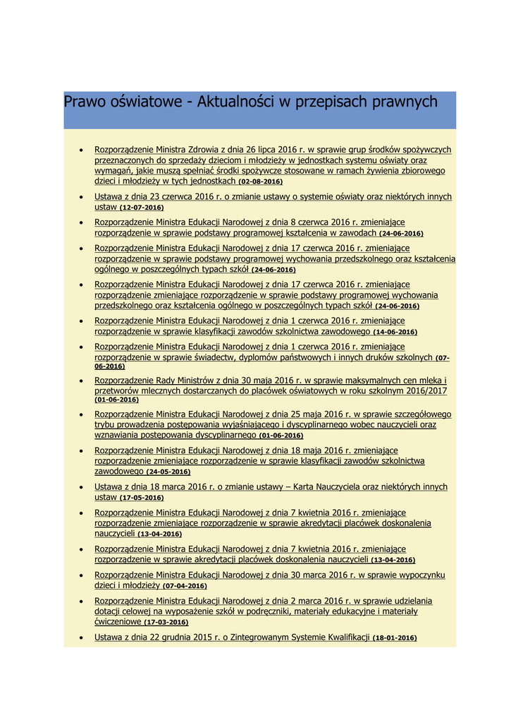 Prawo oświatowe - Aktualności w przepisach prawnych Rozporządzenie Ministra Zdrowia z dnia 26 lipca 2016 r. w sprawie grup środków spożywczych przeznaczonych do sprzedaży dzieciom i młodzieży w jednostkach systemu oświaty oraz wymagań, jakie muszą spełniać środki spożywcze stosowane w ramach żywienia zbiorowego dzieci i młodzieży w tych jednostkach (02-08-2016) Ustawa z dnia 23 czerwca 2016 r. o zmianie ustawy o systemie oświaty oraz niektórych innych ustaw (12-07-2016) Rozporządzenie Ministra Edukacji Narodowej z dnia 8 czerwca 2016 r. zmieniające rozporządzenie w sprawie podstawy programowej kształcenia w zawodach (24-06-2016) Rozporządzenie Ministra Edukacji Narodowej z dnia 17 czerwca 2016 r. zmieniające rozporządzenie w sprawie podstawy programowej wychowania przedszkolnego oraz kształcenia ogólnego w poszczególnych typach szkół (24-06-2016) Rozporządzenie Ministra Edukacji Narodowej z dnia 17 czerwca 2016 r. zmieniające rozporządzenie zmieniające rozporządzenie w sprawie podstawy programowej wychowania przedszkolnego oraz kształcenia ogólnego w poszczególnych typach szkół (24-06-2016) Rozporządzenie Ministra Edukacji Narodowej z dnia 1 czerwca 2016 r. zmieniające rozporządzenie w sprawie klasyfikacji zawodów szkolnictwa zawodowego (14-06-2016) Rozporządzenie Ministra Edukacji Narodowej z dnia 1 czerwca 2016 r. zmieniające rozporządzenie w sprawie świadectw, dyplomów państwowych i innych druków szkolnych (07- 06-2016) Rozporządzenie Rady Ministrów z dnia 30 maja 2016 r. w sprawie maksymalnych cen mleka i przetworów mlecznych dostarczanych do placówek oświatowych w roku szkolnym 2016/2017 (01-06-2016) Rozporządzenie Ministra Edukacji Narodowej z dnia 25 maja 2016 r. w sprawie szczegółowego trybu prowadzenia postępowania wyjaśniającego i dyscyplinarnego wobec nauczycieli oraz wznawiania postępowania dyscyplinarnego (01-06-2016) Rozporządzenie Ministra Edukacji Narodowej z dnia 18 maja 2016 r. zmieniające rozporządzenie zmieniające rozporządzenie w sprawie klasyfikacji zawodów szkolnictwa zawodowego (24-05-2016) Ustawa z dnia 18 marca 2016 r. o zmianie ustawy – Karta Nauczyciela oraz niektórych innych ustaw (17-05-2016) Rozporządzenie Ministra Edukacji Narodowej z dnia 7 kwietnia 2016 r. zmieniające rozporządzenie zmieniające rozporządzenie w sprawie akredytacji placówek doskonalenia nauczycieli (13-04-2016) Rozporządzenie Ministra Edukacji Narodowej z dnia 7 kwietnia 2016 r. zmieniające rozporządzenie w sprawie akredytacji placówek doskonalenia nauczycieli (13-04-2016) Rozporządzenie Ministra Edukacji Narodowej z dnia 30 marca 2016 r. w sprawie wypoczynku dzieci i młodzieży (07-04-2016) Rozporządzenie Ministra Edukacji Narodowej z dnia 2 marca 2016 r. w sprawie udzielania dotacji celowej na wyposażenie szkół w podręczniki, materiały edukacyjne i materiały ćwiczeniowe (17-03-2016) Ustawa z dnia 22 grudnia 2015 r. o Zintegrowanym Systemie Kwalifikacji (18-01-2016) Ustawa z dnia 29 grudnia 2015 r. o zmianie ustawy o systemie oświaty oraz niektórych innych ustaw (11-01-2016) Obwieszczenie Marszałka Sejmu Rzeczypospolitej Polskiej z dnia 4 grudnia 2015 r. w sprawie ogłoszenia jednolitego tekstu ustawy − Kodeks postępowania administracyjnego (08-01-2016) Rozporządzenie Ministra Edukacji Narodowej z dnia 22 grudnia 2015 r. w sprawie sposobu podziału części oświatowej subwencji ogólnej dla jednostek samorządu terytorialnego w roku 2016 (04-01-2016)