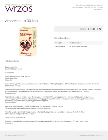 Sklep Zielarsko-Medyczny "Wrzos" Ul.Kolejowa 13 box 51, 10-284 Olsztyn 501490417 Amorecaps x 30 kap. Cena: 15,90 PLN Opis słownikowy Producent Herbapol Kraków Zastosowanie do użytku wewnętrznego Opis produktu Suplement diety Zawartość opakowania: 30 kapsułek Masa pojedynczej kapsułki: 296mg Masa netto: 8,9g Składniki: Liście damiany (50 mg/kaps.), sproszkowany korzeń lubczyka (170 mg/kaps.) oraz składniki kapsułki (żelatyna, barwniki: dwutlenek tytanu, tlenki żelaza). Zawartość sproszkowanych liści damiany w przeliczeniu na zalecaną do spożycia dzienną porcję produktu wynosi :300mg. Zawartość sproszkowanego korzenia lubczyka w przeliczeniu na zalecaną do spożycia dzienną porcję produktu wynosi :1020mg. Przeznaczenie: Pochodzące wprost z Meksyku liście damiany jak i polski korzeń lubczyka są znanymi i cenionymi afrodyzjakami. Surowce te wzmacniają organizm, działają pobudzająco, wzmagają potencję, siły witalne i energię seksualną, polepszają życie seksualne, przedłużają aktywność płciową, działają lekko moczopędnie. Sposób użycia: Zaleca się przyjmowanie doustnie po 2 kapsułki 3 razy dziennie, popijając płynem. Nie przekraczać zalecanej do spożycia dziennej porcji produktu. Przechowywać w zamkniętym opakowaniu, w temperaturze pokojowej w sposób niedostępny dla małych dzieci. Chronić przed dostępem światła i wilgoci. GIS-HŻ-4433-D-455/MN/04 Producent posiada Zintegrowany System Zarządzania Jakością i Bezpieczeństwem Żywności ISO 9001, ISO 22000. Producent: Plik wygenerowano: 04-03-2017 Oprogramowanie sklepu: AptusShop Sklep Zielarsko-Medyczny "Wrzos" Ul.Kolejowa 13 box 51, 10-284 Olsztyn 501490417 Krakowskie Zakłady Zielarskie „HERBAPOL” w Krakowie SA ul. Chałupnika 14, 31-464 Kraków, tel. 12-411-69-11, fax 12 411 58 37 Plik wygenerowano: 04-03-2017 Powered by TCPDF (www.tcpdf.org) Oprogramowanie sklepu: AptusShop