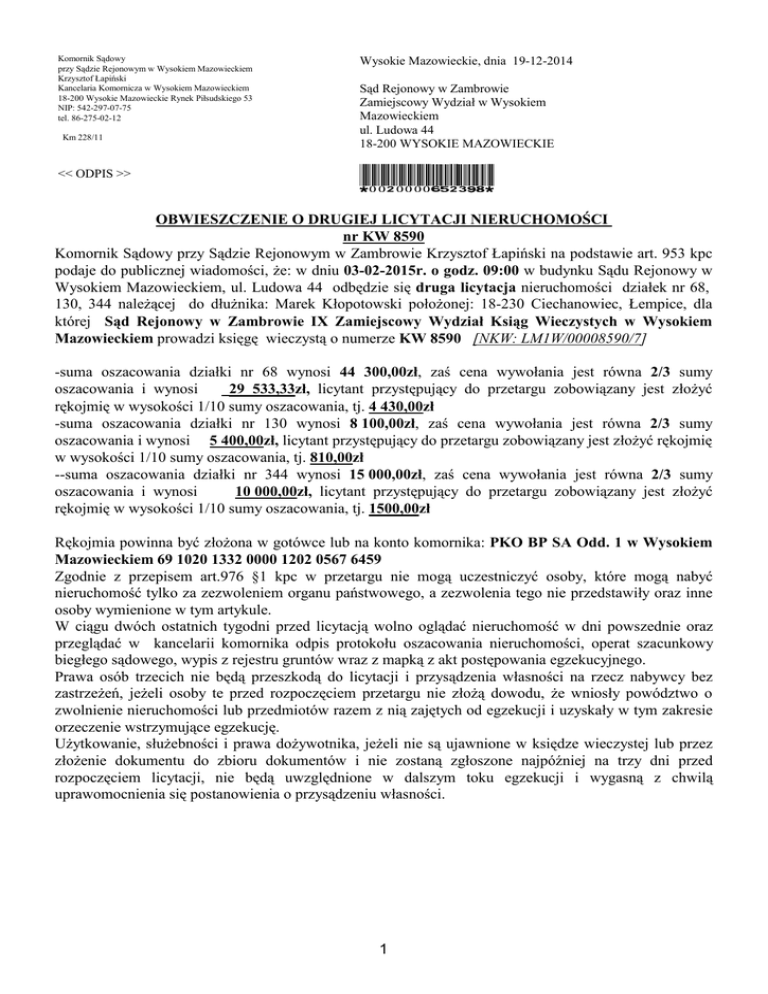 Komornik Sądowy przy Sądzie Rejonowym w Wysokiem Mazowieckiem Krzysztof Łapiński Kancelaria Komornicza w Wysokiem Mazowieckiem 18-200 Wysokie Mazowieckie Rynek Piłsudskiego 53 NIP: 542-297-07-75 tel. 86-275-02-12 Km 228/11 << ODPIS >> Wysokie Mazowieckie, dnia 19-12-2014 Sąd Rejonowy w Zambrowie Zamiejscowy Wydział w Wysokiem Mazowieckiem ul. Ludowa 44 18-200 WYSOKIE MAZOWIECKIE *0020000652398* OBWIESZCZENIE O DRUGIEJ LICYTACJI NIERUCHOMOŚCI nr KW 8590 Komornik Sądowy przy Sądzie Rejonowym w Zambrowie Krzysztof Łapiński na podstawie art. 953 kpc podaje do publicznej wiadomości, że: w dniu 03-02-2015r. o godz. 09:00 w budynku Sądu Rejonowy w Wysokiem Mazowieckiem, ul. Ludowa 44 odbędzie się druga licytacja nieruchomości działek nr 68, 130, 344 należącej do dłużnika: Marek Kłopotowski położonej: 18-230 Ciechanowiec, Łempice, dla której Sąd Rejonowy w Zambrowie IX Zamiejscowy Wydział Ksiąg Wieczystych w Wysokiem Mazowieckiem prowadzi księgę wieczystą o numerze KW 8590 [NKW: LM1W/00008590/7] -suma oszacowania działki nr 68 wynosi 44 300,00zł, zaś cena wywołania jest równa 2/3 sumy oszacowania i wynosi 29 533,33zł, licytant przystępujący do przetargu zobowiązany jest złożyć rękojmię w wysokości 1/10 sumy oszacowania, tj. 4 430,00zł -suma oszacowania działki nr 130 wynosi 8 100,00zł, zaś cena wywołania jest równa 2/3 sumy oszacowania i wynosi 5 400,00zł, licytant przystępujący do przetargu zobowiązany jest złożyć rękojmię w wysokości 1/10 sumy oszacowania, tj. 810,00zł --suma oszacowania działki nr 344 wynosi 15 000,00zł, zaś cena wywołania jest równa 2/3 sumy oszacowania i wynosi 10 000,00zł, licytant przystępujący do przetargu zobowiązany jest złożyć rękojmię w wysokości 1/10 sumy oszacowania, tj. 1500,00zł Rękojmia powinna być złożona w gotówce lub na konto komornika: PKO BP SA Odd. 1 w Wysokiem Mazowieckiem 69 1020 1332 0000 1202 0567 6459 Zgodnie z przepisem art.976 §1 kpc w przetargu nie mogą uczestniczyć osoby, które mogą nabyć nieruchomość tylko za zezwoleniem organu państwowego, a zezwolenia tego nie przedstawiły oraz inne osoby wymienione w tym artykule. W ciągu dwóch ostatnich tygodni przed licytacją wolno oglądać nieruchomość w dni powszednie oraz przeglądać w kancelarii komornika odpis protokołu oszacowania nieruchomości, operat szacunkowy biegłego sądowego, wypis z rejestru gruntów wraz z mapką z akt postępowania egzekucyjnego. Prawa osób trzecich nie będą przeszkodą do licytacji i przysądzenia własności na rzecz nabywcy bez zastrzeżeń, jeżeli osoby te przed rozpoczęciem przetargu nie złożą dowodu, że wniosły powództwo o zwolnienie nieruchomości lub przedmiotów razem z nią zajętych od egzekucji i uzyskały w tym zakresie orzeczenie wstrzymujące egzekucję. Użytkowanie, służebności i prawa dożywotnika, jeżeli nie są ujawnione w księdze wieczystej lub przez złożenie dokumentu do zbioru dokumentów i nie zostaną zgłoszone najpóźniej na trzy dni przed rozpoczęciem licytacji, nie będą uwzględnione w dalszym toku egzekucji i wygasną z chwilą uprawomocnienia się postanowienia o przysądzeniu własności. 1