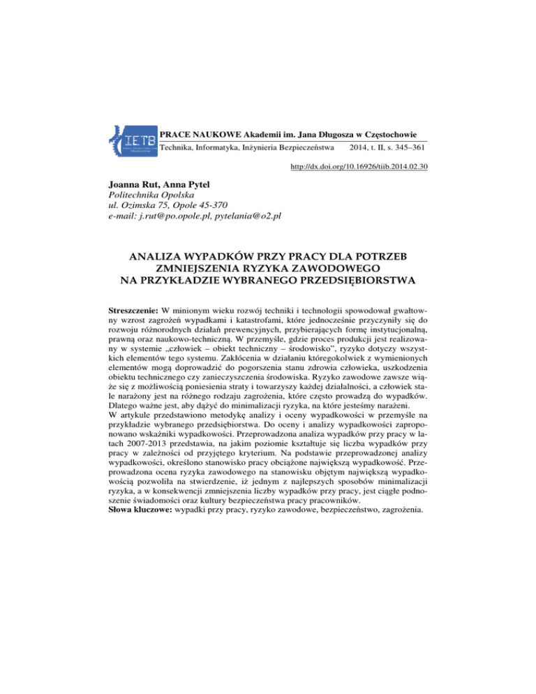 PRACE NAUKOWE Akademii im. Jana Długosza w Częstochowie ęstochowie Technika, Informatyka, Inżynieria In Bezpieczeństwa 2014, t. II, s. 345–361 345 http://dx.doi.org/10.16926/tiib.2014.02.30 Joanna Rut, Anna Pytel Politechnika Opolska ul. Ozimska 75, Opole 45-370 45 e-mail: [email protected], [email protected] [email protected] ANALIZA WYPADKÓW PRZY PRZY PRACY DLA POTRZEB ZMNIEJ ZMNIEJSZENIA RYZYKA ZAWODOWEGO NA PRZYKŁADZIE WYBRANEGO WYBRANEG PRZEDSIĘBIORSTWA BIORSTWA Streszczenie: W minionym wieku rozwój techniki i technologii spowodował gwałtowgwałto ny wzrost zagrożeńń wypadkami i katastrofami, które jednocześnie nie przyczyniły si się do rozwoju różnorodnych norodnych działań działa prewencyjnych, przybierających formę instytucjonalną, instytucjonaln prawną oraz naukowo-techniczn techniczną. W przemyśle, gdzie proces produkcji jest realizowarealizow ny w systemie temie „człowiek – obiekt techniczny – środowisko”, ryzyko dotyczy wszystkich elementów tego systemu. Zakłócenia w działaniu któregokolwiek z wymienionych elementów mogą doprowadzić doprowadzi do pogorszenia stanu zdrowia człowieka, uszkodzenia obiektu technicznego czy zanieczyszczenia środowiska. rodowiska. Ryzyko zawodowe zawsze wiąwi że się z możliwościąą poniesienia straty i towarzyszy ka każdej działalności, a człowiek stasta le narażony jest na różnego żnego rodzaju zagrożenia, zagro które często prowadzą do wypadków. Dlatego ważne ne jest, aby dążyć d do minimalizacji ryzyka, na które jesteśmy my nara narażeni. W artykule przedstawiono metodykę metodyk analizy i oceny wypadkowości ci w przemyśle przemy na przykładzie wybranego przedsiębiorstwa. przedsi Do oceny i analizy wypadkowości ści zapropozaprop nowano wskaźniki niki wypadkowości. wypadkowo ci. Przeprowadzona analiza wypadków przy pracy w la latach 2007-2013 2013 przedstawia, na jakim poziomie kształtuje się si liczba wypadków przy pracy w zależności ci od przyjętego przyj tego kryterium. Na podstawie przeprowadzonej analizy wypadkowości, określono lono stanowisko pracy obciążone obci największą wypadkowość. wypadkowo Przeprowadzona ocena ryzyka zawodowego na stanowisku objętym obj największą kszą wypadk wypadkowością pozwoliła na stwierdzenie, iż i jednym z najlepszych sposobów minimalizacji ryzyka, a w konsekwencji zmniejszenia liczby wypadków przy pracy, jest ciągłe podnopodn szenie świadomości ci oraz kultury bezpieczeństwa bezpiecze pracy pracowników. Słowa kluczowe: wypadki przy pracy, ryzyko zawodowe, bezpieczeństwo, bezpiecze stwo, zagrożenia. zagro 346 Joanna Rut, Anna Pytel ANALYSIS OF ACCIDENTS AT WORK FOR REDUCE THE RISK OF TRAINING ON THE EXAMPLE OF SELECTED COMPANY Abstract: In the past century the development of techniques and technologies has caused a sharp increase in the risks of accidents and disasters, which also contributed to the development of a variety of preventive measures, taking the form of institutional, legal, and scientific and technical support. Occupational risk is always associated with the possibility of incurring losses and accompanies each activity. In an industry where the production process is implemented in the system "man - a technical object - environment," it refers to all elements of the system. Interference to any of the above elements can lead to the deterioration of human health, damage to a technical object or environment pollution. Society is constantly exposed to various risks, which often lead to accidents. Therefore, it is important to seek to minimize the risks to which we are exposed. The paper presents a methodology of analysis and evaluation of accidents in the industry as an example of the selected company. To assess and analyze the proposed accident accident rates. The analysis of accidents at work in the period 2007-2013 shows what level is as the number of accidents at work, depending on the adopted criterion. Based on the analysis of accidents, specified workstation loaded with the most accidents. The risk assessment training on a bench under the highest accident rate has allowed the conclusion that one of the best ways to minimize risk and, consequently, reduce the number of accidents at work is to continue raising awareness and safety culture workers. Keywords: accidents, occupational risk occupat, safety, hazards.