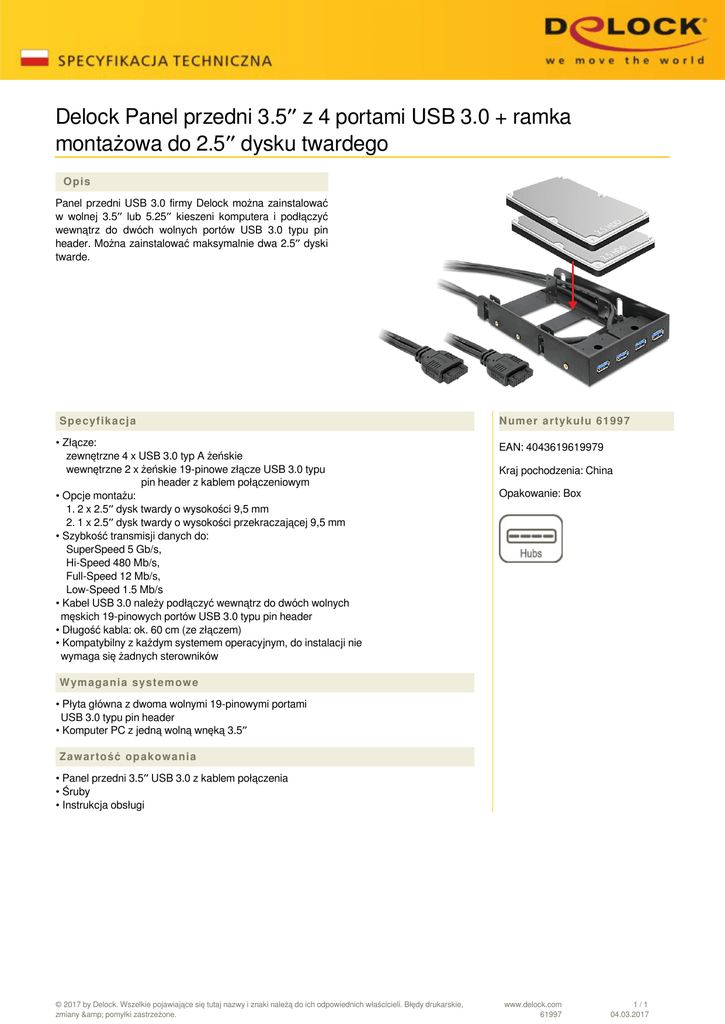 Delock Panel przedni 3.5″ z 4 portami USB 3.0 + ramka montażowa do 2.5″ dysku twardego Opis Panel przedni USB 3.0 firmy Delock można zainstalować w wolnej 3.5″ lub 5.25″ kieszeni komputera i podłączyć wewnątrz do dwóch wolnych portów USB 3.0 typu pin header. Można zainstalować maksymalnie dwa 2.5″ dyski twarde. Specyfikacja • Złącze: zewnętrzne 4 x USB 3.0 typ A żeńskie wewnętrzne 2 x żeńskie 19-pinowe złącze USB 3.0 typu pin header z kablem połączeniowym • Opcje montażu: 1. 2 x 2.5″ dysk twardy o wysokości 9,5 mm 2. 1 x 2.5″ dysk twardy o wysokości przekraczającej 9,5 mm • Szybkość transmisji danych do: SuperSpeed 5 Gb/s, Hi-Speed 480 Mb/s, Full-Speed 12 Mb/s, Low-Speed 1.5 Mb/s • Kabel USB 3.0 należy podłączyć wewnątrz do dwóch wolnych męskich 19-pinowych portów USB 3.0 typu pin header • Długość kabla: ok. 60 cm (ze złączem) • Kompatybilny z każdym systemem operacyjnym, do instalacji nie wymaga się żadnych sterowników Numer artykułu 61997 EAN: 4043619619979 Kraj pochodzenia: China Opakowanie: Box Wymagania systemowe • Płyta główna z dwoma wolnymi 19-pinowymi portami USB 3.0 typu pin header • Komputer PC z jedną wolną wnęką 3.5″ Zawartość opakowania • Panel przedni 3.5″ USB 3.0 z kablem połączenia • Śruby • Instrukcja obsługi © 2017 by Delock. Wszelkie pojawiające się tutaj nazwy i znaki należą do ich odpowiednich właścicieli. Błędy drukarskie, zmiany & pomyłki zastrzeżone. Powered by TCPDF (www.tcpdf.org) www.delock.com 61997 1/1 04.03.2017