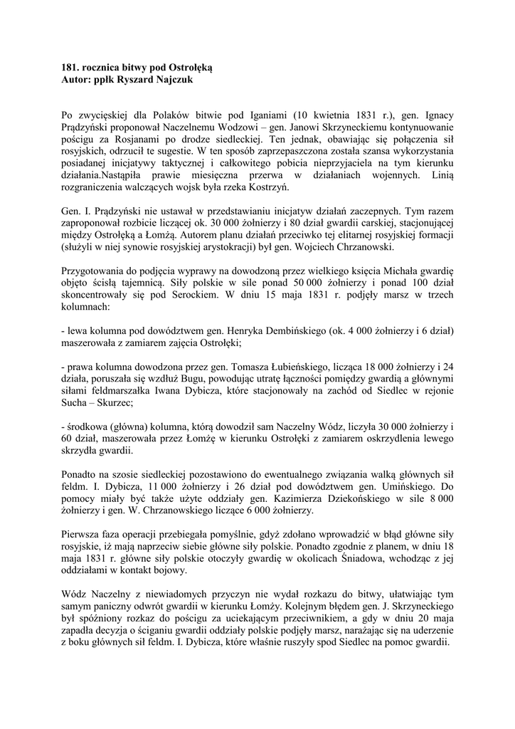 181. rocznica bitwy pod Ostrołęką Autor: ppłk Ryszard Najczuk Po zwycięskiej dla Polaków bitwie pod Iganiami (10 kwietnia 1831 r.), gen. Ignacy Prądzyński proponował Naczelnemu Wodzowi – gen. Janowi Skrzyneckiemu kontynuowanie pościgu za Rosjanami po drodze siedleckiej. Ten jednak, obawiając się połączenia sił rosyjskich, odrzucił te sugestie. W ten sposób zaprzepaszczona została szansa wykorzystania posiadanej inicjatywy taktycznej i całkowitego pobicia nieprzyjaciela na tym kierunku działania.Nastąpiła prawie miesięczna przerwa w działaniach wojennych. Linią rozgraniczenia walczących wojsk była rzeka Kostrzyń. Gen. I. Prądzyński nie ustawał w przedstawianiu inicjatyw działań zaczepnych. Tym razem zaproponował rozbicie liczącej ok. 30 000 żołnierzy i 80 dział gwardii carskiej, stacjonującej między Ostrołęką a Łomżą. Autorem planu działań przeciwko tej elitarnej rosyjskiej formacji (służyli w niej synowie rosyjskiej arystokracji) był gen. Wojciech Chrzanowski. Przygotowania do podjęcia wyprawy na dowodzoną przez wielkiego księcia Michała gwardię objęto ścisłą tajemnicą. Siły polskie w sile ponad 50 000 żołnierzy i ponad 100 dział skoncentrowały się pod Serockiem. W dniu 15 maja 1831 r. podjęły marsz w trzech kolumnach: - lewa kolumna pod dowództwem gen. Henryka Dembińskiego (ok. 4 000 żołnierzy i 6 dział) maszerowała z zamiarem zajęcia Ostrołęki; - prawa kolumna dowodzona przez gen. Tomasza Łubieńskiego, licząca 18 000 żołnierzy i 24 działa, poruszała się wzdłuż Bugu, powodując utratę łączności pomiędzy gwardią a głównymi siłami feldmarszałka Iwana Dybicza, które stacjonowały na zachód od Siedlec w rejonie Sucha – Skurzec; - środkowa (główna) kolumna, którą dowodził sam Naczelny Wódz, liczyła 30 000 żołnierzy i 60 dział, maszerowała przez Łomżę w kierunku Ostrołęki z zamiarem oskrzydlenia lewego skrzydła gwardii. Ponadto na szosie siedleckiej pozostawiono do ewentualnego związania walką głównych sił feldm. I. Dybicza, 11 000 żołnierzy i 26 dział pod dowództwem gen. Umińskiego. Do pomocy miały być także użyte oddziały gen. Kazimierza Dziekońskiego w sile 8 000 żołnierzy i gen. W. Chrzanowskiego liczące 6 000 żołnierzy. Pierwsza faza operacji przebiegała pomyślnie, gdyż zdołano wprowadzić w błąd główne siły rosyjskie, iż mają naprzeciw siebie główne siły polskie. Ponadto zgodnie z planem, w dniu 18 maja 1831 r. główne siły polskie otoczyły gwardię w okolicach Śniadowa, wchodząc z jej oddziałami w kontakt bojowy. Wódz Naczelny z niewiadomych przyczyn nie wydał rozkazu do bitwy, ułatwiając tym samym paniczny odwrót gwardii w kierunku Łomży. Kolejnym błędem gen. J. Skrzyneckiego był spóźniony rozkaz do pościgu za uciekającym przeciwnikiem, a gdy w dniu 20 maja zapadła decyzja o ściganiu gwardii oddziały polskie podjęły marsz, narażając się na uderzenie z boku głównych sił feldm. I. Dybicza, które właśnie ruszyły spod Siedlec na pomoc gwardii. W dniu 26 maja 1831 r. pod Ostrołęką doszło do starcia z głównymi siłami rosyjskimi feldm. I. Dybicza, które zaskoczyły Polaków szybkością marszu. Pierwszy atak przeważających sił rosyjskich zepchnął Brygadę Jazdy gen. Ludwika Bogusławskiego z pozycji obronnych wokół Ostrołęki. Podczas wycofywania nie zdołano wysadzić mostu na Narwi i piechota rosyjska przeszła na drugi brzeg rzeki, a dobrze ustawione działa na wysokim brzegu rozpoczęły morderczy ostrzał pozycji polskich zajmowanych w podmokłej dolinie nad Narwią. Na wkraczających Rosjan Wódz Naczelny posyłał pojedyncze bataliony, które były niszczone ogniem rosyjskich armat. Niepowodzenia piechoty miała powetować jazda. Niestety na nic się zdała brawura przeciwko uzbrojeniu. Tragiczne położenie Polaków uratowała szarża baterii lekkokonnej pod dowództwem ppłk. Józefa Bema, która skutecznym ogniem kartaczowym (porównywalnym z ogniem współczesnym karabinów maszynowych) uniemożliwiła dalszy atak Rosjan, co pozwoliło na wycofanie się wojsk polskich. Późnym wieczorem bitwa wygasła. Armia powstańcza została pobita, w szeregach zapanowała demoralizacja. Straty były dość wysokie, bo wyniosły ok. 7 000 żołnierzy. Z rosyjskich szeregów ubyło ok. 6 000 żołnierzy. Jednak nie straty były rzeczą najgorszą, a fakt, że Rosjanie przejęli inicjatywę wojenną. Działania Naczelnego Dowództwa spowodowały zachwianie wiary w dowódców i końcowe zwycięstwo powstania. Bibliografia: 1. 2. 3. 4. Dzieje oręża polskiego, pod red. Wiesława Jana Wysockiego. Warszawa 2000. Kukiel Marian, Zarys historii wojskowości w Polsce. Polskie tradycje wojskowe cz. 3, pod red. Józefa W. Dyskanta. Warszawa 1995. Sikorski Janusz, Zarys historii wojskowości powszechnej do końca wieku XIX. Warszawa 1972.