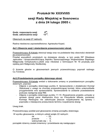 Protokół Nr XXXVI/05 sesji Rady Miejskiej w Sosnowcu z dnia 24 lutego 2005 r. Godz. rozpoczęcia sesji Godz. zakończenia sesji 905. 1315. Obecnych na sesji 27 radnych. Radna nieobecna usprawiedliwiona: Agnieszka Kopeć. Ad.1.Otwarcie sesji i stwierdzenie prawomocności obrad. Przewodniczący B.Kabała otworzył sesję oraz na podstawie listy obecności stwierdził jej prawomocność. Powitał wszystkich przybyłych na dzisiejsze obrady, w tym posła RP Wiesława Jędrusika i wiceprzewodniczącą Sejmiku Samorządowego Województwa Śląskiego Małgorzatę Ochęduszko-Ludwik oraz młodzież z Gimnazjum Nr 16 przybyłą pod opieką pani Małgorzaty Siedleckiej. O liczenie głosów w głosowaniach jawnych przewodniczący poprosił radnego Cz.Tondosa. Ad.2.Przedstawienie porządku dziennego obrad. Przewodniczący B.Kabała wniósł o dokonanie zmiany w przedstawionym porządku dziennym, poprzez: - Zdjęcie z porządku dziennego punktu 6. Sprawozdanie z działalności Komisji Statutowej z uwagi na chorobę przewodniczącej komisji, która uniemożliwiła przygotowanie w/w sprawozdania. Sprawozdanie to zostanie przedstawione podczas następnej sesji RM. - Zdjęcie z porządku dziennego punktu 11.15. Rozpatrzenie projektu uchwały w sprawie skargi pana Aleksandra Kury na Prezydenta Miasta, ponieważ Komisja Rewizyjna nie zakończyła jeszcze rozpatrywania tej sprawy i poprosiła o miesięczne przesuniecie terminu rozpatrzenia skargi. Uwag brak. Przewodniczący poddał pod głosowanie zmianę porządku dziennego. W wyniku głosowania, w którym udział wzięło 22 radnych: za – 22, przeciw - 0, wstrzymało się – 0, porządek dzienny został zmieniony i przedstawia się następująco: 1 1. 2. 3. 4. Otwarcie sesji i stwierdzenie prawomocności obrad. Przedstawienie porządku dziennego obrad. Przyjęcie protokołu z XXXV sesji RM. Informacje: 4.1. Przewodniczącego RM o działaniach Rady w okresie międzysesyjnym. 4.2. Prezydenta Miasta o pracy w okresie międzysesyjnym. 5. Odpowiedzi na interpelacje, zapytania i wnioski. 6. Sprawozdanie z działalności Komendy Miejskiej Policji i Straży Miejskiej w 2004r. 6.1.Wystąpienie przedstawicieli w/w jednostek. 6.2.Zapytania i uwagi radnych. 7. Sprawozdanie z realizacji Gminnego Programu Rozwiązywania Problemów Alkoholowych za 2004r. 7.1.Wystąpienie przedstawiciela Prezydenta Miasta. 7.2.Opinia Komisji Zdrowia, Rodziny i Opieki Społecznej. 7.3.Dyskusja. 8. Wspieranie inicjatyw kulturalnych przez dofinansowanie zgłoszonych projektów w zakresie kultury w roku 2004 oraz plany na 2005r. 8.1.Wystąpienie przedstawiciela Prezydenta Miasta. 8.2.Opinia Komisji Kultury, Sportu i Rekreacji. 8.3.Dyskusja. 9. Przyjęcie Regulaminu pierwszego zebrania wyborczego mieszkańców dzielnicy „Południe”, 10. Rozpatrzenie projektów uchwał w sprawie: 10.1.zmian budżetu miasta Sosnowca na 2005 rok (zmiana III), 10.2.zmiany Uchwały Nr 501/XXXII/04 Rady Miejskiej w Sosnowcu z dn. 25.11.2004 r. w sprawie ustalenia na rok 2005 stawek opłaty administracyjnej, 10.3.odstąpienia od obowiązku sporządzenia miejscowych planów zagospodarowania przestrzennego miasta Sosnowca w granicach terenów górniczych: „Bór III” i K.W.K. „Kazimierz-Juliusz”, 10.4.przystąpienia do sporządzenia miejscowego planu zagospodarowania przestrzennego miasta Sosnowca dla obszaru „Zagórze-rejon ul. Kosynierów”, 10.5.przekształcenia zakładu budżetowego pod nazwą Miejski Zakład Ulic i Mostów w Sosnowcu w jednostkę budżetową, 10.6.przejęcia na majątek Gminy Sosnowiec oświetlenia przy ul. Wojska Polskiego na odcinku od skrzyżowania z ul. Orląt Lwowskich nad torami kolejowymi, 10.7.określenia zadań z zakresu rehabilitacji zawodowej i społecznej osób niepełnosprawnych realizowanych przez miasto Sosnowiec w 2005 r. oraz podziału środków finansowych Państwowego Funduszu Rehabilitacji Osób Niepełnosprawnych przeznaczonych na realizację tych zadań, 10.8.nadania Gimnazjum Nr 18 w Sosnowcu imienia Bolesława Prusa, 10.9.zmiany Uchwały Nr 261/XIX/95 z dnia 21 grudnia 1995 r. z późniejszymi zmianami w sprawie powołania Zespołu Obsługi Finansowo-Księgowej Placówek Oświatowych Nr 3 w Sosnowcu ul. Wawel 13, 10.10.ustanowienia Nagrody Miasta Sosnowca dla najlepszego szkoleniowca sportowego, 2 10.11.przyznania Nagrody Artystycznej Miasta Sosnowca za 2004 rok, 10.12.przyznania Nagrody Miasta Sosnowca za 2004 rok za dorobek publicystyczno-naukowy, 10.13.przyznania Nagrody Miasta Sosnowca dla najlepszego sportowca w 2004 r., 10.14.skargi pana Stanisława Czajora na działania Miejskiego Zakładu Zasobów Lokalowych w Sosnowcu, 10.15.skargi pani Katarzyny Musialik na działania Powiatowego Urzędu Pracy w Sosnowcu. 11. Interpelacje, zapytania i wnioski. 12. Komunikaty. 13. Zakończenie obrad. Ad.3.Przyjęcie protokołu z XXXV sesji RM. Ponieważ nie zgłoszono uwag do treści protokołu przewodniczący B.Kabała poddał go pod głosowanie. W głosowaniu udział wzięło 22 radnych. W wyniku głosowania: za - 22, przeciw - 0, wstrzymało się – 0, protokół z XXXV sesji Rady Miejskiej został przyjęty. Ad.4.Informacje. Ad.4.1.Informacja Przewodniczącego RM o działaniach Rady w okresie międzysesyjnym. Przewodniczący B.Kabała przedstawił informację o pracach komisji RM w okresie międzysesyjnym, która stanowi załącznik do protokołu. Następnie przedstawił kalendarium wydarzeń, w których uczestniczyli radni: 29 stycznia: - Otwarcie sali sportowej i podsumowanie działalności Centrum Edukacji i Wychowania Młodzieży „Kana” (RM reprezentowali: B.Kabała, H.Sobańska, T.Bańbuła). 31 stycznia: - Szkolenie na temat absolutorium (uczestniczyli: B.Kabała, W.Ślęzak). 1 lutego: - Wystawa w związku z 500 letnią rocznicą urodzin M.Reja z Nagłowic w Miejskiej Bibliotece Publicznej. 3 2 lutego: - Sesja Młodzieżowej Rady Miasta poświęcona m.in. kampanii przed referendum konstytucyjnym UE (uczestniczyli: B.Kabała, J.Kazimierczak). 3 lu
