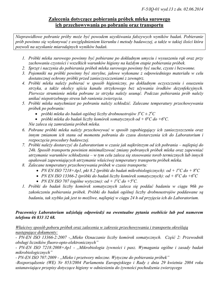 F-5/IQ-01 wyd.13 z dn. 02.06.2014 Zalecenia dotyczące pobierania próbek mleka surowego ich przechowywania po pobraniu oraz transportu Nieprawidłowe pobranie próby może być powodem uzyskiwania fałszywych wyników badań. Pobieranie prób powinno się wykonywać z uwzględnieniem kierunku i metody badawczej, a także w takiej ilości która pozwoli na uzyskanie miarodajnych wyników badań. 1. Próbki mleka surowego powinny być pobierane po dokładnym umyciu i wysuszeniu rąk oraz przy zachowaniu czystości i wszelkich warunków higieny na każdym etapie pobierania próbek. 2. Sprzęt i naczynia do pobierania próbek mleka surowego powinny być suche, czyste i bezwonne. 3. Pojemniki na próbki powinny być sterylne, jałowe wykonane z odpowiedniego materiału w celu dostatecznej ochrony próbki przed zanieczyszczeniami z zewnątrz. 4. Próbki mleka należy pobierać w sposób higieniczny, po dokładnym oczyszczeniu i osuszeniu strzyka, a także okolicy ujścia kanału strzykowego bez używania środków dezynfekcyjnych. Pierwsze strumienie mleka pobrane ze strzyka należy usunąć. Podczas pobierania prób należy unikać niepotrzebnego stresu lub ranienia zwierzęcia. 5. Próbki mleka natychmiast po pobraniu należy schłodzić. Zalecane temperatury przechowywania próbek po pobraniu: próbki mleka do badań ogólnej liczby drobnoustrojów 3oC ± 2oC próbki mleka do badań liczby komórek somatycznych od + 0oC do +6oC. Nie zaleca się zamrażania próbek mleka. 6. Pobrane próbki mleka należy przechowywać w sposób zapobiegający ich zanieczyszczeniu oraz innym zmianom ich stanu od momentu pobrania do czasu dostarczenia ich do Laboratorium i rozpoczęcia procedury badawczej. 7. Próbki należy dostarczyć do Laboratorium w czasie jak najkrótszym od ich pobrania – najlepiej do 24h. Sposób transportu powinien minimalizować zmiany pobranych próbek mleka oraz zapewniać utrzymanie warunków schłodzenia – w tym celu zaleca się stosowanie toreb termicznych lub innych opakowań zapewniających utrzymanie właściwej temperatury transportu próbek mleka. 8. Zalecane temperatury przechowywania próbek w czasie transportu: PN EN ISO 7218+Ap1, pkt 8.2 (próbki do badań mikrobiologicznych): od + 1oC do + 8oC PN EN ISO 13366-2 (próbki do badań liczby komórek somatycznych): od + 0oC do +6oC PN EN ISO 707 (ogólne wytyczne): od + 1oC do +5oC. 1. Próbki do badań liczby komórek somatycznych zaleca się poddać badaniu w ciągu 96h po zakończeniu pobierania próbek. Próbki do badań ogólnej liczby drobnoustrojów poddawane są badaniu, tak szybko jak jest to możliwe, najlepiej w ciągu 24 h od przyjęcia ich do Laboratorium. Pracownicy Laboratorium udzielają odpowiedzi na ewentualne pytania osobiście lub pod numerem telefonu 46 833 32 68. Właściwy sposób poboru próbek oraz zalecenia w zakresie przechowywania i transportu określają następujące dokumenty: - PN-EN ISO 13366-2:2007 -,,Mleko Oznaczanie liczby komórek somatycznych. Część 2: Przewodnik obsługi liczników fluoro-opto-elektronicznych” - PN-EN ISO 7218:2008+Ap1 - ,,Mikrobiologia żywności i pasz. Wymagania ogólne i zasady badań mikrobiologicznych” - PN-EN ISO 707:2009 - ,,Mleko i przetwory mleczne. Wytyczne do pobierania próbek” -Rozporządzenie (WE) Nr 853/2004 Parlamentu Europejskiego i Rady z dnia 29 kwietnia 2004 roku ustanawiające przepisy dotyczące higieny w odniesieniu do żywności pochodzenia zwierzęcego