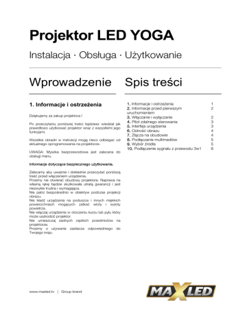 Projektor LED YOGA Instalacja · Obsługa · Użytkowanie Wprowadzenie 1. Informacje i ostrzeżenia Dziękujemy za zakup projektora ! Po przeczytaniu poniższej treści będziesz wiedział jak prawidłowo użytkować projektor wraz z wszystkimi jego funkcjami. Wszelkie obrazki w instrukcji mogą nieco odbiegać od aktualnego oprogramowania na projektorze. UWAGA: Myszka bezprzewodowa jest zalecana do obsługi menu. Informacje dotyczące bezpiecznego użytkowania. Zalecamy aby uważnie i dokładnie przeczytać poniższą treść przed włączeniem urządzenia. Prosimy nie otwierać obudowy projektora. Naprawa na własną rękę będzie skutkowała utratą gwarancji i jest niezwykle trudna i wymagająca. Nie patrz bezpośrednio w obiektyw podczas projekcji obrazu. Nie kładź urządzenia na poduszce i innych miękkich powierzchniach mogących zatkać wloty i wyloty powietrza. Nie włączaj urządzenia w otoczeniu kurzu lub pyłu który może uszkodzić projektor. Nie umieszczaj żadnych ciężkich przedmiotów na projektorze. Prosimy o używanie zasilacza odpowiedniego do Twojego kraju. www.maxled.tv | Group brand Spis treści 1. Informacje i ostrzeżenia 2. Informacje przed pierwszym uruchomieniem 3. Włączanie i wyłączanie 4. Pilot zdalnego sterowania 5. Interfejs urządzenia 6. Ostrość obrazu 7. Złącza na obudowie 8. Podłączanie multimediów 9. Wybór źródła 10. Podłączenie sygnału z przewodu 3w1 1 2 2 3 3 4 4 5 5 6 2 Informacje przed pierwszym uruchomieniem YOGA 1. Zgodnie z obrazkiem obok podłącz zasilacz do urządzenia. 2. Po prawidłowym podłączeniu zasilacza dioda na górnym panelu powinna zacząć się świecić. 3 Włączanie i wyłączanie YOGA Wciśnij przycisk urządzenie. www.maxled.tv | Group brand na obudowie projektora lub na pilocie aby uruchomić 4 Pilot zdalnego sterowania YOGA On/OFF Przewiń do tyłu Góra Prawo OK Play/Pauza Wyciszenie Przewiń do przodu Prawo Dół Wstecz Ściszenie Wybór źródła Zgłośnienie Menu Miejsce instalacji 2 baterii AAA 5 Interfejs urządzenia YOGA Po uruchomieniu urządzenia oczom użytkownika pokaże się następujący obraz po około 2-5 sekundach. www.maxled.tv | Group brand 6 Ostrość obrazu 7 Złącza na obudowie YOGA Umieść projektor na wprost wyświetlanego obrazu, a następnie za pomocą pokrętła z boku obudowy dostosuj korekcję trapezową aby uzyskać idealny kształt. YOGA www.maxled.tv | Group brand 8 Podłączanie multimediów 9 Wybór źródła YOGA YOGA Projektor wspiera wiele rodzajów urządzeń. Wybierz odpowiednie źródło sygnału za pomocą pilota lub myszy. www.maxled.tv | Group brand 10 Podłączenie sygnału z przewodu 3w1 YOGA Użyj przewodu 3w1 aby połączyć projektor ze źródłem obrazu. www.maxled.tv | Group brand