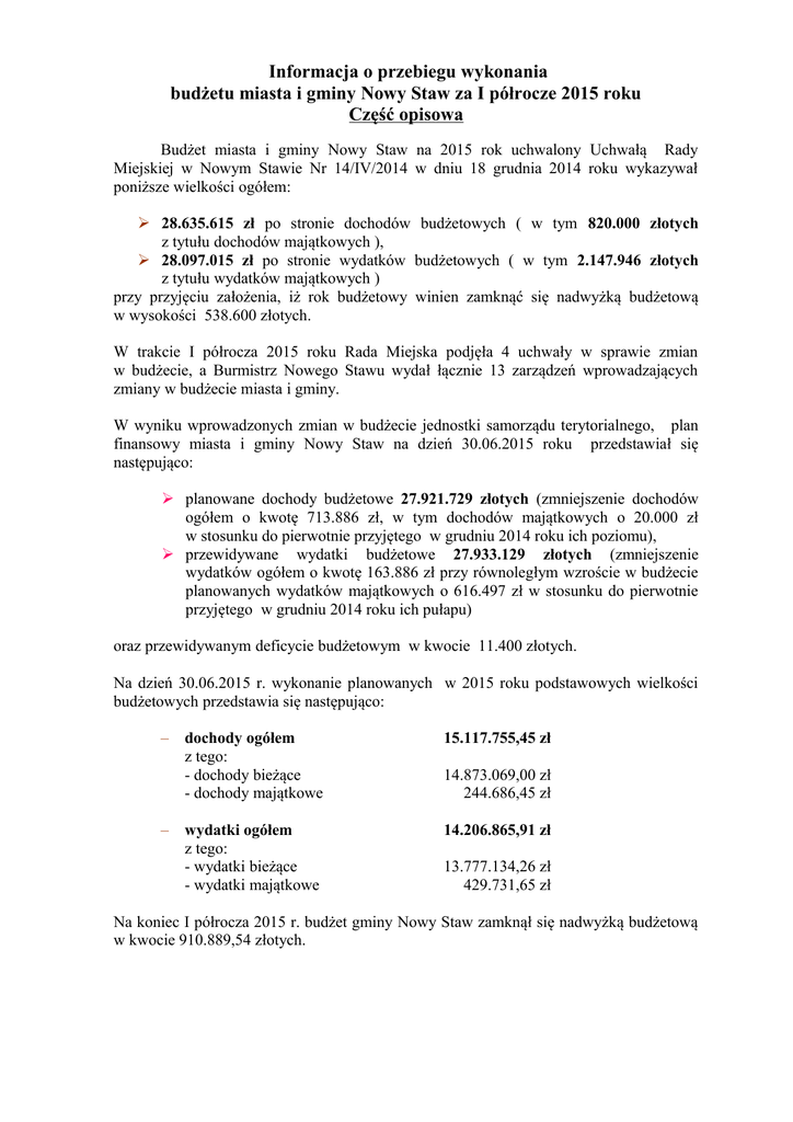 Informacja o przebiegu wykonania budżetu miasta i gminy Nowy Staw za I półrocze 2015 roku Część opisowa Budżet miasta i gminy Nowy Staw na 2015 rok uchwalony Uchwałą Rady Miejskiej w Nowym Stawie Nr 14/IV/2014 w dniu 18 grudnia 2014 roku wykazywał poniższe wielkości ogółem: 28.635.615 zł po stronie dochodów budżetowych ( w tym 820.000 złotych z tytułu dochodów majątkowych ), 28.097.015 zł po stronie wydatków budżetowych ( w tym 2.147.946 złotych z tytułu wydatków majątkowych ) przy przyjęciu założenia, iż rok budżetowy winien zamknąć się nadwyżką budżetową w wysokości 538.600 złotych. W trakcie I półrocza 2015 roku Rada Miejska podjęła 4 uchwały w sprawie zmian w budżecie, a Burmistrz Nowego Stawu wydał łącznie 13 zarządzeń wprowadzających zmiany w budżecie miasta i gminy. W wyniku wprowadzonych zmian w budżecie jednostki samorządu terytorialnego, plan finansowy miasta i gminy Nowy Staw na dzień 30.06.2015 roku przedstawiał się następująco: planowane dochody budżetowe 27.921.729 złotych (zmniejszenie dochodów ogółem o kwotę 713.886 zł, w tym dochodów majątkowych o 20.000 zł w stosunku do pierwotnie przyjętego w grudniu 2014 roku ich poziomu), przewidywane wydatki budżetowe 27.933.129 złotych (zmniejszenie wydatków ogółem o kwotę 163.886 zł przy równoległym wzroście w budżecie planowanych wydatków majątkowych o 616.497 zł w stosunku do pierwotnie przyjętego w grudniu 2014 roku ich pułapu) oraz przewidywanym deficycie budżetowym w kwocie 11.400 złotych. Na dzień 30.06.2015 r. wykonanie planowanych w 2015 roku podstawowych wielkości budżetowych przedstawia się następująco: – – dochody ogółem z tego: - dochody bieżące - dochody majątkowe 15.117.755,45 zł wydatki ogółem z tego: - wydatki bieżące - wydatki majątkowe 14.206.865,91 zł 14.873.069,00 zł 244.686,45 zł 13.777.134,26 zł 429.731,65 zł Na koniec I półrocza 2015 r. budżet gminy Nowy Staw zamknął się nadwyżką budżetową w kwocie 910.889,54 złotych. 22 PRZYCHODY BUDŻETU W II półroczu 2015 roku Gmina Nowy Staw planuje zaciągnąć kredyt długoterminowy w kwocie 550.000 złotych z przeznaczeniem pozyskanych środków na finansowanie zadań inwestycyjnych. W 2015 roku planowana jest spłata przez Stowarzyszenie Lokalna Grupa Działania Spichlerz Żuławski z/s w Malborku pożyczki w kwocie 11.400 złotych. Planowane przychody budżetu ogółem na dzień 31.12.2015 r. wyniosą 561.400 zł. ROZCHODY BUDŻETU Rozchody budżetu gminy ogółem na dzień 30.06.2015 r. wyniosły 305.000 zł z tytułu spłat kredytów i pożyczek zaciągniętych w latach ubiegłych (informacja z wykonania rozchodów została zamieszczona w załączniku nr 5 do niniejszego sprawozdania z wykonania budżetu). Koszty obsługi długu na dzień 30.06.2015 roku wynosiły łącznie 272.121,64 zł, co stanowi 48,48 % wielkości planowanych, z tego: • odsetki bankowe od zaciągniętych kredytów – 272.121,64 zł Wskaźnik spłaty kredytów łącznie z kosztami obsługi długu ( po wyłączeniach )w relacji do wykonanych dochodów budżetowych na dzień 30.06.2015 r. wyniósł 3,82 %. ZOBOWIĄZANIA Na dzień 30.06.2015 r. zobowiązania prawidłowe krótkoterminowe ogółem wynosiły 517.738,49 zł. Gmina Nowy Staw nie posiadała zobowiązań wymagalnych. Zadłużenie długoterminowe Gminy Nowy Staw z tytułu zaciągniętych kredytów i pożyczek oraz wyemitowanych obligacji komunalnych na dzień 30.06.2015 r. wynosiło 15.585.810,48 zł. Zadłużenie gminy na dzień 30.06.2015 r. wg instytucji finansowych przedstawia poniższe zestawienie: (w złotych) Lp. nazwa instytucji finansowej 1. 2. 3. 4. 5. 6. 7. PKO BP O/Kwidzyn BGK SA O/Gdańsk BGK SA O/Gdańsk BGK SA O/Gdańsk BGK SA O/Gdańsk Millenium Bank SA SBL Skórcz zadłużenie na 30.06.2015 ostateczny termin spłaty 150.000,00 975.888,98 502.829,90 1.113.091,60 1.589.000,00 585.000,00 240.000,00 31.12.2016 31.12.2018 31.12.2019 31.12.2019 31.12.2020 31.12.2019 31.12.2020 33 8. 9. 10. 11. 12. BS Nowy Staw PBS Kwidzyn PBS Kwidzyn PKO BP SA - obligacje PBS Kwidzyn Zadłużenie długoterminowe ogółem: 1.400.000,00 865.000,00 690.000,00 7.000.000,00 475.000,00 15.585.810,48 31.12.2020 31.03.2022 31.12.2022 31.12.2033 31.03.2018 NALEŻNOŚCI WYMAGALNE: Stan zaległości z tytułu najmu i dzierżawy mienia gminnego oraz podatków i opłat lokalnych na dzień 30.06.2015 r. wyniósł łącznie 2.638.277,27 zł. W stosunku do analogicznego okresu w 2014 roku nastąpił wzrost zadłużenia o 8,64 %. Strukturę zadłużenia na 30.06.2015 roku w porównaniu do jego stanu na 30.06.2014 roku obrazuje niżej zamieszczona tabela: Treść 1) najem i dzierżawa, w tym: – mieszkania komunalne – lokale użytkowe 2) zarząd, użytkowanie i użytkowanie Stan na 30-06-2014 1.101.641,19 1.032.893,02 68.748,17 Stan na 30-06-2015 1.172.750,31 1.104.019,22 68.731,09 % (+ wzrost) % (- spadek) + 6,45 + 6,89 - 0,02 72.392,52 86.910,15 + 20,05 271.081,24 2,50 271.078,74 212.251,62 982,00 211.269,62 - 21,70 x - 22,06 733.718,56 828.516,18 + 12,92 649.989,66 83.728,90 690.385,08 138.131,10 + 6,21 + 64,97 11.502,42 0,00 11.502,42 92.150,42 39.661,70 112.884,73 0,00 112.884,73 155.543,96 36.229,23 +881,40 0,00 +881,40 + 68,79 - 8,65 106.309,21 33.141,09 - 68,83 2.428.457,26 2.638.227,27 wieczyste nieruchomości oraz spłata wykupu lokali mieszkalnych i działek, przekształcenia prawa użytkowania wieczystego w prawo własności 3) podatek rolny, z tego: – osoby prawne – osoby fizyczne 4) podatek od nieruchomości, z tego: – – osoby prawne osoby fizyczne 5) podatek od środków transportu – osoby prawne – osoby fizyczne 6) opłata za gospodarowanie odpadami 7) podatki i opłaty, które wpływają do Urzędu Skarbowego (podatek od spadków i darowizn, podatek opłacany w formie karty podatkowej) 8) pozostałe zaległości z tytułu dochodów budżetowych Razem + 8,64 % 44 Stan zaległości z tytułu nieuregul
