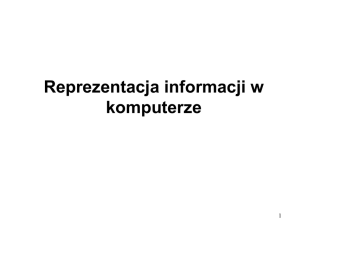 Reprezentacja informacji w komputerze 1 Agenda - O czym będzie • System informacyjny • Systemy liczenia • Wielkość danych. Bit, Bajt • Systemy kodowania 2 SYSTEM INFORMACYJNY POJĘCIE, STRUKTURA, WŁAŚCIWOŚCI • System informacyjny - uporządkowany układ odpowiednich elementów, charakteryzujących się pewnymi właściwościami i połączonych wzajemnie określonymi relacjami 3 Zasoby systemu informacyjnego zapewniające jego funkcjonowanie • Zasoby systemu informacyjnego zapewniające jego funkcjonowanie to: – ludzkie - potencjał wiedzy ukierunkowany na rozwiązywanie problemów systemu; uŜytkownicy pełniący role nadawców i odbiorców oraz adresaci technologii informacyjnych; – informacyjne - zbiory danych przeznaczone do przetwarzania (bazy danych, metod, modeli, wiedzy); – proceduralne - algorytmy, procedury, oprogramowanie; – techniczne - sprzęt komputerowy, sieci telekomunikacyjne, nośniki danych. 4 Struktura systemu informacyjnego • funkcjonalna – zbiór zadań i celów systemu oraz ich wzajemnych współzaleŜności; – system informacyjny jest związany bezpośrednio z funkcjami wytwarzania i zarządzania obiektem gospodarczym; – struktura ta jest nadrzędna w stosunku do pozostałych struktur, moŜna ją rozpatrywać w przekroju struktury organizacyjnej lub przekroju struktury procesów gospodarczych; – wieloprzekrojowe ujęcie struktury funkcjonalnej pozwala zaprezentować system kompleksowo i obiektywnie z punktu widzenia celów systemów wytwarzania i zarządzania; 5 Struktury systemu informacyjnego • informacyjna - składa się z zasobów informacyjnych (zbiory danych wraz z algorytmami ich przetwarzania) i zbioru meta informacji (zbiór informacji o zasobach systemu - katalog systemu); struktura informacyjna systemu jest ściśle powiązana z jego strukturą funkcjonalną (realizacja kaŜdej funkcji i zadania angaŜuje określone elementy struktury informacyjnej); • techniczna - technologiczna - utworzona z zastosowanych w przetwarzaniu środków technicznych i stosowanych w nim technologii przetwarzania danych; 6 MIEJSCE I ROLA SYSTEMU INFORMACYJNEGO W OBIEKCIE GOSPODARCZYM • Funkcje systemu informacyjnego: • gromadzenie informacji - jej istotą jest zbieranie, rejestrowanie i ewidencjonowanie danych i komunikatów gospodarczych, czyli informacyjne zasilanie obiektu i jego poszczególnych komórek organizacyjnych; w czasie gromadzenia dane i ich zbiory podlegają operacjom pomocniczym; • przetwarzanie informacji - wykonywanie na nich typowych operacji arytmetycznych i logicznych; z danych źródłowych uzyskuje się w wyniku ich przetworzenia informacje wynikowe Ŝądane przez odbiorców; 7 MIEJSCE I ROLA SYSTEMU INFORMACYJNEGO W OBIEKCIE GOSPODARCZYM • przechowywanie informacji - polega na zapisaniu danych na trwałych nośnikach w postaci i formie umoŜliwiających ich łatwe wykorzystanie w kolejnych procesach; przechowywane (zwłaszcza archiwizowane) informacje podlegają operacjom dodatkowym takim jak kompresja; • prezentowanie informacji - polega na dostarczeniu odbiorcom niezbędnych informacji wynikowych. 8 Wymagania wobec informacji gospodarczej • rzetelność - informacje muszą wiernie opisywać operacje gospodarcze i stany; • selektywność - informacje powinny być dobrane pod kątem charakterystyk opisywanego problemu czy stosowanej metody; • adresowalność - zakres przedmiotowy, dokładność i aktualność informacji muszą być dostosowane do indywidualnych potrzeb określonego odbiorcy, wyznaczanych przez charakter wykonywanych przez niego działań; • odpowiedniość - zgodność z konkretnym zapotrzebowaniem na informacje; • terminowość - dostarczanie informacji we właściwym czasie; 9 System Informacyjny • Podstawowym zadaniem systemu informacyjnego jest dostarczanie uŜytkownikom informacji umoŜliwiających im podejmowanie i wprowadzanie w Ŝycie decyzji regulujących funkcjonowanie obiektu gospodarczego. • System informacyjny w obiekcie gospodarczym zwykle lokalizuje się w systemie zarządzania. • System informacyjny integruje funkcjonowanie dwóch podsystemów obiektu gospodarczego: zarządzania oraz wytwarzania i obejmuje swym zasięgiem całą działalność obiektu gospodarczego. 10 SYSTEM INFORMACYJNY SYSTEM ZARZĄDZANIA SYSTEM INFORMATYCZNY • System informacyjny zapewnia dokumentacyjną obsługę przestrzenno-czasowego przebiegu procesów produkcji w systemie wytwarzania, a takŜe gromadzi informacje nieodzowne w procesie podejmowania decyzji gospodarczych w systemie zarządzania. • System zarządzania steruje prawidłowym i skutecznym wykonawstwem zadań całego środowiska gospodarowania, w tym systemu wytwarzania; wpływa na wszystkie elementy w celu realizacji celi i funkcji obiektu gospodarczego. • System informatyczny to system informacyjny, w którym procesy przetwarzania danych i procesy komunikacji realizowane są automatycznie (za pomocą technik komputerowych). 11 Systemy liczenia • Systemy liczenia - sposób tworzenia liczb ze znaków cyfrowych oraz zbiór reguł umoŜliwiających wykonywanie operacji arytmetycznych na liczbach. • Dla dowolnego systemu liczenia istnieje zbiór cyfr, z których tworzy się liczby. • Ilość róŜnych cyfr systemu nazywa się jego podstawą. • Systemy liczenia dzielą się na: – pozycyjne - wartość liczbowa cyfry zaleŜy od jej umiejscowienia (pozycji) w liczbie – Niepozycyjne - poszczególne cyfry zachowują swą wartość liczbową bez względu na miejsce, jakie zajmują w liczbie. Przykładem takiego systemu jest system rzymski. 12 Systemy liczenia Obecnie większość ludzi licząc posługuje się dziesiętnym systemem liczenia. jednak ... – amerykanie dzielą stopy na 12 cali, – rok dzielimy na 12 miesięcy – tydzień dzielimy na 7 dni – dzień na dwa okresy po 12 godzin. – – – – System rzymski System dziesiętny System binarny System szesnastkowy 13 System dziesiętny • Cyfry od 0 