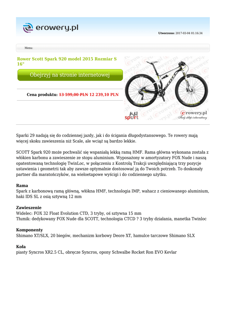 Utworzono: 2017-03-04 01:16:34 Menu: Rower Scott Spark 920 model 2015 Rozmiar S 16" Obejrzyj na stronie internetowej Cena produktu: 13 599,00 PLN 12 239,10 PLN Sparki 29 nadają się do codziennej jazdy, jak i do ścigania długodystansowego. Te rowery mają więcej skoku zawieszenia niż Scale, ale wciąż są bardzo lekkie. SCOTT Spark 920 może pochwalić się wspaniałą lekką ramą HMF. Rama główna wykonana została z włókien karbonu a zawieszenie ze stopu aluminium. Wyposażony w amortyzatory FOX Nude i naszą opatentowaną technologię TwinLoc, w połączeniu z Kontrolą Trakcji uwzględniającą trzy pozycje ustawienia i geometrii tak aby zawsze optymalnie dostosować ją do Twoich potrzeb. To doskonały partner dla maratończyków, na wieloetapowe wyścigi i do codziennego użytku. Rama Spark z karbonową ramą główną, włókna HMF, technologia IMP, wahacz z cieniowanego aluminium, haki IDS SL z osią sztywną 12 mm Zawieszenie Widelec: FOX 32 Float Evolution CTD, 3 tryby, oś sztywna 15 mm Tłumik: dedykowany FOX Nude dla SCOTT, technologia CTCD ? 3 tryby działania, manetka Twinloc Komponenty Shimano XT/SLX, 20 biegów, mechanizm korbowy Deore XT, hamulce tarczowe Shimano SLX Koła piasty Syncros XR2.5 CL, obręcze Syncros, opony Schwalbe Rocket Ron EVO Kevlar Rozmiary ram - Klamki hamulców Shimano SLX BL-M675-B Disc Hamulce Shimano SLX BR-M675 Disc 180/F and 160/Rmm SM-RT64 CL Rotor Mechanizm korbowy Oś korbowodu Prowadzenie łańcucha Kierownica Mostek/ Wspornik kierownicy Shimano XT FC-M785 Hollowtech 2 38Ax24A T Shimano SM-BB71-41A / shell 41x89.5mm Syncros FL1.5 Tbar Alloy 7050 D.B. / T shape Flat / 9° / 700mm Syncros Pro lock-on grips Syncros XR1.5 -10° 7050 Alloy / 31.8mm / 1 1/8" Pedały - Sztyca Syncros FL1.5 / 31.6mm Siodło Przeznaczenie Piasta przód Syncros XR2.0 / CROM rails Męski Syncros XR2.5 CL / 15mm made by DT Swiss Piasta tył Syncros XR2.5 CL / 12 × 142mm / RWS axle made by DT Swiss Łańcuch Shimano CN-HG54 Kaseta/ wolnobieg Shimano CS-HG81-10 11-36 T Szprychy DT Swiss Competition 2.0 -1.8-2.0 Black Obręcze Syncros XR2.5 28H Opony Schwalbe Rocket Ron EVO / 2.25 127EPI Kevlar Bead PaceStar compound Wyposażenie dodatkowe Typ roweru Waga Tylny amortyzator /Damper Rozmiar kół Sezon Rodzina Górski 11,90kg FOX Nude / SCOTT custom w. travel / geo adj CTCD 3 modes: Climb - Traction Control - Descend / reb. Adj. 29" 2015 - Rama Spark Carbon / IMP technology / HMF / BB92 / Alloy swingarm with 160PM U-Mono Link / Tapered Headtube IDS SL DM dropouts for 142 × 12mm BB height adj. Widelec/amortyzator FOX 32 Float Evolution CTD Air CTD damper with 3 modes 15mm QR axle / tapered steerer reb. Adj. Stery Syncros / VP-J205AM1 / 1.5" 1 1/8" semi integ. OD 50/61mm / ID 44/55mm Przerzutka przód Shimano SLX FD-M675-E2 / DM Przerzutka tył Shimano XT RD-M786 SGS/ DM Shadow Type / 20 Speed Manetki Shimano SLX SL-M670-I Rapidfire Plus / 2 way release Ispec clamp Mimo dołożenia wszelkich starań nie gwarantujemy, że publikowane opisy i specyfikacje techniczne niezawierają uchybień lub błędów, które nie mogą jednak być podstawą do roszczeń. W przypadku jakichkolwiek wątpliwości, przed podjęciem decyzji prosimy o kontakt. Adres: www.erowery.pl Telefon: 605 515 185, 34 361 16 71 Email: [email protected]