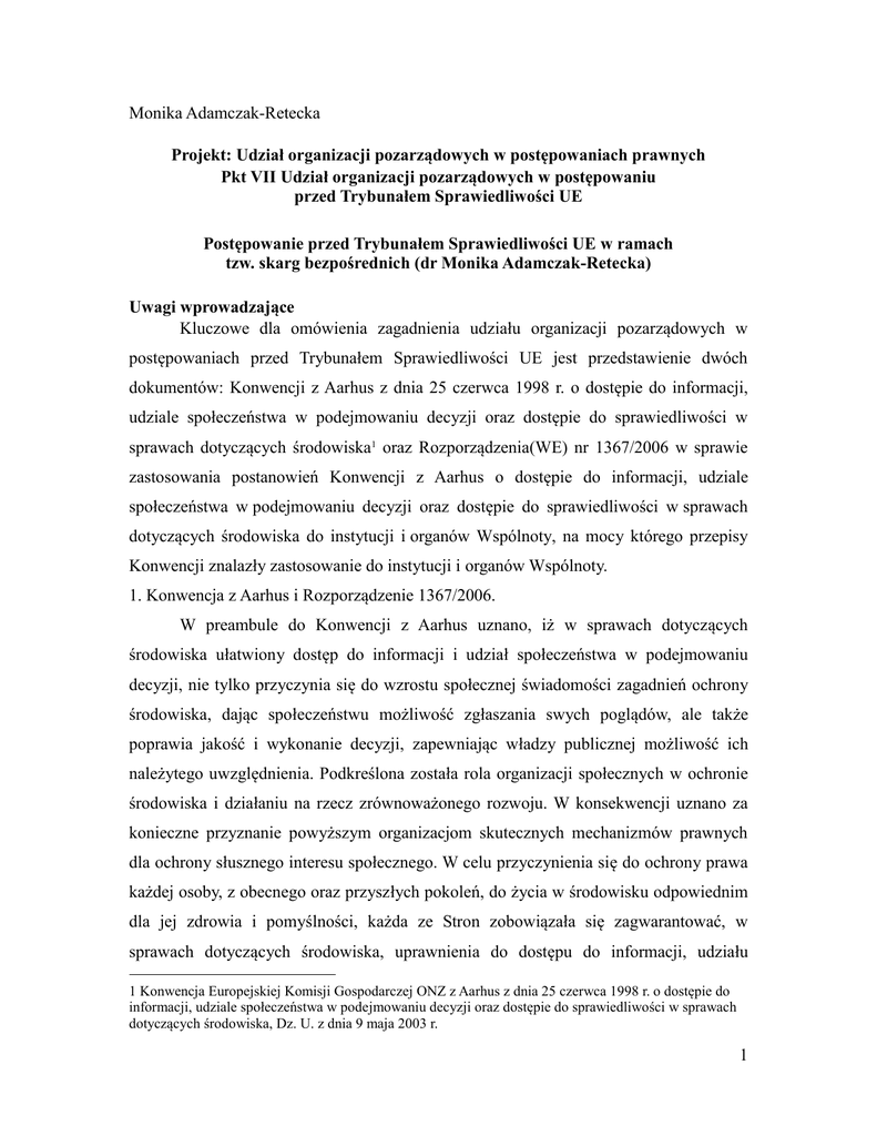 Monika Adamczak-Retecka Projekt: Udział organizacji pozarządowych w postępowaniach prawnych Pkt VII Udział organizacji pozarządowych w postępowaniu przed Trybunałem Sprawiedliwości UE Postępowanie przed Trybunałem Sprawiedliwości UE w ramach tzw. skarg bezpośrednich (dr Monika Adamczak-Retecka) Uwagi wprowadzające Kluczowe dla omówienia zagadnienia udziału organizacji pozarządowych w postępowaniach przed Trybunałem Sprawiedliwości UE jest przedstawienie dwóch dokumentów: Konwencji z Aarhus z dnia 25 czerwca 1998 r. o dostępie do informacji, udziale społeczeństwa w podejmowaniu decyzji oraz dostępie do sprawiedliwości w sprawach dotyczących środowiska1 oraz Rozporządzenia(WE) nr 1367/2006 w sprawie zastosowania postanowień Konwencji z Aarhus o dostępie do informacji, udziale społeczeństwa w podejmowaniu decyzji oraz dostępie do sprawiedliwości w sprawach dotyczących środowiska do instytucji i organów Wspólnoty, na mocy którego przepisy Konwencji znalazły zastosowanie do instytucji i organów Wspólnoty. 1. Konwencja z Aarhus i Rozporządzenie 1367/2006. W preambule do Konwencji z Aarhus uznano, iż w sprawach dotyczących środowiska ułatwiony dostęp do informacji i udział społeczeństwa w podejmowaniu decyzji, nie tylko przyczynia się do wzrostu społecznej świadomości zagadnień ochrony środowiska, dając społeczeństwu możliwość zgłaszania swych poglądów, ale także poprawia jakość i wykonanie decyzji, zapewniając władzy publicznej możliwość ich należytego uwzględnienia. Podkreślona została rola organizacji społecznych w ochronie środowiska i działaniu na rzecz zrównoważonego rozwoju. W konsekwencji uznano za konieczne przyznanie powyższym organizacjom skutecznych mechanizmów prawnych dla ochrony słusznego interesu społecznego. W celu przyczynienia się do ochrony prawa każdej osoby, z obecnego oraz przyszłych pokoleń, do życia w środowisku odpowiednim dla jej zdrowia i pomyślności, każda ze Stron zobowiązała się zagwarantować, w sprawach dotyczących środowiska, uprawnienia do dostępu do informacji, udziału 1 Konwencja Europejskiej Komisji Gospodarczej ONZ z Aarhus z dnia 25 czerwca 1998 r. o dostępie do informacji, udziale społeczeństwa w podejmowaniu decyzji oraz dostępie do sprawiedliwości w sprawach dotyczących środowiska, Dz. U. z dnia 9 maja 2003 r. 1 społeczeństwa w podejmowaniu decyzji oraz dostępu do wymiaru sprawiedliwości zgodnie z postanowieniami Konwencji2. Zgodnie z treścią Konwencji, „społeczeństwo” oznacza jedną lub więcej osób fizycznych lub prawnych oraz, zgodnie z krajowym ustawodawstwem lub praktyką, ich stowarzyszenia, organizacje lub grupy. W konwencji zastosowane zostało także pojęcie: „zainteresowana społeczność”, dla oznaczenia części społeczeństwa, która jest lub może być dotknięta skutkami lub ma interes w podejmowanej decyzji dotyczącej środowiska. Organizacje pozarządowe działające na rzecz ochrony środowiska i spełniające wymagania przewidziane w prawie krajowym uważa się za posiadające interes w tym zakresie3. O prawach „zainteresowanej społeczności” jest następnie mowa w części Konwencji poświęconej udziałowi społeczeństwa w podejmowaniu decyzji dotyczących konkretnych przedsięwzięć. Mianowicie, zainteresowana społeczność ma być informowana na wczesnym etapie procedury podejmowania decyzji w sprawach dotyczących środowiska, w sposób właściwy, terminowy i skuteczny, interalia, o: planowanym przedsięwzięciu i treści wniosku, na podstawie którego decyzja ma być podjęta, rodzaju możliwych rozstrzygnięć, władzy publicznej właściwej do wydania decyzji, przewidywanej procedurze oraz fakcie, czy przedsięwzięcie podlega krajowemu lub transgranicznemu postępowaniu w sprawie oceny oddziaływania na środowisko4. Zainteresowana społeczność ma mieć także zapewniony dostęp do wymiaru sprawiedliwości, a obowiązek ten spoczywa na stronach Konwencji. Zgodnie z jej treścią, każda ze stron zapewnia, w ramach krajowego porządku prawnego, że członkowie zainteresowanej społeczności mający wystarczający interes lub powołujący się na naruszenie uprawnień, jeśli przepisy postępowania administracyjnego strony wymagają tego jako przesłanki, mają dostęp do procedury odwoławczej przed sądem lub innym niezależnym i bezstronnym organem powołanym z mocy ustawy, dla kwestionowania legalności z przyczyn merytorycznych lub formalnych każdej decyzji, działania lub zaniechania w sprawach regulowanych postanowieniami Konwencji, z pewnymi zastrzeżeniami5. Jak trafnie zauważa A. Wilk, artykuł dotyczący dostępu do 2 Art. 1 Konwencji z Aarhus. 3 Art. 2 pkt. 4 i 5 Konwencji z Aarhus. 4 Art. 6 pkt. 2, 5 i 6 Konwencji z Aarhus. 5 Art. 9 pkt. 2 Konwencji z Aarhus. 2 wymiaru sprawiedliwości dotyczy ogólnie rzecz biorąc dwóch sytuacji. Z jednej strony gwarantuje możliwość poszukiwania ochrony w przypadku naruszenia przez władze uprawnień społeczeństwa związanych z dostępem do informacji oraz udziałem w podejmowaniu decyzji, z drugiej strony zaś przewiduje możliwość występowania do sądu z roszczeniami w interesie publicznym tzn. np. występowania do sądu z roszczeniem przeciw zakładom niestosującym się do krajowych przepisów ochrony środowiska6. W literaturze przedmiotu podkreśla się, iż Konwencja z Aarhus nie jest typową konwencją z dziedziny ochrony środowiska. Nacisk został w niej położony nie tyle na samą ochronę środowiska, co na konieczność poszanowania prawa człowieka do czystego środowiska.7Jako ogólną zasadę przyjęto, iż prawa gwarantowane w ramach trzech filarów Konwencji z Aarhus, a mianowicie dostępu do informacji, udziału społeczeństwa w podejmowaniu decyzji oraz dostępu do wymiaru sprawiedliwości w sprawach dotyczących środowiska przysługują bez dyskryminacji ze względu na obywatelstwo, narodowość lub miejs