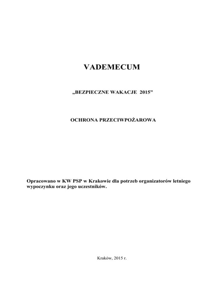 VADEMECUM „BEZPIECZNE WAKACJE 2015” OCHRONA PRZECIWPOŻAROWA Opracowano w KW PSP w Krakowie dla potrzeb organizatorów letniego wypoczynku oraz jego uczestników. Kraków, 2015 r. 2 Wskazania dla organizatorów letniego wypoczynku dzieci i młodzieży w zakresie bezpieczeństwa pożarowego. 1. Wymagania w zakresie posiadanej dokumentacji Obiekt przeznaczony na letni wypoczynek dzieci i młodzieży powinien mieć: 1. Pozytywną opinię właściwej miejscowo komendy powiatowej (miejskiej) Państwowej Straży Pożarnej w zakresie spełnienia przez obiekt wymagań przeciwpożarowych (podstawa prawna: rozporządzenie Ministra Edukacji Narodowej z dnia 21 stycznia 1997 r. w sprawie warunków, jakie muszą spełniać organizatorzy wypoczynku dla dzieci i młodzieży szkolnej, a także zasad jego organizowania i nadzorowania – Dz. U. Nr 12, poz. 67 z późn. zm.). Uwaga: Czasokres ważności opinii na podstawie przeprowadzonych czynności kontrolno rozpoznawczych w obiekcie, zebranych lub dostarczonych przez właściciela, zarządzającego obiektem czy znajdujących się w komendzie dokumentów i własnego rozpoznania określa właściwy terenowo komendant powiatowy/miejski Państwowej Straży Pożarnej. Z reguły stosuje się zasadę że ważność opinii nie powinna przekraczać dwóch sezonów wypoczynkowych. 2. Opracowaną tzw. „Instrukcję bezpieczeństwa pożarowego”, w której uwzględniony powinien być fakt przeznaczenia obiektu na letni wypoczynek dzieci i związane z tym wymagania i zasady postępowania w przypadku pożaru czy innego zagrożenia (podstawa prawna: rozporządzenie Ministra Spraw Wewnętrznych i Wewnętrznych z dnia 7 czerwca 2010 r. w sprawie ochrony przeciwpożarowej budynków, innych obiektowa budowlanych i terenów - Dz. U. Nr 109, poz. 719). Uwaga: Instrukcja bezpieczeństwa pożarowego nie jest wymagana dla obiektów lub ich części, gdy kubatura brutto budynku lub jego części stanowiącej odrębną strefę pożarową nie przekracza 1000 m3, powierzchnia strefy pożarowej obiektu innego niż budynek nie przekracza 1000 m². Instrukcja powinna być poddawana okresowej aktualizacji co najmniej raz na dwa lata, oraz po takich zmianach sposobu użytkowania obiektu, które wpływają na zmianę warunków ochrony przeciwpożarowej. 3. Aktualne protokoły badań instalacji technicznych budynku (elektryczna, gazowa, odgromowa przewodów kominowych, spalinowych, wentylacyjnych i inne wpływające na stan bezpieczeństwa budynku, np. systemu sygnalizacji pożaru, awaryjnego oświetlenia, gaśnicza, itp.) - podstawa prawna: - ustawa z dnia 7 lipca 1994 r. Prawo budowlane – (Dz. U. z 2013 r., poz. 1409 – jednolity tekst). 3 2. Bezpieczeństwo przeciwpożarowe na kolonii, obozie, biwaku w lesie bezpieczne spędzenie wakacji. Obiekty przeznaczone na letni czy zimowy wypoczynek dzieci i młodzieży powinny być odpowiednio wykonane i wyposażone w odpowiedni sprzęt i urządzenia techniczne, zgodnie z przepisami szczegółowymi, zapewniającymi bezpieczeństwo wypoczynku. Państwowa Straż Pożarna na mocy odpowiednich regulacji prawnych dokonuje przed sezonem wypoczynkowym kontroli obiektów wypoczynku. Kierownik kolonii czy innej formy letniego wypoczynku dzieci i młodzieży oraz wychowawcy, powinni po dotarciu do miejsca wypoczynku zapoznać się z „Instrukcją bezpieczeństwa pożarowego”, z warunkami ewakuacji dzieci i młodzieży z obiektu. Powinni także zorganizować wespół z właściwym administratorem czy organizatorem wypoczynku próbę ewakuacji dzieci z budynku. Najczęstszą przyczyną pożarów powstających podczas letniego wypoczynku dzieci i młodzieży jest: nieostrożne obchodzenie się z ogniem oraz grzewczymi urządzeniami elektrycznymi, gazowymi i na paliwo ciekłe i stałe (piece, piecyki, kuchenki, ogrzewacze pomieszczeń i inne) często spowodowane niewłaściwymi zabawami i nieświadomością dzieci oraz brakiem nadzoru ze strony dorosłych. Statystycznie najczęściej dzieci i młodzież wywołują pożary poprzez: - zabawę z zapałkami, zapalniczką, - palenie w ukryciu papierosów, - rozpalanie ognisk i zabawy z ogniem w pobliżu materiałów palnych ( sterty słomy, siana, sucha trawa i pozostałości roślinne, składowiska i magazyny makulatury, pudeł kartonowych, drewna, stacji i magazynów paliw, gazów palnych, stodół, zabudowań z materiałów palnych, lasów, itp.). Pamiętaj! W obiektach letniego wypoczynku dzieci i młodzieży oraz na terenie przyległym do nich zabrania się: - zabawy z zapałkami, zapalniczkami, - rozniecania ognia bez zezwolenia i podczas nieobecności osób dorosłych, - używania świec, kaganków, petard, wyrobów pirotechnicznych oraz innych źródeł światła wykorzystujących otwarty ogień, - wypuszczania tzw. „lampionów szczęścia”, - stosowania do mycia i prania odzieży cieczy łatwopalnych, - suszenia odzieży i materiałów palnych bezpośrednio na piecach, - ustawiania elektrycznych i gazowych urządzeń grzewczych bezpośrednio na podłożach palnych w odległościach mniejszych niż 0,5 m od materiałów palnych, - używania uszkodzonych urządzeń elektrycznych oraz używania ich w sposób niezgodny z instrukcją obsługi, - stosowania na osłony punktów świetlnych materiałów palnych, - składowania materiałów palnych na drogach komunikacji ogólnej służących celom ewakuacji lub umieszczenie przedmiotów na tych drogach w sposób zmniejszający ich szerokość albo wysokość poniżej wymaganych wartości, - składowanie materiałów palnych na nieużytkowanych poddaszach oraz na drogach komunikacji ogólnej w piwnicach, - rozpalanie ognisk lub wysypywanie gorącego popiołu i żużla lub wypalanie wierzchniej warstwy gleby i traw, w miejscu umożliwiającym zapalenie się materiałów palnych albo sąsiednich obiektów, 4 - - składowanie poza budynkami, w odległości mniejszej niż 4 m od granicy działki, materiałów palnych, w tym pozostałości roślinnyc