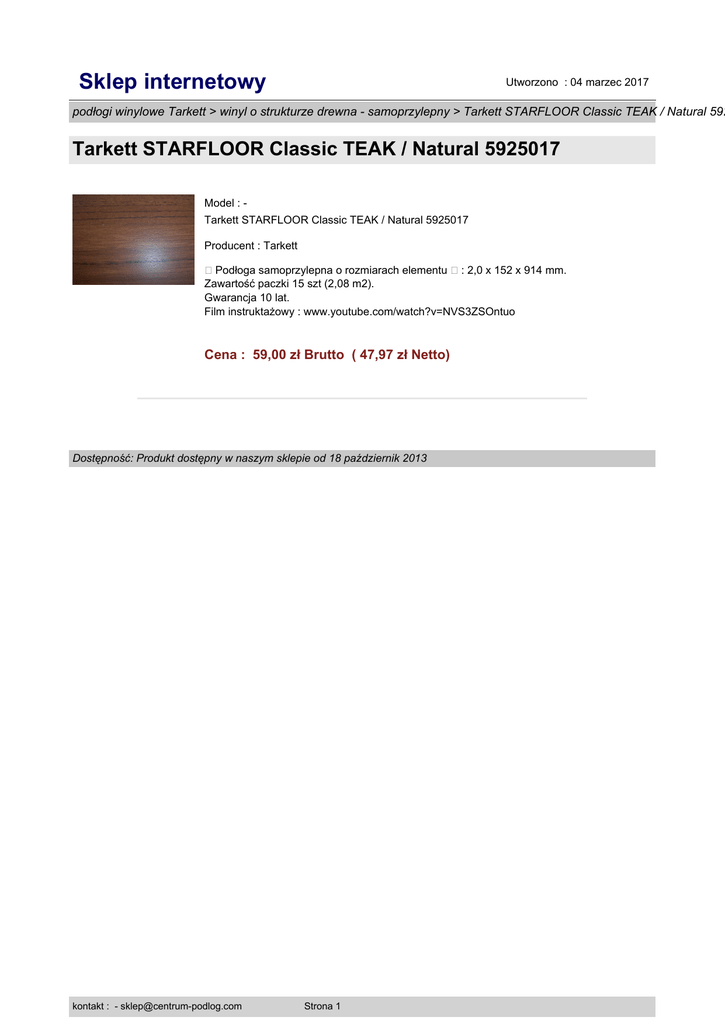 Sklep internetowy Utworzono : 04 marzec 2017 podłogi winylowe Tarkett > winyl o strukturze drewna - samoprzylepny > Tarkett STARFLOOR Classic TEAK / Natural 592 Tarkett STARFLOOR Classic TEAK / Natural 5925017 Model : Tarkett STARFLOOR Classic TEAK / Natural 5925017 Producent : Tarkett �Podłoga samoprzylepna o rozmiarach elementu �: 2,0 x 152 x 914 mm. Zawartość paczki 15 szt (2,08 m2). Gwarancja 10 lat. Film instruktażowy : www.youtube.com/watch?v=NVS3ZSOntuo Cena : 59,00 zł Brutto ( 47,97 zł Netto) Dostępność: Produkt dostępny w naszym sklepie od 18 październik 2013 kontakt : - [email protected] Strona 1