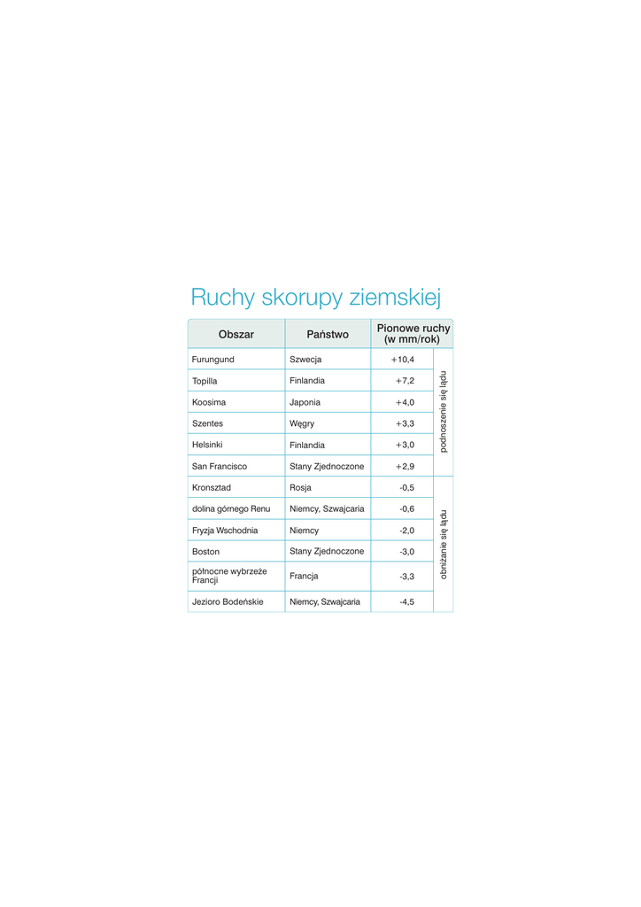 Ruchy skorupy ziemskiej Pionowe ruchy (w mm/rok) Furungund Szwecja +10,4 Topilla Finlandia +7,2 Koosima Japonia +4,0 Szentes Wêgry +3,3 Helsinki Finlandia +3,0 San Francisco Stany Zjednoczone +2,9 Kronsztad Rosja -0,5 dolina górnego Renu Niemcy, Szwajcaria -0,6 Fryzja Wschodnia Niemcy -2,0 Boston Stany Zjednoczone -3,0 pó³nocne wybrze¿e Francji Francja -3,3 Jezioro Bodeñskie Niemcy, Szwajcaria -4,5 podnoszenie siê l¹du Pañstwo obni¿anie siê l¹du Obszar