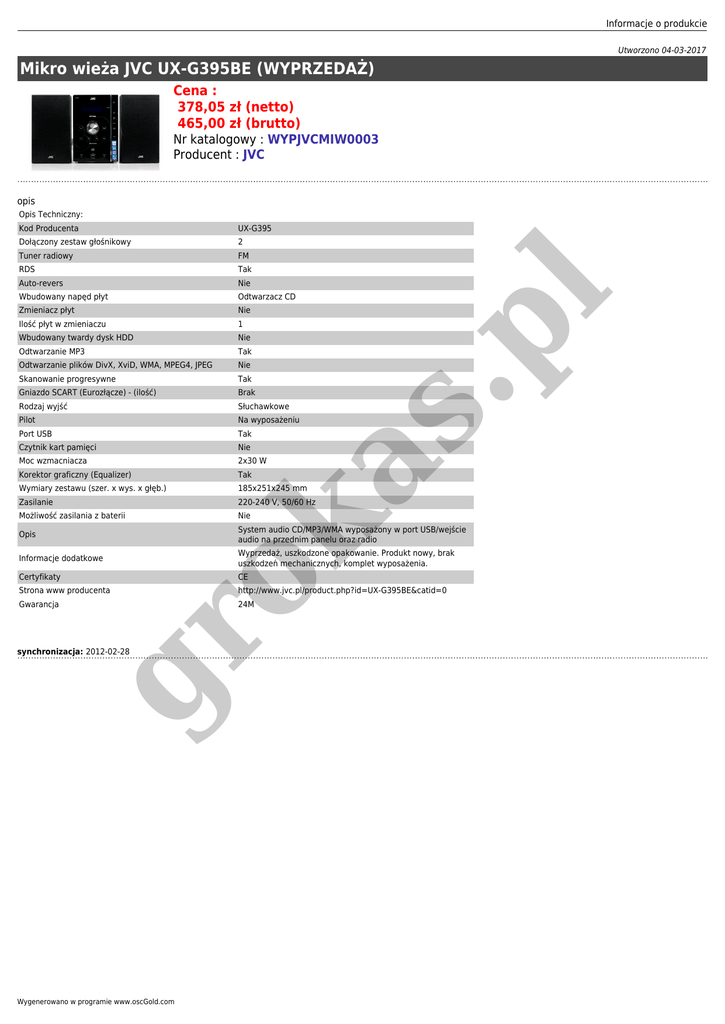 Informacje o produkcie Utworzono 04-03-2017 Mikro wieża JVC UX-G395BE (WYPRZEDAŻ) Cena : 378,05 zł (netto) 465,00 zł (brutto) Nr katalogowy : WYPJVCMIW0003 Producent : JVC opis UX-G395 Dołączony zestaw głośnikowy 2 Tuner radiowy FM RDS Tak Auto-revers Nie Wbudowany napęd płyt Odtwarzacz CD Zmieniacz płyt Nie Ilość płyt w zmieniaczu 1 Wbudowany twardy dysk HDD Nie Odtwarzanie MP3 Tak Odtwarzanie plików DivX, XviD, WMA, MPEG4, JPEG Nie Skanowanie progresywne Tak Gniazdo SCART (Eurozłącze) - (ilość) Brak Rodzaj wyjść Słuchawkowe Pilot Na wyposażeniu Port USB Tak Czytnik kart pamięci Nie Moc wzmacniacza 2x30 W Korektor graficzny (Equalizer) Tak Wymiary zestawu (szer. x wys. x głęb.) 185x251x245 mm Zasilanie 220-240 V, 50/60 Hz Możliwość zasilania z baterii Nie ok as Kod Producenta .p l Opis Techniczny: System audio CD/MP3/WMA wyposażony w port USB/wejście audio na przednim panelu oraz radio Opis Informacje dodatkowe Certyfikaty Strona www producenta CE http://www.jvc.pl/product.php?id=UX-G395BE&catid=0 24M gr Gwarancja Wyprzedaż, uszkodzone opakowanie. Produkt nowy, brak uszkodzeń mechanicznych, komplet wyposażenia. synchronizacja: 2012-02-28 Wygenerowano w programie www.oscGold.com