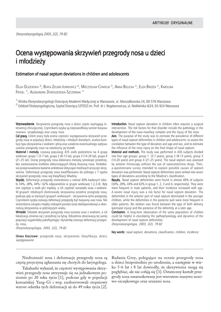Olszewska O., Zielnik-Jurkiewicz B., Chmielik M. i wsp.: Ocena wystêpowania typów skrzywieñ przegrody nosa w populacji dzieci . . . ARTYKU£ ARTYKU£YY ORYGINALNE 79 Otorynolaryngologia, 2003, 2(2), 79-82 Ocena wystêpowania skr zywieñ pr zegrody nosa u dzieci skrzywieñ przegrody i m³odzie¿y Estimation of nasal septum deviations in children and adolescents OLGA OLSZEWSKA 2/, BEATA ZIELNIK-JURKIEWICZ 2/, MIECZYS£AW CHMIELIK 1/, ANNA BIELICKA 1/, ELIZA B RO¯EK 1/, KAROLINA FRYDEL 1/, ALEKSANDRA D OROSZEWSKA-SZCZEPANIK 1/ 1/ 2/ Klinika Otorynolaryngologii Dzieciêcej Akademii Medycznej w Warszawie, ul. Marsza³kowska 24, 00-576 Warszawa Oddzia³ Otolaryngologiczny, Szpital Dizeciêcy SZPZOZ im. Prof. dr J. Bogdanowicza, ul. Niek³añska 4/24, 03-924 Warszawa Wprowadzenie Wprowadzenie. Skrzywienia przegrody nosa u dzieci czêsto wymagaj¹ interwencji chirurgicznej. Czynnikami ryzyka s¹ nieprawid³owy wzrost masywu nosowo- szczêkowego oraz urazy nosa. Cel pracy pracy.. Celem pracy by³a ocena czêstoœci wystêpowania skrzywieñ przegrody nosa w populacji dzieci, m³odzie¿y i m³odych doros³ych, analiza korelacji typu skrzywienia z wiekiem i p³ci¹ oraz ustalenie ewentualnego wp³ywu urazów przegrody nosa na ostateczny jej kszta³t. Materia³ i metody metody.. Losow¹ populacjê 435 osób podzielono na 4 grupy wiekowe: grupa 1 (3-7 lat), grupa 2 (8-13 lat), grupa 3 (14-20 lat), grupa 4 (21-25 lat). Ocenê przegrody nosa dokonano metod¹ rynoskopii przedniej, bez zastosowania œrodków obkurczaj¹cych b³onê œluzow¹ nosa. Dodatkowo przeprowadzono badanie ankietowe dotycz¹ce mo¿liwych przyczyn skrzywienia. Deformacje przegrody nosa kwalifikowano do jednego z 7 typów skrzywieñ przegrody nosa wg klasyfikacji Mladiny. Wyniki. Deformacje przegrody stwierdzono u niemal 40% badanych (oko³o 34%, 28%, 44% i 62% odpowiednio w grupie wiekowej 1,2,3,4). By³y one czêstsze u osób p³ci mêskiej, a ich czêstoœæ wzrasta³a wraz z wiekiem. W grupach m³odszych dominowa³y skrzywienia przednie przegrody nosa, podczas gdy w starszych grupach wiekowych - skrzywienia tylne przegrody. Czynnikiem ryzyka rozwoju deformacji przegrody by³ masywny uraz nosa. Nie stwierdzono zwi¹zku miêdzy rodzajem porodu (uraz oko³oporodowy) a obecnoœci¹ skrzywienia w póŸniejszym wieku. Wnioski Wnioski. Odsetek skrzywieñ przegrody nosa wzrasta wraz z wiekiem, a ich lokalizacja zmienia siê z przedniej na tyln¹. Kilkuletnia obserwacja tej samej populacji wyjaœni³aby patofizjologiê i dynamikê rozwoju deformacji przegrody nosa. Otorynolaryngologia, 2003, 2(2), 79-82 Introduction. Nasal septum deviation in children often requires a surgical intervention. The risk factors for that disorder include the pathology in the development of the naso-maxillary complex and the injury of the nose. Aim. The purpose of the study was to estimate the prevalence of different types of nasal septum deformities in children and adolescents, to assess the correlation between the type of deviation and age and sex, and to estimate the influence of the nose injury on the final shape of nasal septum. Material and methods. The study was performed in 436 subjects divided into four age groups: group 1 (3-7 years), group 2 (8-13 years), group 3 (14-20 years) and group 4 (21-25 years). The nasal septum was assessed by anterior rhinoscopy without the use of vasoconstrictive drugs. Then, a questionnaire survey intended to explain possible causes of septum deviation was performed. Nasal septum deformities were ranked into seven types of deviations according to the Mladina’s classification. Results. Nasal septum deformities were found in almost 40% of subjects (34%, 28%, 44% and 62% in group 1, 2, 3 and 4, respectively). They were more frequent in male patients, and their incidence increased with age. A severe nasal injury was a risk factor for nasal septum deviation. The deformities in the anterior part of nasal septum dominated in the younger children, while the deformities in the posterior part were more frequent in older patients. No relation was found between the type of birth delivery (perinatal injury) and the presence of the deformity at a later age. Conclusion. A long-term observation of the same population of children could be helpful in elucidating the pathophysiology and dynamics of the development of nasal septum deformities. Otorynolaryngologia, 2003, 2(2), 79-82 Key words: nasal septum, deviations, classification, children, incidence S³owa kluczowe: przegroda nosa, skrzywienie, klasyfikacja, dzieci, wystêpowanie Niedro¿noœæ nosa i deformacje przegrody nosa s¹ czêst¹ przyczyn¹ zg³aszania siê chorych do laryngologa. Takahashi wykaza³, ¿e czêstoœæ wystêpowania skrzywieñ przegrody nosa utrzymuje siê na jednakowym poziomie po 20 roku ¿ycia [1], podczas gdy w populacji koreañskiej Yang-Gi i wsp. zaobserwowali stopniowy wzrost odsetka tych deformacji a¿ do 49 roku ¿ycia [2]. Badania Grey, polegaj¹ce na ocenie przegrody nosa u dzieci bezpoœrednio po urodzeniu, a nastêpnie w wieku 5-6 lat i 8 lat dowiod³y, ¿e skrzywienia mog¹ siê pog³êbiaæ, ale nie cofaj¹ siê [3]. Ostateczny kszta³t przegrody nosa uwarunkowany jest wzrostem masywu nosowo-szczêkowego oraz urazami nosa. Otorynolaryngologia, 2003, 2(2), 79-82 80 Uraz nosa jest czynnikiem znacznie podnosz¹cym ryzyko wyst¹pienia deformacji przegrody nosa [2], a dodatkowo mo¿e prowadziæ do zahamowania wzrostu masywu nosowo-szczêkowego [4, 5]. Udowodniono, ¿e odpowiednie postêpowanie po urazie nosa znacznie ogranicza jego nastêpstwa, takie jak zmiany kszta³tu nosa oraz utrudnione oddychanie przez nos [6,7,8]. Wg Mladiny prawid³owe ukszta³towanie szczêki stanowi ochronê przed pourazowymi deformacjami szkieletu przegrody nosa [9, 10]. Niektórzy badacze podwa¿aj¹ jednak istnienie wspó³zale¿noœci wzrostu szkieletu nosa ze wzrostem œrodkowej czêœci twarzy [11]. Nie wyjaœniono dotychczas przyczyn du¿ej rozbie¿noœci czêstoœ