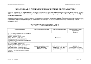 Załącznik nr 2 do protokołu z dnia 30.09.2016r. przetarg 4/2016: 22.08.2016 – 26.09.2016 KOMUNIKAT O ZAMKNIĘCIU PRAC KOMISJI PRZETARGOWEJ Uprzejmie informujemy, że został zamknięty pisemny przetarg nieograniczony nr 4/2016 ogłoszony w dniu 22.08.2016r. na najem na okres 10 lat nw. lokali użytkowych usytuowanych w Warszawie w budynkach przy ul. gen. W. Andersa 21, przy ul. Hożej 54, przy ul. Mokotowskiej 65. Skargi na czynności związane z przeprowadzeniem przetargu można składać do Burmistrza Dzielnicy Śródmieście m.st. Warszawy z siedzibą w Warszawie przy ul. Nowogrodzkiej 43, w terminie trzech dni roboczych od daty wywieszenia niniejszego komunikatu tj. w dniu: 3, 4 i 5 październik 2016r. WSTĘPNY WYNIK PRZETARGU Oznaczenie lokalu poz. 1 ul. gen. W. Andersa 21 pow. 203,03 m2 • Usytuowanie: front, parter, piwnica, antresola, wejście z ulicy • Obręb / Działka: 5-01-06 / 40 • Księga wieczysta: WA4M/00042077/1 • Minimalny roczny czynsz netto: 153.600,00 zł Nie złożono ofert poz. 2 ul. Hoża 54 pow. 81,21 m2 • Usytuowanie: front, parter, wejście z ulicy • Obręb / Działka: 5-05-01 / 153 i 151/8 • Księga wieczysta: WA4M/00039439/3 • Minimalny roczny czynsz netto: 54.600,00 zł Złożono 3 oferty, 2 oferty spełniły warunki przetargu Warszawa, dnia, 30.09.2016r. Nazwa i siedziba Oferenta Zaproponowana branża Zaproponowany roczny czynsz netto w złotych Brak ofert Organic Farma Zdrowia S. A. 02-417 Warszawa ul. Głubczycka 11/1 handlowa: Sklep z żywnością ekologiczną, wina, piwa, produkty bezglutenowe 62.400,00 zł (sześćdziesiąt dwa tysiące czterysta złotych zero groszy) Strona 1 z 2 Załącznik nr 2 do protokołu z dnia 30.09.2016r. poz. 3 ul. Mokotowska 65 pow. 26,90 m2 • Usytuowanie: front, parter, wejście z prześwitu bramy, z klatki schodowej • Obręb / Działka: 5-05-04 / 65 • Księga wieczysta: WA4M/00042169/3 • Minimalny roczny czynsz netto: 12.396,00 zł Złożono 2 oferty, 1 oferta spełniła warunki przetargu przetarg 4/2016: 22.08.2016 – 26.09.2016 Michał Szulc 92-009 Łódź ul. Bazaltowa 2/1 usługowa: studio projektowe (projektowanie odzieży) 16.798,80 zł (szesnaście tysięcy siedemset dziewięćdziesiąt osiem złotych osiemdziesiąt groszy) Wstępny wynik przetargu nie jest podstawą do zawarcia umowy najmu przedmiotowego lokalu. Przewodnicząca Komisji: Sylwia Maciejewska Członek Komisji: Krzysztof Wójcik Warszawa, dnia, 30.09.2016r. Sekretarz Komisji: Irena Anczarska Członek Komisji: Arkadiusz Kujawa Członek Komisji: Beata Bogaj Strona 2 z 2