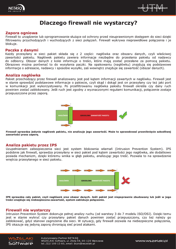 Dlaczego firewall nie wystarczy? Zapora ogniowa Firewall to urządzenie lub oprogramowanie służące od ochrony przed nieuprawnionym dostępem do sieci dzięki filtrowaniu przychodzących i wychodzących z sieci połączeń. Firewall wykrywa nieprawidłowe połączenia i je blokuje. Paczka z danymi Każdy przesyłany w sieci pakiet składa się z 2 części: nagłówka oraz obszaru danych, czyli właściwej zawartości pakietu. Nagłówek pakietu zawiera informacje niezbędne do przesłania pakietu od nadawcy do odbiorcy. Obszar danych z kolei informuje o treści, które mają zostać przesłane za pomocą pakietu. Obrazowo można porównać to do wysyłania paczki. Na opakowaniu (nagłówku) znajdują się podstawowe informacje o adresacie, nadawcy i sposobie wysyłki, zaś wewnątrz znajduje się zawartość (obszar danych). Analiza nagłówka Pakiet przechodzący przez firewall analizowany jest pod kątem informacji zawartych w nagłówku. Firewall jest w stanie sprawdzić podstawowe informacje o pakiecie, czyli skąd i dokąd jest on przesyłany czy też jaki port w komunikacji jest wykorzystywany. Po przefiltrowaniu nagłówka pakietu firewall określa czy dany ruch powinien zostać zablokowany. Jeśli ruch jest zgodny z wyznaczonymi regułami komunikacji, połączenie zostaje przepuszczone przez zaporę. Firewall sprawdza jedynie nagłówek pakietu, nie analizuje jego zawartość. Może to spowodować przeniknięcie szkodliwej zawartości przez zaporę. Analiza pakietu przez IPS Uzupełnieniem zabezpieczenia sieci jest system blokownia włamań (Intrusion Prevention System). IPS podobnie jak firewall, sprawdza przesyłany w sieci pakiet pod kątem zawartości jego nagłówka, ale dodatkowo posiada mechanizm, dzięki któremu wnika w głąb pakietu, analizując jego treść. Pozwala to na sprawdzenie wnętrza przesyłanego w sieci pakietu. IPS sprawdza cały pakiet, czyli nagłówek oraz obszar danych. Jeśli pakiet jest niepoprawnie zbudowany lub jeśli w jego treści znajduje się niebezpieczna zawartość, system zablokuje połączenie. Firewall nie wystarczy Intrusion Prevention System dokonuje pełnej analizy ruchu (od warstwy 3 do 7 modelu ISO/OSI). Dzięki temu jest w stanie wykryć czy przesyłany pakiet danych powinien zostać przepuszczony, czy też należy go zablokować, gdyż stanowi zagrożenie dla sieci. W sytuacji, gdy firewall zezwala na niebezpieczne połączenia, IPS okazuje się jedyną zaporą chroniącą sieć przed atakami.