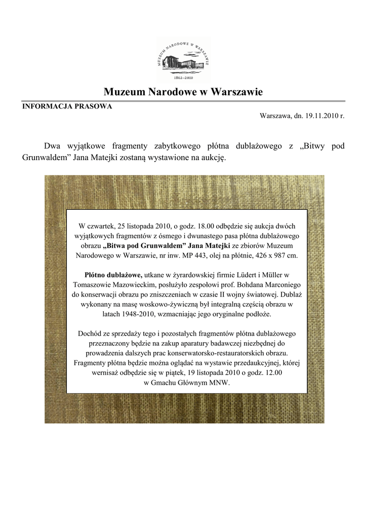 Muzeum Narodowe w Warszawie INFORMACJA PRASOWA Warszawa, dn. 19.11.2010 r. Dwa wyjątkowe fragmenty zabytkowego płótna dublażowego z „Bitwy pod Grunwaldem” Jana Matejki zostaną wystawione na aukcję. W czwartek, 25 listopada 2010, o godz. 18.00 odbędzie się aukcja dwóch wyjątkowych fragmentów z ósmego i dwunastego pasa płótna dublażowego obrazu „Bitwa pod Grunwaldem” Jana Matejki ze zbiorów Muzeum Narodowego w Warszawie, nr inw. MP 443, olej na płótnie, 426 x 987 cm. Płótno dublażowe, utkane w żyrardowskiej firmie Lüdert i Müller w Tomaszowie Mazowieckim, posłużyło zespołowi prof. Bohdana Marconiego do konserwacji obrazu po zniszczeniach w czasie II wojny światowej. Dublaż wykonany na masę woskowo-żywiczną był integralną częścią obrazu w latach 1948-2010, wzmacniając jego oryginalne podłoże. Dochód ze sprzedaży tego i pozostałych fragmentów płótna dublażowego przeznaczony będzie na zakup aparatury badawczej niezbędnej do prowadzenia dalszych prac konserwatorsko-restauratorskich obrazu. Fragmenty płótna będzie można oglądać na wystawie przedaukcyjnej, której wernisaż odbędzie się w piątek, 19 listopada 2010 o godz. 12.00 w Gmachu Głównym MNW. Muzeum Narodowe w Warszawie INFORMACJA PRASOWA Warszawa, dn. 19.11.2010 r. Jan Matejko, Bitwa pod Grunwaldem (1878), Muzeum Narodowe w Warszawie PROJEKT MATEJKO XXI ETAPY PRAC BADAWCZYCH I KONSERWATORSKORESTAURATORSKICH NAD OBRAZEM Prowadzona obecnie konserwacja jest piątą w historii obrazu, ale dopiero drugą mającą gruntowny i kompleksowy charakter. Jej wyjątkowość wyraża się w tym, że program prac konserwatorsko restauratorskich przebiega równolegle z programem badawczym. Jej nowatorskość określana jest nie tylko przez użycie najnowszej aparatury do badań w promieniach podczerwonych i prześwietleń w promieniach rentgenowskich, ale także w tym, że prace konserwatorskie odbywają się na oczach widzów. Ogromne rozmiary obrazu (42 m2) wymogły konieczność przeprowadzenia konserwacji w miejscu, w którym obraz jest eksponowany, w specjalnie do tego zaadaptowanej Sali Matejkowskiej. W połowie czerwca 2010 przystąpiono do wykonania szczegółowych badań, dzięki którym wstępnie określono stopień degradacji materiałów organicznych i stan mikrobiologiczny obrazu. 6 lipca Bitwa pod Grunwaldem, której lico zostało wcześniej zaklejone bibułą zabezpieczającą, została zdjęta ze ściany i położona na specjalnie do tego celu zbudowanym drewnianym podeście. Następnie przystąpiono do zdemontowania ramy i usunięcia metalowego blejtramu. W następnej fazie prac usunięto zespolone z oryginałem masą woskowo-żywiczną płótno dublujące, które stanowiło integralną część obrazu w latach 1948-2010. Obecnie kończą się prace nad usuwaniem spoiwa dublującego. 22 listopada 2010 zainstalowane zostaną przenośne pochłaniacze par rozpuszczalników, które umożliwiają przejście do następnego etapu prac. Po chemicznym usunięciu resztek masy dublującej z odwrocia obrazu, przeprowadzona zostanie ponowna reparacja uszkodzeń mechanicznych płótna (rozdarć i ubytków płótna). Po przeprowadzeniu wszystkich reparacji oryginalnego płótna, będzie wykonana impregnacja malowidła, a następnie nowy dublaż. Krosno obrazu wymienione zostanie na nowe - metalowe, samonaprężające się. Kolejny etap prac prowadzony będzie na licu obrazu. Zostanie ono oczyszczone, a werniksy i retusze usunięte. W miejscu starych kitów pojawią się nowe. Następnie konserwatorzy ponownie zaretuszują ubytki warstwy malarskiej. Na końcu położony będzie nowy werniks. Podsumowując, kolejne etapy programu prac konserwatorsko-restauratorskich obejmują: 1. wymianę starego dublażu na nowy (mechaniczne usunięcie płótna i spoiwa dublującego, zespolenie wszystkich licznych uszkodzeń płótna, opracowanie miejscowych wzmocnień klejonych partii, wykonanie nowego dublażu) 2. wymianę sztywnego krosna na nowe, metalowe, samonaprężające się 3. oczyszczenie lica 4. usunięcie werniksów i retuszy 5. wymianę kitów lub ich korektę 6. retusz ubytków warstwy malarskiej 7. położenie nowego werniksu. Każdy etap prac jest dokumentowany. Po raz pierwszy w historii Muzeum Narodowego w Warszawie, zwiedzający mogą śledzić na żywo tajemnicę przywracania blasku zabytkowemu dziełu malarskiemu. Kolejne odsłony prac konserwatorskich będą miały miejsce w kwietniu 2010. Prace konserwatorskie potrwają do września 2011 roku. Prace konserwatorskie finansowane są ze środków Ministerstwa Kultury i Dziedzictwa Narodowego. Mecenasem „Obchodów 600-lecia bitwy pod Grunwaldem w Muzeum Narodowym w Warszawie” jest PKN ORLEN SA. Mecenasem programu konserwacji obrazu Jana Matejki „Bitwa pod Grunwaldem” (1878) jest PKO Bank Polski.