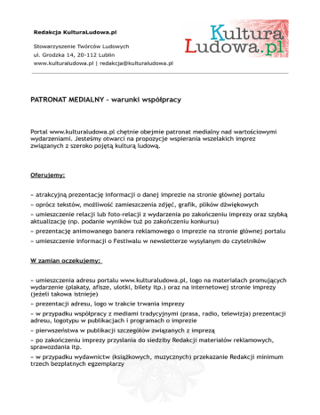 Redakcja KulturaLudowa.pl Stowarzyszenie Twórców Ludowych ul. Grodzka 14, 20-112 Lublin www.kulturaludowa.pl | [email protected] PATRONAT MEDIALNY – warunki współpracy Portal www.kulturaludowa.pl chętnie obejmie patronat medialny nad wartościowymi wydarzeniami. Jesteśmy otwarci na propozycje wspierania wszelakich imprez związanych z szeroko pojętą kulturą ludową. Oferujemy: » atrakcyjną prezentację informacji o danej imprezie na stronie głównej portalu » oprócz tekstów, możliwość zamieszczenia zdjęć, grafik, plików dźwiękowych » umieszczenie relacji lub foto-relacji z wydarzenia po zakończeniu imprezy oraz szybką aktualizację (np. podanie wyników tuż po zakończeniu konkursu) » prezentację animowanego banera reklamowego o imprezie na stronie głównej portalu » umieszczenie informacji o Festiwalu w newsletterze wysyłanym do czytelników W zamian oczekujemy: » umieszczenia adresu portalu www.kulturaludowa.pl, logo na materiałach promujących wydarzenie (plakaty, afisze, ulotki, bilety itp.) oraz na internetowej stronie imprezy (jeżeli takowa istnieje) » prezentacji adresu, logo w trakcie trwania imprezy » w przypadku współpracy z mediami tradycyjnymi (prasa, radio, telewizja) prezentacji adresu, logotypu w publikacjach i programach o imprezie » pierwszeństwa w publikacji szczegółów związanych z imprezą » po zakończeniu imprezy przysłania do siedziby Redakcji materiałów reklamowych, sprawozdania itp. » w przypadku wydawnictw (książkowych, muzycznych) przekazanie Redakcji minimum trzech bezpłatnych egzemplarzy Redakcja KulturaLudowa.pl Stowarzyszenie Twórców Ludowych ul. Grodzka 14, 20-112 Lublin www.kulturaludowa.pl | [email protected] Uwagi techniczne: Po omówieniu szczegółów współpracy, organizator zobowiązuje się dostarczyć redakcji portalu materiały informacyjne dotyczące imprezy, dokumentacja. Mogą to być wydruki, plakaty, zdjęcia itp. Wymagania: » pliki tekstowe - w formacie doc (Microsoft Word), .rtf lub .txt (środkowoeuropejski system kodowania polskich liter - ISO-8859-2) » zdjęcia - w formacie jpg » pliki graficzne - w formacie cdr (Corel 7.0 i wzwyż), gif, flash lub jpg » baner reklamowy (gif, flash, jpg) na stronie głównej - (szerokość nie może być większa niż 520 pikseli) » pliki dźwiękowe - w formacie wav lub mp3 Redakcja portalu zastrzega sobie prawo do redagowania i skracania przygotowanych materiałów. Uwagi końcowe: Szczegóły współpracy i patronatu są omawiane w każdym przypadku indywidualnie - w zależności od charakteru imprezy, organizatora, grupy docelowej, itp. Patronat oparty jest na zasadzie dobrowolności współpracy obu stron i nie pociąga za sobą żadnych zobowiązań prawnych i finansowych. Redakcja portalu nie ponosi odpowiedzialności za publikowane treści o imprezach, a za błędne lub nieaktualne informacje o imprezach odpowiadają ich organizatorzy. Redakcja portalu zastrzega w szczególnych przypadkach - prawo do nie podejmowania współpracy, bez podania przyczyn. Redakcja KulturaLudowa.pl