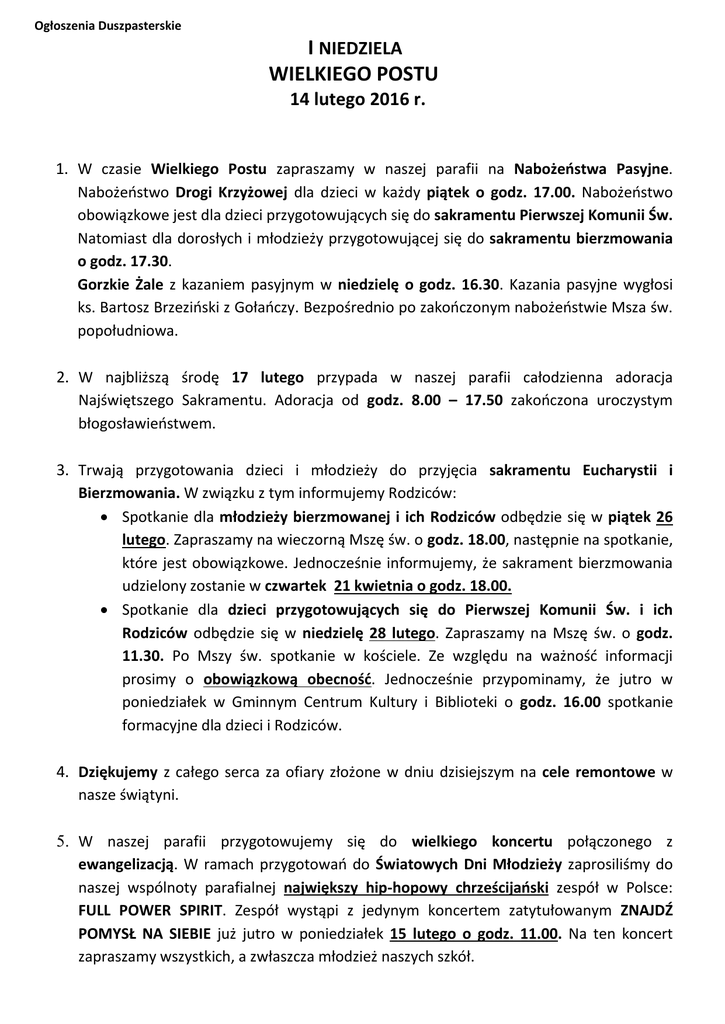 Ogłoszenia Duszpasterskie I NIEDZIELA WIELKIEGO POSTU 14 lutego 2016 r. 1. W czasie Wielkiego Postu zapraszamy w naszej parafii na Nabożeostwa Pasyjne. Nabożeostwo Drogi Krzyżowej dla dzieci w każdy piątek o godz. 17.00. Nabożeostwo obowiązkowe jest dla dzieci przygotowujących się do sakramentu Pierwszej Komunii Św. Natomiast dla dorosłych i młodzieży przygotowującej się do sakramentu bierzmowania o godz. 17.30. Gorzkie Żale z kazaniem pasyjnym w niedzielę o godz. 16.30. Kazania pasyjne wygłosi ks. Bartosz Brzezioski z Gołaoczy. Bezpośrednio po zakooczonym nabożeostwie Msza św. popołudniowa. 2. W najbliższą środę 17 lutego przypada w naszej parafii całodzienna adoracja Najświętszego Sakramentu. Adoracja od godz. 8.00 – 17.50 zakooczona uroczystym błogosławieostwem. 3. Trwają przygotowania dzieci i młodzieży do przyjęcia sakramentu Eucharystii i Bierzmowania. W związku z tym informujemy Rodziców: Spotkanie dla młodzieży bierzmowanej i ich Rodziców odbędzie się w piątek 26 lutego. Zapraszamy na wieczorną Mszę św. o godz. 18.00, następnie na spotkanie, które jest obowiązkowe. Jednocześnie informujemy, że sakrament bierzmowania udzielony zostanie w czwartek 21 kwietnia o godz. 18.00. Spotkanie dla dzieci przygotowujących się do Pierwszej Komunii Św. i ich Rodziców odbędzie się w niedzielę 28 lutego. Zapraszamy na Mszę św. o godz. 11.30. Po Mszy św. spotkanie w kościele. Ze względu na ważnośd informacji prosimy o obowiązkową obecnośd. Jednocześnie przypominamy, że jutro w poniedziałek w Gminnym Centrum Kultury i Biblioteki o godz. 16.00 spotkanie formacyjne dla dzieci i Rodziców. 4. Dziękujemy z całego serca za ofiary złożone w dniu dzisiejszym na cele remontowe w nasze świątyni. 5. W naszej parafii przygotowujemy się do wielkiego koncertu połączonego z ewangelizacją. W ramach przygotowao do Światowych Dni Młodzieży zaprosiliśmy do naszej wspólnoty parafialnej największy hip-hopowy chrześcijaoski zespół w Polsce: FULL POWER SPIRIT. Zespół wystąpi z jedynym koncertem zatytułowanym ZNAJDŹ POMYSŁ NA SIEBIE już jutro w poniedziałek 15 lutego o godz. 11.00. Na ten koncert zapraszamy wszystkich, a zwłaszcza młodzież naszych szkół. 6. Dzisiaj po każdej Mszy św. młodzież naszej parafii rozprowadza unikatową płytę CD związaną z VI wizytą Ojca Świętego Jana Pawła II w Bydgoszczy. Na płycie zatytułowanej TU ES PETRUS znajduje się ponad 20 utworów łączonych chórów i zespołów, wykonywanych w czasie wizyty Papieża oraz przesłanie Ojca Świętego z nagranym Jego głosem skierowanym do każdego z nas. Płyta w cenie 10 zł. jest cegiełką dla młodych z naszej parafii, którzy w tym roku chcą uczestniczyd w spotkaniu w Krakowie z Ojcem Świętym Franciszkiem. Do nabycia również jako cegiełka dobrowolnej ofiary większy obrazek z wizerunkiem PAPIEŻA FRANCISZKA obejmującego Jezusa w Najświętszej Postaci. Chcielibyśmy, by udało się naszej rodzinie parafialnej ufundowad dwa darmowe wyjazdy do Krakowa dla młodych z naszej parafii, którzy znajdują się w trudnej sytuacji życiowej, a chcą uczestniczyd w spotkaniu z Papieżem. Serdecznie zapraszamy po Mszy św. do włączenia się w akcję „Pomóż naszym młodym”. 7. Spotkanie dla wolontariuszy Światowych Dni Młodzieży oraz osób zainteresowanych odbędzie się w najbliższy czwartek 18 lutego. Rozpoczynamy Mszą św. o godz. 18.00. Następnie spotkanie przy herbacie na plebanii. W czasie tego spotkania zostaną przedstawione wszystkie informacje związane z wyjazdem naszej grupy młodych na spotkanie w Krakowie z Ojcem Świętym i oficjalnie rozpoczniemy zapisy na to wydarzenie. 8. Przyszła niedziela to III niedziela miesiąca, dzieo poświęcony modlitwie za młodzież, zwłaszcza młodzież przygotowującą się do Światowych Dni Młodzieży w naszej parafii i Krakowie. W czasie każdej Mszy św. nasi wolontariusze włączają się w liturgię Eucharystii. W tym dniu po każdej Mszy św. młodzież zbiera fundusze na Światowe Dni Młodzieży. Zapraszamy do wsparcia młodzieży już za tydzieo. 9. W roku jubileuszu Chrztu Polski i roku Miłosierdzia chcemy zaproponowad naszym Parafianom i wszystkim chętnym skorzystanie z pielgrzymek i wyjazdów, które przygotowujemy w okresie wiosenno-letnim. Dzisiaj prezentujemy pierwszą z nich: Największe Skarby CZECH i KOTLINY KŁODZKIEJ 22 – 24 kwietnia 2016 r. (Weekend) Zwiedzimy m.in.: Wrocław wraz z wizytą w ZOO z Afrykarium, Bardo Śląskie – Bazylika Nawiedzenia NMP, udamy się do Kudowy Zdrój, tam uzdrowisko i pogodny wieczór. Kolejny dzieo to przejazd do PRAGI i zwiedzanie cały dzieo Pragi i jej zabytków. W ostatni dzieo pojedziemy do Czernej, zwiedzimy Kaplicę Czasek jedną z największych w Europie. Udamy się także do Wambierzyc – znajduje się tam jedna z największych XVIII-wiecznych Bazylik do której prowadzą ogromne, monumentalne schody. W drodze powrotnej niespodzianką będzie uroczysta kolacja w wyjątkowym miejscu i scenerii. Koszt wyjazdu z noclegami, wyżywieniem, opieką pilota i ubezpieczeniem – 450 zł (bez biletów wstępu). Codziennie Eucharystia. Przy zapisie wpłacamy 100 zł. Podajemy: adres zamieszkania, Pesel oraz nr telefonu. Zapisy przyjmujemy do 1 marca włącznie w kancelarii parafialnej. Przy zapisie otrzymamy szczegółowy plan wyjazdu. Informacji na temat tego wyjazdu udziela ks. Marek.