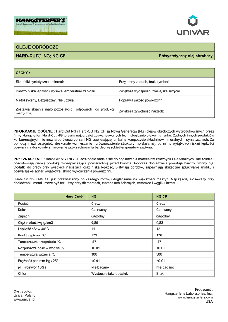 OLEJE OBRÓBCZE Półsyntetyczny olej obróbczy HARD-CUT® NG; NG CF CECHY : Składniki syntetyczne i mineralne Przyjemny zapach, brak dymienia Bardzo niska lepkość i wysoka temperature zapłonu Zwiększa wydajność, zmniejsza zużycie Nietoksyczny, Bezpieczny, Nie uczula Poprawia jakość powierzchni Zostawia skrajnie mało pozostałości, odpowiedni do produkcji medycznej. Zwiększa żywotność narzędzi INFORMACJE OGÓLNE : Hard-Cut NG i Hard-Cut NG CF są Nową Generacją (NG) olejów obróbczych wyprodukowanych przez firmę Hangsterfer. Hard-Cut NG to seria najbardziej zaawansowanych technologicznie olejów na rynku. Żadnych innych produktów konkurencyjnych nie można porównać do serii NG, zawierającej unikalną kompozycję składników mineralnych i syntetycznych. Za pomocą infuzji osiągnięto doskonałe wymieszanie i zrównoważenie struktury molekularnej, co mimo wyjątkowo niskiej lepkości pozwala na doskonałe smarowanie przy zachowaniu bardzo wysokiej temperatury zapłonu. PRZEZNACZENIE : Hard-Cut NG i NG CF doskonale nadają się do dogładzania materiałów żelaznych i nieżelaznych. Nie brudzą i pozostawiają cienką powłokę zabezpieczającą powierzchnię przed korozją. Podczas dogładzania powstaje bardzo drobny pył. Dodatki do pracy przy wysokich naciskach oraz niska lepkość, ułatwiają obróbkę, zapewniają skuteczne spłukiwanie urobku i pozwalają osiągnąć wyjątkową jakość wykończenia powierzchni. Hard-Cut NG i NG CF jest przeznaczony do każdego rodzaju dogładzania na większości maszyn. Najczęściej stosowany przy dogładzaniu metali, może być też użyty przy diamentach, materiałach ściernych, ceramice i węgliku krzemu. Hard-Cut® NG NG CF Postać Ciecz Ciecz Kolor Czerwony Czerwony Zapach Łagodny Łagodny Ciężar właściwy g/cm3 0,85 0,83 Lepkość cSt w 40°C 11 12 Punkt zapłonu °C 173 176 Temperatura krzepnięcia °C -87 -87 Rozpuszczalność w wodzie % <0.01 <0.01 Temperatura wrzenia °C 300 300 Prężność par mm Hg / 25° <0.01 <0.01 pH (roztwór 10%) Nie badano Nie badano Chlor Występuje jako dodatek Brak Dystrybutor: Univar Poland www.univar.pl Producent : Hangsterfer's Laboratories, Inc. www.hangsterfers.com USA UTRZYMANIE RUCHU : Chociaż zwykłe oleje obróbcze nie są podatne na większość problemów typowych dla płynów na bazie wody, to utrzymywanie oleju w czystości znacznie podnosi jakość i wydajność obróbki oraz żywotność oleju. Jeśli wydajność oleju zaczyna spadać, należy usunąć olej z maszyny i pozostawić w oddzielnym naczyniu przez 3-7 dni. Wióry i cięższe zanieczyszczenia będą osiadać na dnie. Po tym czasie można wlać 80% oleju z wierzchu z powrotem do maszyny. W razie obróbki materiałów ferrytycznych doskonałym rozwiązaniem jest stosowanie filtrów magnetycznych w obiegu oleju. W celu uzyskania maksymalnej żywotności oleju, nie dopuszczać do zanieczyszczenia rozpuszczalnikami, środkami myjącymi, inhibitorami korozji i innymi zanieczyszczeniami, które mogą zmieniać jego wydajność. MYCIE : Wszystkie oleje Hard-Cut opracowane są w celu skrócenia czasu mycia. Można je usuwać zarówno środkami wodnymi jak i rozpuszczalnikowymi. Hangsterfer’s zaleca używanie płynu OZONIC lub rekomendowanego środka na bazie wody. Oba środki czyszczące wykazują największą skuteczność po podgrzaniu do 60°C. Hard-Cut NG, Hard-Cut NG CF : oferowane są w opakowaniach 19,4 i 213 litrów (5 i 55 galonów) oraz pojemnikach zbiorczych 1066 lub 1279 litrów (275 lub 330 galonów). Wszystkie opakowania dystrybuowane są na całym świecie. Uwaga: Powyższe informacje zgodne są z naszą wiedzą i doświadczeniem. Zastrzegamy sobie prawo do dokonywania zmian w produktach i formulacjach. Firma Hangsterfer’s i jej autoryzowani przedstawiciele nie ponoszą odpowiedzialności za jakiekolwiek straty, szkody lub zobowiązania wynikające z użytkowania produktu w procesach produkcyjnych klienta lub w połączeniu z innymi substancjami. Klient musi przeprowadzić własne testy by zadecydować o przydatności produktu w jego procesie produkcyjnym. Karty charakterystyki produktów Hangsterfer’s są dostępne i aktualizowane sukcesywnie, klient w razie potrzeby powinien je konsultować Dystrybutor: Univar Poland www.univar.pl Producent : Hangsterfer's Laboratories, Inc. www.hangsterfers.com USA