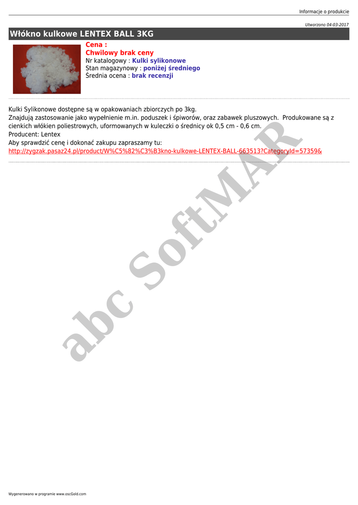 Informacje o produkcie Utworzono 04-03-2017 Włókno kulkowe LENTEX BALL 3KG Cena : Chwilowy brak ceny Nr katalogowy : Kulki sylikonowe Stan magazynowy : poniżej średniego Średnia ocena : brak recenzji ab c So ft M AR Kulki Sylikonowe dostępne są w opakowaniach zbiorczych po 3kg. Znajdują zastosowanie jako wypełnienie m.in. poduszek i śpiworów, oraz zabawek pluszowych. Produkowane są z cienkich włókien poliestrowych, uformowanych w kuleczki o średnicy ok 0,5 cm - 0,6 cm. Producent: Lentex Aby sprawdzić cenę i dokonać zakupu zapraszamy tu: http://zygzak.pasaz24.pl/product/W%C5%82%C3%B3kno-kulkowe-LENTEX-BALL-663513?CategoryId=57359& Wygenerowano w programie www.oscGold.com