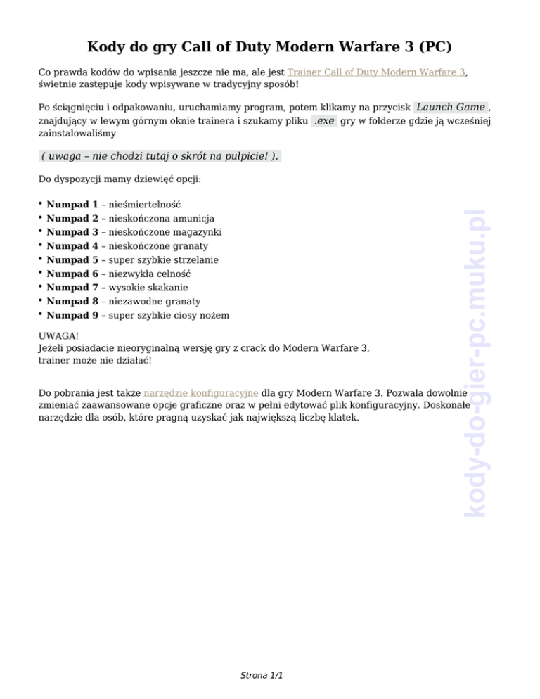 Kody do gry Call of Duty Modern Warfare 3 (PC) Co prawda kodów do wpisania jeszcze nie ma, ale jest Trainer Call of Duty Modern Warfare 3, świetnie zastępuje kody wpisywane w tradycyjny sposób! Po ściągnięciu i odpakowaniu, uruchamiamy program, potem klikamy na przycisk Launch Game , znajdujący w lewym górnym oknie trainera i szukamy pliku .exe gry w folderze gdzie ją wcześniej zainstalowaliśmy ( uwaga – nie chodzi tutaj o skrót na pulpicie! ). ● Numpad 1 – nieśmiertelność ● Numpad 2 – nieskończona amunicja ● Numpad 3 – nieskończone magazynki ● Numpad 4 – nieskończone granaty ● Numpad 5 – super szybkie strzelanie ● Numpad 6 – niezwykła celność ● Numpad 7 – wysokie skakanie ● Numpad 8 – niezawodne granaty ● Numpad 9 – super szybkie ciosy nożem UWAGA! Jeżeli posiadacie nieoryginalną wersję gry z crack do Modern Warfare 3, trainer może nie działać! kody-do-gier-pc.muku.pl Do dyspozycji mamy dziewięć opcji: Do pobrania jest także narzędzie konfiguracyjne dla gry Modern Warfare 3. Pozwala dowolnie zmieniać zaawansowane opcje graficzne oraz w pełni edytować plik konfiguracyjny. Doskonałe narzędzie dla osób, które pragną uzyskać jak największą liczbę klatek. Strona 1/1
