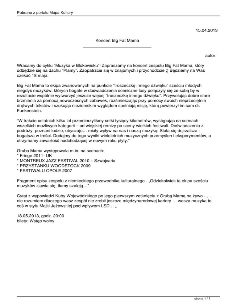 Pobrano z portalu Mapa Kultury 15.04.2013 Koncert Big Fat Mama ____________________________ autor: Wracamy do cyklu “Muzyka w Blokowisku”! Zapraszamy na koncert zespołu Big Fat Mama, który odbędzie się na dachu “Plamy”. Zaopatrzcie się w znajomych i przychodźcie ;) Będziemy na Was czekać 18 maja. Big Fat Mama to ekipa zwariowanych na punkcie “troszeczkę innego dźwięku” sześciu młodych niegdyś muzyków, których bogate w doświadczenia sceniczne losy połączyły się ze sobą by w rezultacie wspólnie wytworzyć jeszcze więcej “troszeczkę innego dźwięku”. Przywołując dobre stare brzmienia za pomocą nowoczesnych zabawek, rozśmieszając przy pomocy swoich nieprzeciętnie drętwych tekstów i szokując nieziemskim wyglądem spełniają misję, którą powierzył im sam dr. Funkenstein. “W trakcie ostatnich kilku lat przemierzyliśmy setki tysięcy kilometrów, występując na scenach wszelkich możliwych kategorii – od wiejskiej remizy po sceny wielkich festiwali. Doświadczenia z podróży, poznani ludzie, obyczaje… miały wpływ na nas i naszą muzykę. Stała się dojrzalsza i bogatsza w treści. Dodajmy do tego wyniki wieloletnich muzycznych przemyśleń i eksperymentów, a otrzymamy zawartość nadchodzącej w nowym roku płyty.” Gruba Mama występowała m.in. na scenach: * Fringe 2011- UK * MONTREUX JAZZ FESTIVAL 2010 – Szwajcaria * PRZYSTANKU WOODSTOCK 2009 * FESTIWALU OPOLE 2007 Fragment opisu zespołu z niemieckiego przewodnika kulturalnego - „Gdziekolwiek ta ekipa sześciu muzyków zjawia się, tłumy szaleją…” Cytat z wypowiedzi Kuby Wojewódzkiego po jego pierwszym zetknięciu z Grubą Mamą na żywo - „… nie rozumiem dlaczego wasz zespół nie zrobił jeszcze międzynarodowej kariery … wasza muzyka to coś w stylu Majki Jeżowskiej pod wpływem LSD… „ 18.05.2013, godz. 20:00 bilety: Wstęp wolny strona 1 / 1