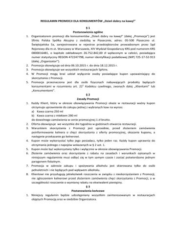 REGULAMIN PROMOCJI DLA KONSUMENTÓW „Dzień dobry na kawę!” 1. 2. 3. 4. 5. 1. 2. 3. 4. 5. 6. 7. 8. 1. §1 Postanowienia ogólne Organizatorem promocji dla konsumentów „Dzień dobry na kawę!” (dalej „Promocja”) jest Sfinks Polska Spółka Akcyjna z siedzibą w Piasecznie, adres: 05-500 Piaseczno ul. Świętojańska 5a, zarejestrowana w rejestrze przedsiębiorców prowadzonym przez Sąd Rejonowy dla m.st. Warszawy w Warszawie, XIV Wydział Gospodarczy KRS pod numerem KRS 0000016481, o kapitale zakładowym 26.752.842,00 zł wpłaconym w całości, posiadająca numer statystyczny REGON 472247798, numer identyfikacji podatkowej (NIP) 725-17-52-913 (dalej „Organizator”). Promocja obowiązuje od dnia 06.10.2015 r. do dnia 18.12.2015 r. Promocja obowiązuje we wszystkich restauracjach Sphinx. W Promocji mogą brać udział wyłącznie osoby posiadające kupon upoważniający do skorzystania z Promocji. Promocja przeznaczona jest dla osób fizycznych nabywających produkty będących konsumentami w rozumieniu art. 221 Kodeksu cywilnego, zwanych dalej „Klientami” lub „Konsumentami”. §2 Zasady Promocji Każdy Klient, który w okresie obowiązywania Promocji okaże w restauracji ważny kupon otrzymuje uprawnienie do zakupu jednej z wybranych kaw na wynos: a) Kawa czarna 250 ml b) Kawa czarna z mlekiem 290 ml do dowolnego zamówienia w cenie promocyjnej 1 zł brutto. Oferta obowiązuje we wszystkie dni tygodnia w godzinach otwarcia restauracji. Warunkiem skorzystania z Promocji jest uprzednie, przed złożeniem zamówienia poinformowanie kelnera o chęci skorzystania z oferty promocyjnej, okazanie kuponu, a następnie przekazanie go kelnerowi. Kupon może wykorzystać tylko jego posiadacz, tylko jeden raz. Każdy kupon uprawnia do otrzymania jednego z napojów wskazanych w § 2 ust. 1. Kupon może być wykorzystany tylko i wyłącznie w okresie obowiązywania Promocji. Złożenie zamówienia oraz skorzystanie z rabatu na zasadach i warunkach opisanych w niniejszym regulaminie musi odbyć się w tym samym czasie i zostać potwierdzone jednym paragonem fiskalnym. Promocja w zakresie zakupu i spożywania alkoholu jest skierowana tylko do osób pełnoletnich i nie będących pod wpływem alkoholu. Klientowi nie przysługują jakiekolwiek roszczenia w związku z nieskorzystaniem z Promocji, nie zgłoszeniem kelnerowi przed złożeniem zamówienia chęci skorzystania z Promocji, a w szczególności roszczenie o wymianę rabatu na ekwiwalent pieniężny. §3 Postanowienia końcowe Niniejszy regulamin będzie udostępniany wszystkim zainteresowanym w restauracjach objętych Promocją oraz w siedzibie Organizatora. 2. W sprawach nieuregulowanych niniejszym regulaminem stosuje się przepisy Kodeksu cywilnego oraz inne powszechnie obowiązujące przepisy prawa.