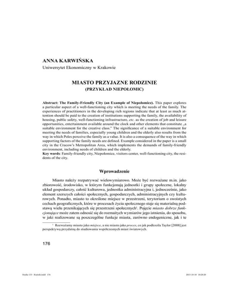 ANNA KARWIŃSKA Uniwersytet Ekonomiczny w Krakowie MIASTO PRZYJAZNE RODZINIE (PRZYKŁAD NIEPOŁOMIC) Abstract: The Family-Friendly City (an Example of Niepołomice). This paper explores a particular aspect of a well-functioning city which is meeting the needs of the family. The experiences of practitioners in the developing rich regions indicate that at least as much attention should be paid to the creation of institutions supporting the family, the availability of housing, public safety, well-functioning infrastructure, etc. as the creation of job and leisure opportunities, entertainment available around the clock and other elements that constitute „a suitable environment for the creative class.” The significance of a suitable environment for meeting the needs of families, especially young children and the elderly also results from the way in which Poles perceive the family as a value. It is also a consequence of the way in which supporting factors of the family needs are defined. Example considered in the paper is a small city in the Cracow’s Metropolitan Area, which implements the demands of family-friendly environment, including needs of children and the elderly. Key words: Family-friendly city, Niepołomice, visitors center, well-functioning city, the residents of the city. Wprowadzenie Miasto należy rozpatrywać wielowymiarowo. Może być rozważane m.in. jako zbiorowość, środowisko, w którym funkcjonują jednostki i grupy społeczne, lokalny układ gospodarczy, całość kulturowa, jednostka administracyjna i, jednocześnie, jako element szerszych całości społecznych, gospodarczych, administracyjnych czy kulturowych. Ponadto, miasto to określone miejsce w przestrzeni, terytorium o swoistych cechach geograficznych, które w procesach życia społecznego staje się materialną podstawą wielu przenikających się przestrzeni społecznych1. Pojęcie miasto dobrze funkcjonujące może zatem odnosić się do rozmaitych wymiarów jego istnienia, do sposobu, w jaki realizowane są poszczególne funkcje miasta, zarówno endogeniczne, jak i te Rozważamy miasto jako miejsce, a nie miasto jako proces, co jak podkreśla Taylor [2008] jest perspektywą przydatną do studiowania współczesnych miast światowych. 1 176 Studia 153 - Kuźnik.indd 176 2013-10-10 10:20:20 realizowane w szerszych systemach, których miasto jest częścią. W tym opracowaniu przedmiotem rozważań jest miasto jako środowisko mieszkalne, które podlega ocenie ze względu na stopień i jakość zaspokajania indywidualnych i zbiorowych potrzeb mieszkańców i użytkowników miasta, począwszy od potrzeb najbardziej podstawowych aż po potrzeby wyższego rzędu i związane z procesami samorealizacji. 1. Miasto dobrze funkcjonujące Pierwsze próby określenia (pożądanego) kształtu miasta, zarówno w wymiarze przestrzennym, jak i społecznym, podejmowane były jeszcze w czasach tworzenia pierwszych miast i kontynuowane w miarę rozwoju refleksji nad człowiekiem i środowiskiem jego funkcjonowania. Znajdujemy ich odzwierciedlenie zarówno w mitach, jak i pracach filozofów, jak chociażby w opisie Atlantydy Platona czy koncepcjach miasta powstałych w starożytnych Chinach [Granet 1973, s. 179-180 i 234-241], potem w utopiach filozofów nowożytnych. Jednak szczególny rozwój refleksji na temat sposobu organizowania przestrzeni, funkcjonowania zbiorowości i instytucji, a także zarządzania miastem nastąpił w XIX w., wraz z rozwojem miast przemysłowych. Jako środowiska mieszkalne, zwłaszcza we wczesnym okresie rozwoju przemysłu, spełniały one jedynie najskromniejsze standardy dla znacznej części swoich mieszkańców. W tym okresie powstało wiele koncepcji mniej lub bardziej utopijnych proponujących rozmaite rozwiązania społeczne i przestrzenne, najczęściej odwołujące się do modelu wioski czy małego miasteczka. Taki układ przestrzenny ułatwiał powstawanie związków między ludźmi, sąsiedzkich więzi, ważnych elementów wspólnoty. W stosunku do miasta formułujemy rozmaite oczekiwania, w zależności od tego czy rozważamy miasto przede wszystkim jako środowisko mieszkalne, czy jako ośrodek administracyjny, czy jednostkę gospodarczą itp. Jednak zawsze oczekiwania te dotyczą przestrzeni (jej sposobu zorganizowania), organizacji życia społecznego i sposobu zarządzania, cech miasta jako środowiska kulturowego, wreszcie gospodarki miejskiej. Warto w tym kontekście przypomnieć manifesty formułowane przez środowiska architektów i urbanistów, które, zaczynając od Karty Ateńskiej, ogłoszonej w 1933 r. definiowały odpowiedzialność przedstawicieli tych grup zawodowych za kształt miasta i sposób jego funkcjonowania. Kolejne „Karty” rozszerzały niejako obszar tych rozważań podejmując nowe wyzwania związane z jakością życia w środowiskach miejskich, w tym także wyzwania specyficzne dla powstających w szybkim tempie metropolii Trzeciego Świata [Kotarbiński 1985]. Kluczowym zagadnieniem jest poziom zaspokojenia potrzeb, począwszy od tych podstawowych na potrzebie samorealizacji kończąc. Rozważając tę kwestię należy wskazać uwarunkowania wpływające na możliwości zaspokajania tych potrzeb, zarówno o charakterze zewnętrznym, jak i wewnętrznym. Interesują nas przede wszystkim uwarunkowania wewnętrzne, które najogólniej można określić jako za- 177 Studia 153 - Kuźnik.indd 177 2013-10-10 10:20:35 soby (kapitały) lokalne, sposoby ich wykorzystania, realizowane zasady zarządzania miastem i in. Kolejne czynniki decydujące o możliwościach zaspokajania potrzeb mieszkańców związane są z wielkością miasta. Jednak każda z opartych na terytorium form skupienia społecznego: wieś, małe miasto, wielkie miasto czy wreszcie metropolia mają zarówno rozmaite zalety, jak wady i trudno przesądzić, odwołując się do kryteriów o charakterze funkcjonalnym, o większej adekwatności którejś z nich jako środowiska społeczno-prze
