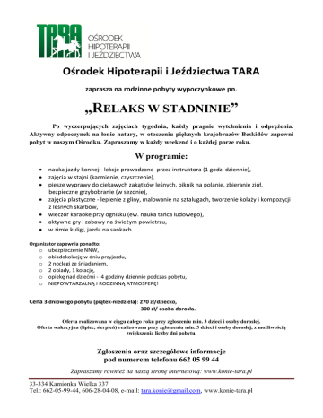 Ośrodek Hipoterapii i Jeździectwa TARA zaprasza na rodzinne pobyty wypoczynkowe pn. „RELAKS W STADNINIE” Po wyczerpujących zajęciach tygodnia, każdy pragnie wytchnienia i odprężenia. Aktywny odpoczynek na łonie natury, w otoczeniu pięknych krajobrazów Beskidów zapewni pobyt w naszym Ośrodku. Zapraszamy w każdy weekend i o każdej porze roku. W programie: nauka jazdy konnej - lekcje prowadzone przez instruktora (1 godz. dziennie), zajęcia w stajni (karmienie, czyszczenie), piesze wyprawy do ciekawych zakątków leśnych, piknik na polanie, zbieranie ziół, bezpieczne grzybobranie (w sezonie), zajęcia plastyczne - lepienie z gliny, malowanie na sztalugach, tworzenie kolaży i kompozycji z leśnych skarbów, wieczór karaoke przy ognisku (ew. nauka tańca ludowego), aktywne gry i zabawy na świeżym powietrzu, w zimie kuligi, jazda na sankach. Organizator zapewnia ponadto: o o o o o o ubezpieczenie NNW, obiadokolację w dniu przyjazdu, 2 noclegi ze śniadaniem, 2 obiady, 1 kolację, opiekę nad dziećmi - 4 godziny dziennie podczas pobytu, NIEPOWTARZALNĄ I RODZINNĄ ATMOSFERĘ! Cena 3 dniowego pobytu (piątek-niedziela): 270 zł/dziecko, 300 zł/ osoba dorosła. Oferta realizowana w ciągu całego roku przy zgłoszeniu min. 3 dzieci i osoby dorosłej. Oferta wakacyjna (lipiec, sierpień) realizowana przy zgłoszeniu min. 5 dzieci i osoby dorosłej, z możliwością zwiększenia liczby dni pobytu. Zgłoszenia oraz szczegółowe informacje pod numerem telefonu 662 05 99 44 Zapraszamy również na naszą stronę internetową: www.konie-tara.pl 33-334 Kamionka Wielka 337 Tel.: 662-05-99-44, 606-28-04-08, e-mail: [email protected], www.konie-tara.pl