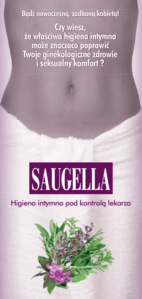 Bądź nowoczesną, zadbaną kobietą! Czy wiesz, że właściwa higiena intymna może znacząco poprawić Twoje ginekologiczne zdrowie i seksualny komfort ? Higiena intymna pod kontrolą lekarza Higiena intymna pod kontrolą lekarza Wypróbuj naturalne preparaty o bardzo delikatnej konsystencji i najbardziej optymalnym pH : Saugella Dermoliquido: Płyn do codziennej higieny intymnej Zawiera wyciąg z szałwii, kwas alfa-ketoglutarowy, kwas mlekowy, mleczne serum oraz składnik lipidowy. Tak starannie dobrany skład gwarantuje: niwelowanie przykrych zapachów i śladów na bieliźnie, codzienne poczucie świeżości i atrakcyjności oraz stałą ochronę i właściwą pielęgnację miejsc intymnych. Saugella Attiva: Płyn do higieny intymnej szczególnie polecany: • przy zagrożeniu bakteryjnymi infekcjami: profilaktyka w okresie ciąży i po porodzie, w trakcie miesiączki, w warunkach zwiększonego ryzyka infekcji (basen, fitness, plaża, itp.) • jako środek wspomagający leczenie przeciwbakteryjne i przeciwgrzybicze. Zawiera wyciąg z tymianku i z szałwii, kwas alfa-ketoglutarowy, kwas mlekowy, mleczne serum oraz składnik lipidowy. Tak dobrany skład preparatu gwarantuje właściwą ochronę przeciwbakteryjną i przeciwgrzybiczą, łagodzi podrażnienia miejsc intymnych i sprawia, że możesz w pełni cieszyć się swoją kobiecością nawet w warunkach zwiększonego ryzyka infekcji. Sposób użycia: • Przed użyciem wstrząśnij, rozcieńcz na dłoni płyn z wodą, umyj miejsca intymne, po czym dokładnie spłucz wodą. Tylko do użytku zewnętrznego. • Skuteczność udowodniona badaniami Gdzie kupić preparat? APTEKA ................................................................................................................................. ................................................................................................................................................. ................................................................................................................................................. Producent: Rottapharm S.r.l. via Valosa di Sopra 20052 Monza (MI), Włochy Dystrybutor: ACP PHARMA S.A. ul. Chełmżyńska 294, 04-458 Warszawa Czy wiesz, że właściwa higiena intymna może znacząco poprawić Twoje ginekologiczne zdrowie i seksualny komfort? www.saugella.pl